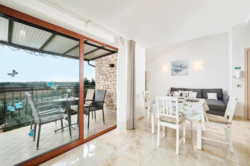 Two-bedroom, modern and equipped apartment. One room with a double bed, the other with a bunk bed. Open and airy living room, kitchen with dishwasher, bathroom with washing machine. Terrace, air conditioning, wifi, satellite TV. Swimming pool, private parking, covered barbecue. Distance from the restaurant 300 meters, distance from the beach 1300 meters