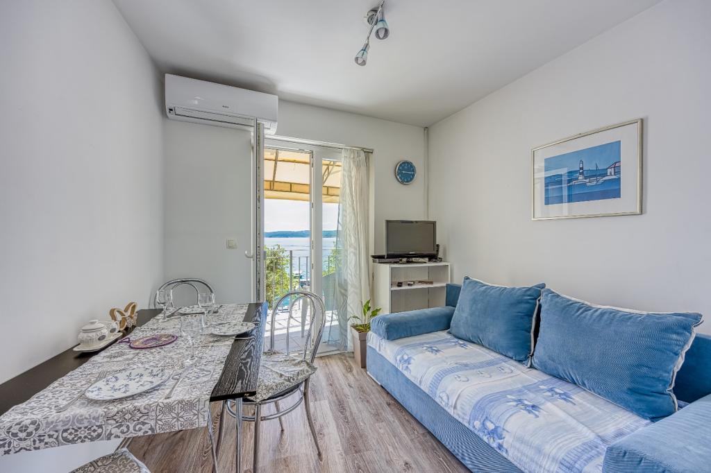 The apartment is located on the ground floor of the building, overlooking the sea, fully equipped, located first row to the sea and in the center of town. Close to all content. The apartment consists of a kitchen, a living room with a sofa bed, a bedroom, a bathroom, an entrance to the apartment with a small terrace overlooking the sea.