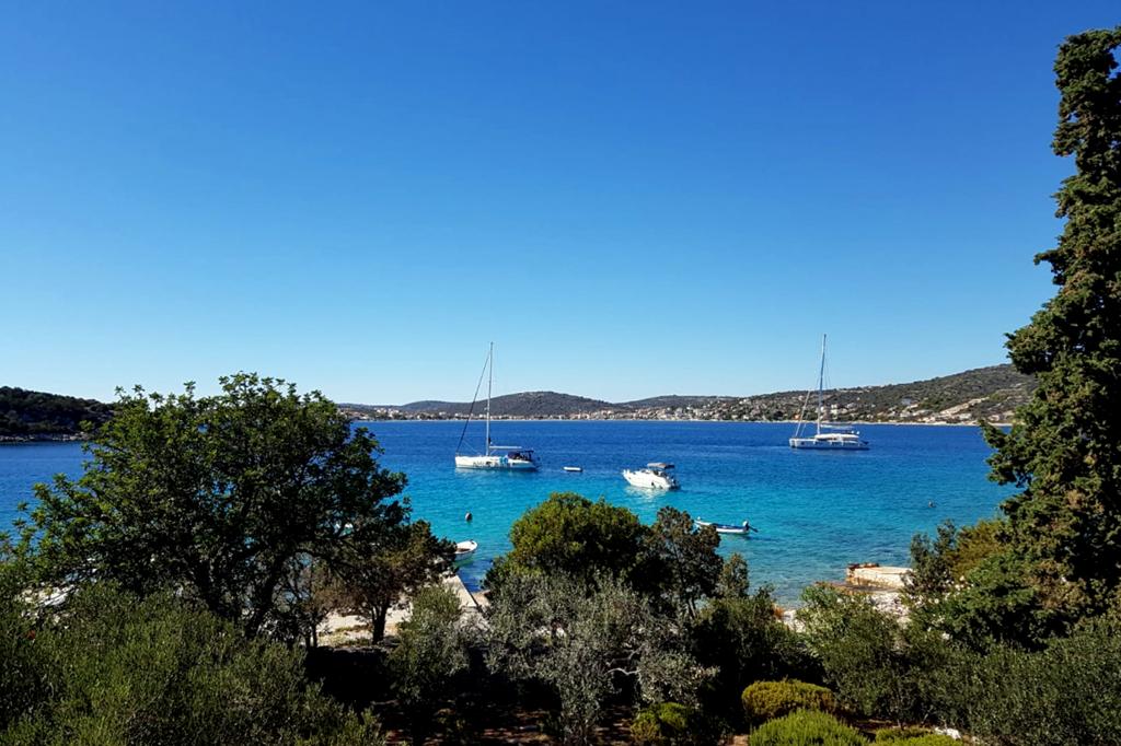 APARTMENT IN A HOUSE ON THE COAST, WITH A FANTASTIC VIEW, FAR FROM THE CROWD! Apartment Merara is located right on the seashore, in the bay of Stari Trogir between Marina and Rogoznica, Trogir and Primošten. It is far from the settlement, which ensures peace and enjoyment in the natural environment of pine trees. Access is possible by car and boat. Parking for two cars and a berth for a boat are available, as well as an additional anchorage near the house. Up to 6 guests can stay in two bedrooms and a living room. Bathroom with toilet, kitchen with dining room, fireplace with grill on a large terrace with an excellent view. The garden with Mediterranean plants is the only thing that separates the house from the sea. Although it is isolated, thanks to the solar power system and power generator, there is all the comfort you are used to: hot water, television / SAT, electricity, WiFi, etc.