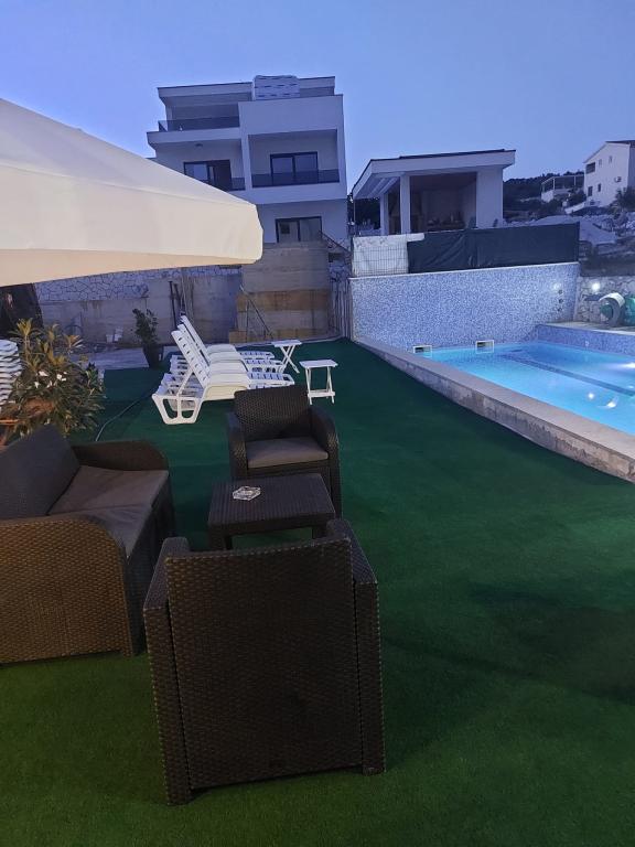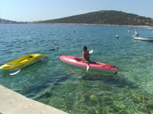 Apartments Dinko Sevid (Apartments with heated pool) consist of 7 apartments, 3 apartments with two bedrooms and 4 apartments with one bedroom and a click-clack bed in the kitchen. All apartments have a beautiful sea view, air conditioning and wifi. Apartments Dinko are 100 meters from the beach, and we offer our guests 3 kayaks and 3 paddle boats for free use. Also, our guests can enjoy swimming in the heated pool and two outdoor barbecues. Sevid will enchant you with its crystal clear sea and untouched nature. Sevid is a small tourist town (45 km from Split and Šibenik, 20 km from Trogir (a city under UNESCO protection), 19 km from Primošten, 12 km from Rogoznica, 55 km from the Krka National Park). Apartments Dinko are an excellent choice for anyone who wants a peaceful vacation away from the city noise and crowds. Kind hosts will make your stay even more pleasant and beautiful.