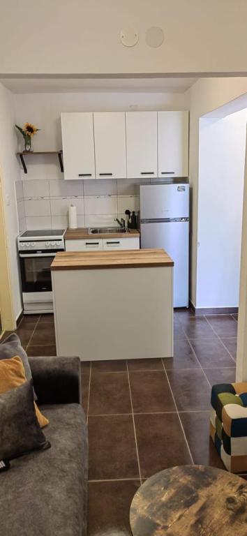 New apartments on the ground floor and on the floor of the house with one or two bedrooms and associated premises. The ground floor is a spacious garden with olive trees in which is a large barbecue on the use of guests. From the blue apartment, upstairs from both rooms open onto a spacious terrace overlooking the place. One bedroom apartment is also on the third floor, one bedroom on the ground floor.