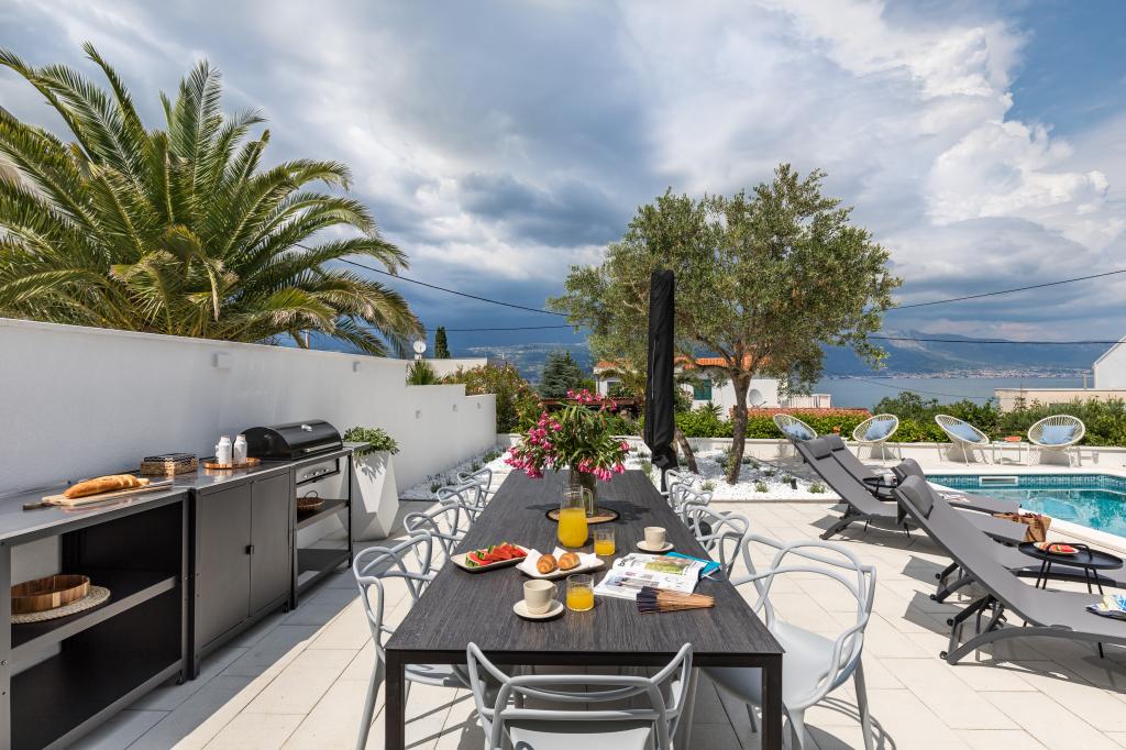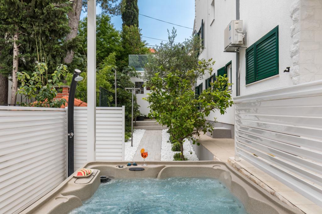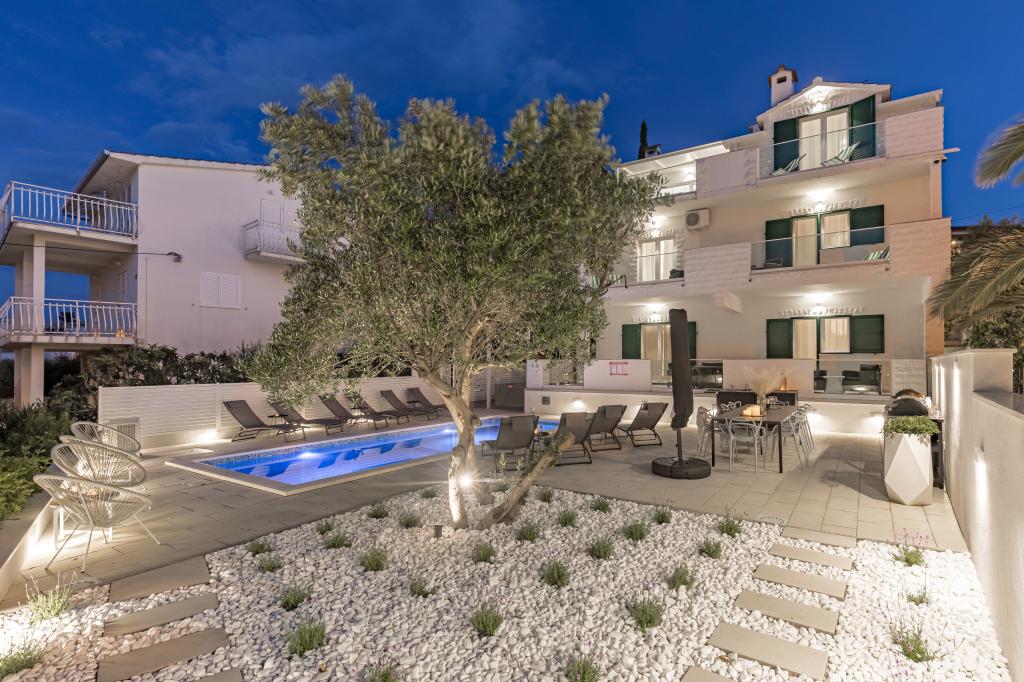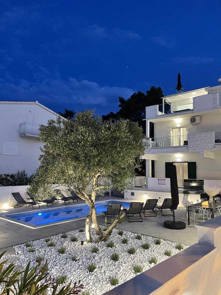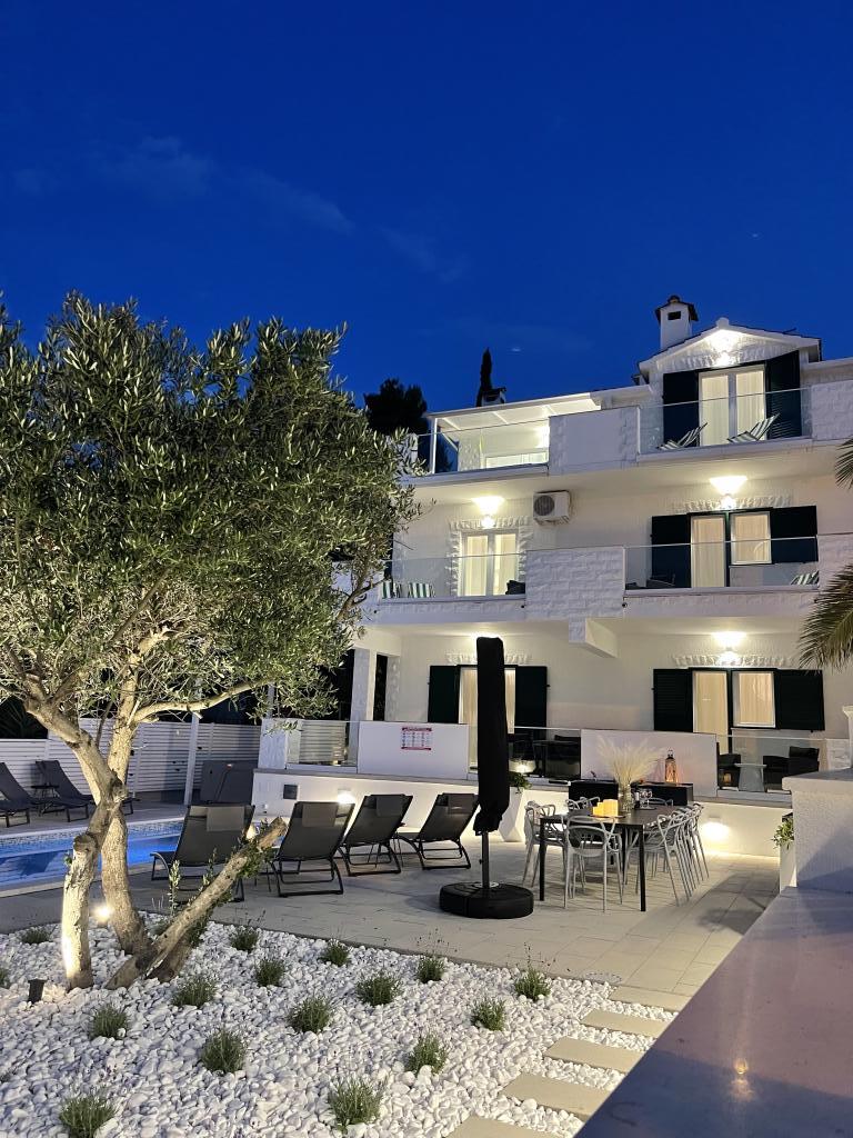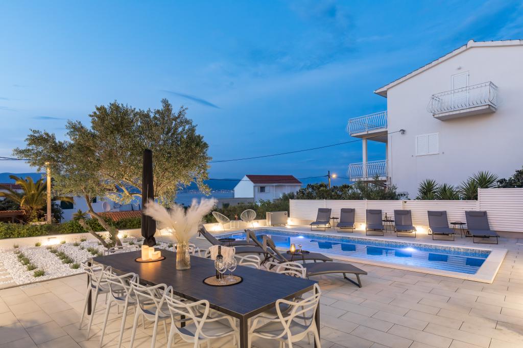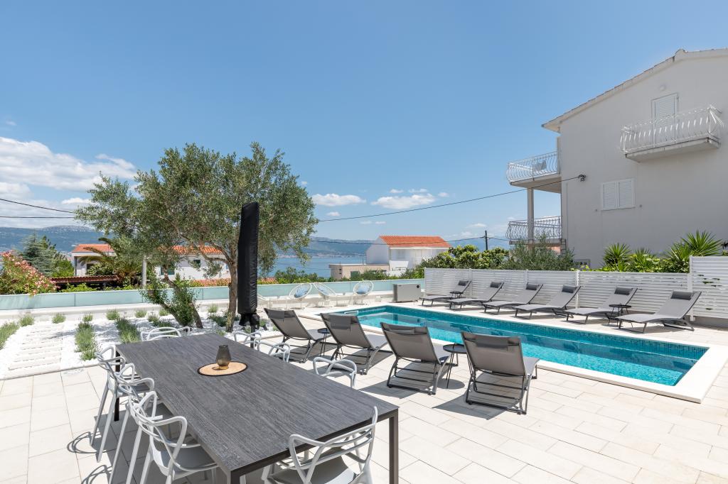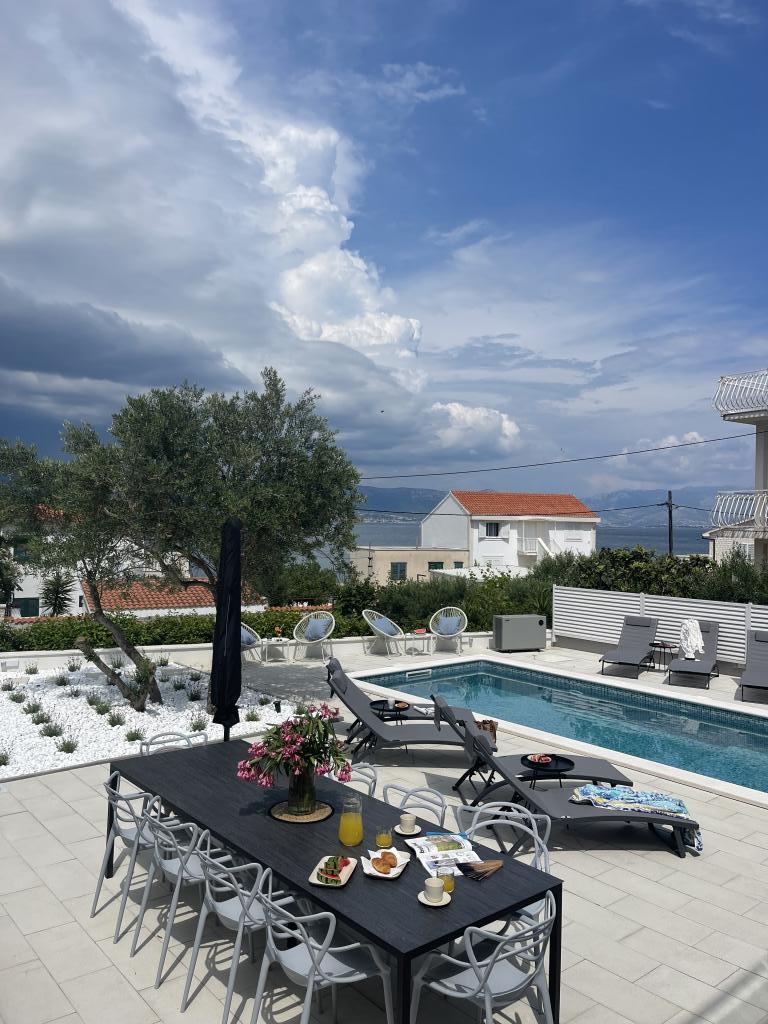 Residential tax is not included in price.We have just returned from our summer resort Slatine. To avoid the "crazy crowds" on the Croatian highway and at the toll booths, we had to cut our annual vacation short by one day and set off again on Friday. It was a heavy heart because we were all very happy with this wonderful accommodation. There were 5 adults and 3 children in apartments A and E. Everything is beautifully newly furnished, large rooms so that everyone can enjoy their privacy. Great pool and also a massage tub. A nice table with comfortable armchairs and also enough lounge chairs. Next to the pool there is a small outdoor kitchen with 2 charcoal grills. The beach is 2 minutes away, with white pebbles and therefore ideal for children and the elderly. It is not crowded. The apartments are occupied by friendly guests and there are enough parking spaces available. All in all, everything you could wish for for a great holiday, apart from the traffic jams - but there is also Split airport directly opposite on the mainland. Anyway, thank you to Marina for our lovely stay. The Schumich family from Austria