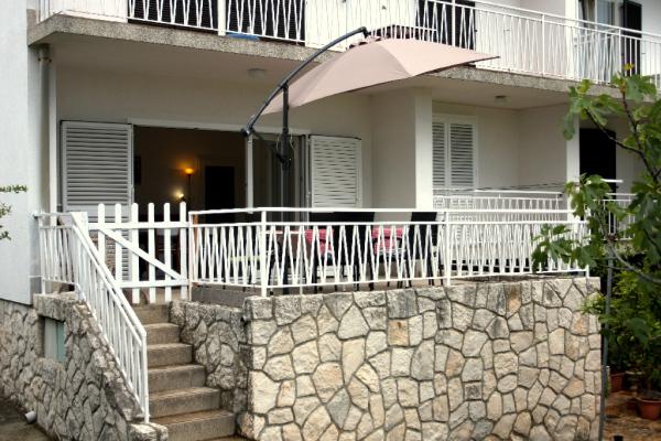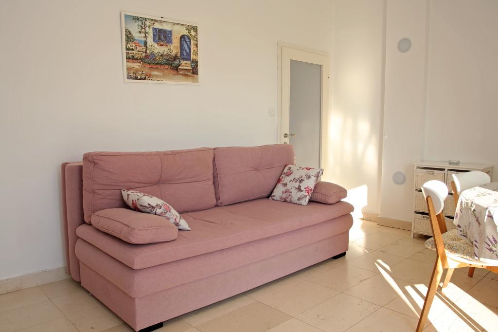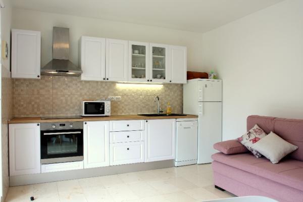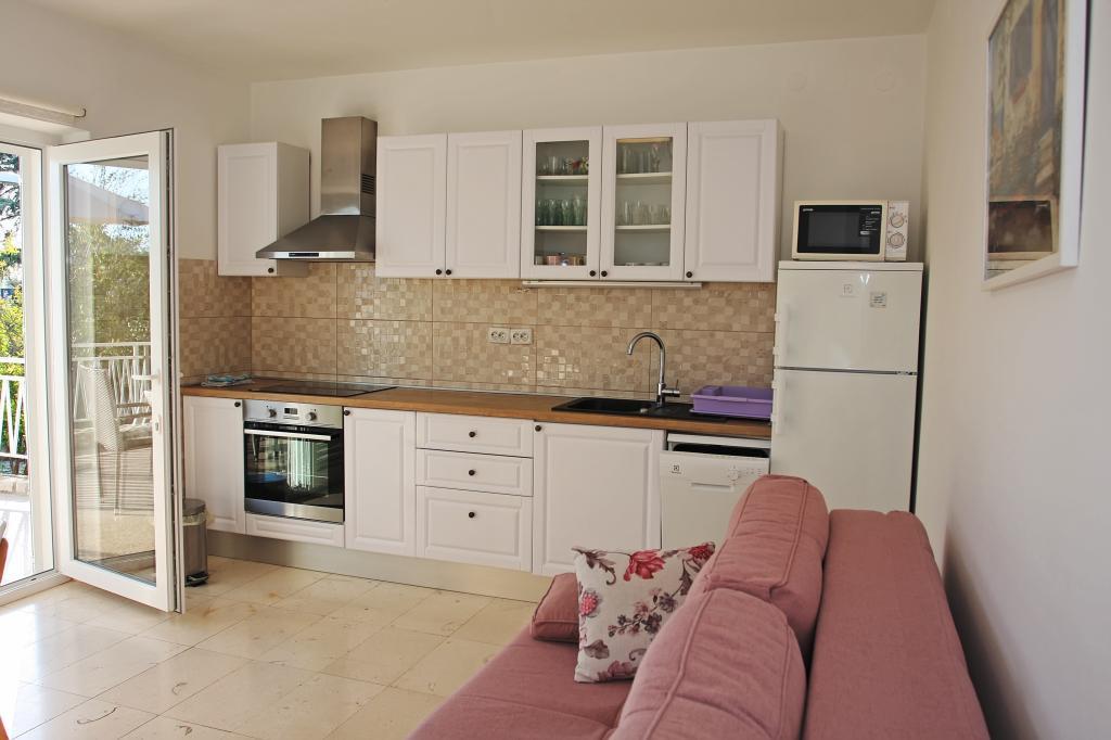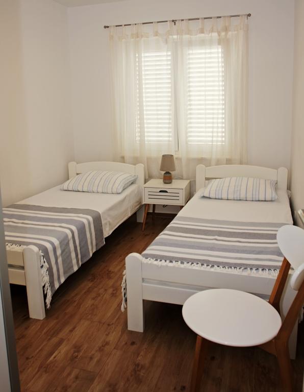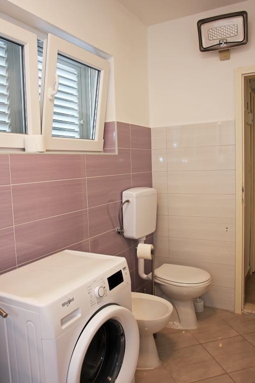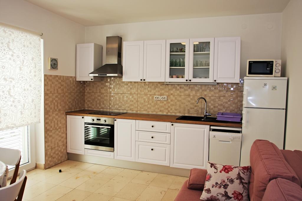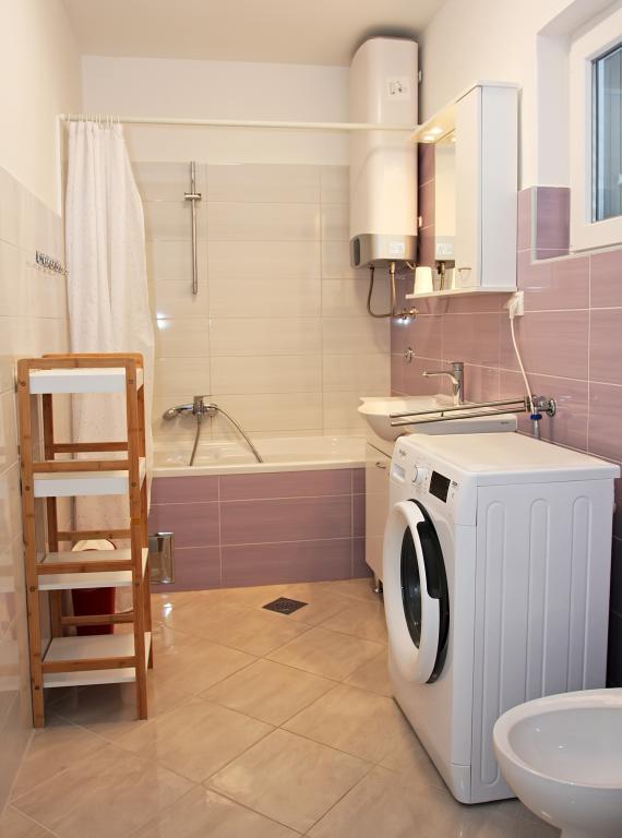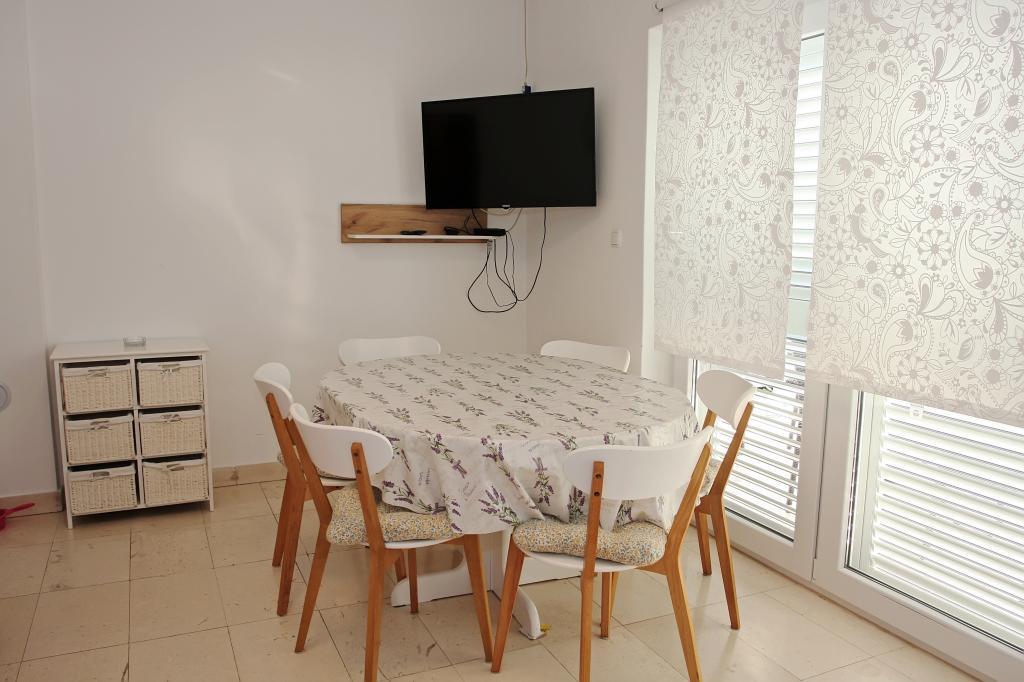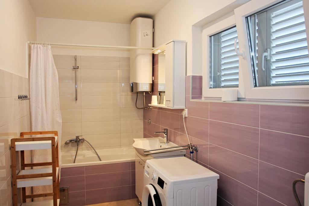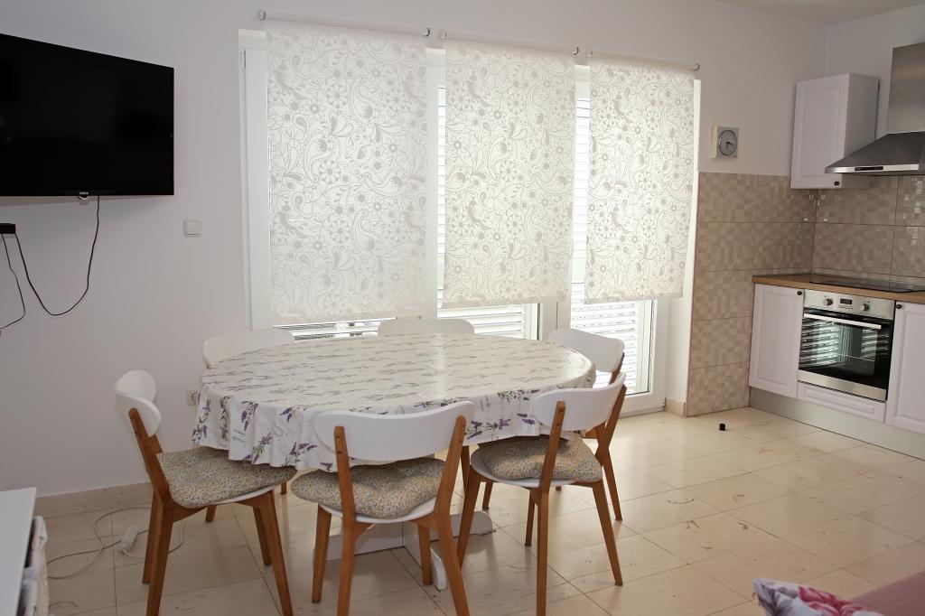 Newly built three-room apartment on the ground floor, first row to the sea. The apartment consists of a kitchen with dining room and living room, three bedrooms, two bathrooms with toilets, another separate toilet, also has a large terrace and another balcony. Two bedrooms have double beds and one has two separate beds. In the living room there is a three seater that stretches into a bed for two persons. The kitchen is equipped with dishwasher, microwave, oven, refrigerator with freezer. One bathroom has a washing machine. There are two parking spaces in the yard, and guests have barbecue facilities. The beach is located right in front of the house.