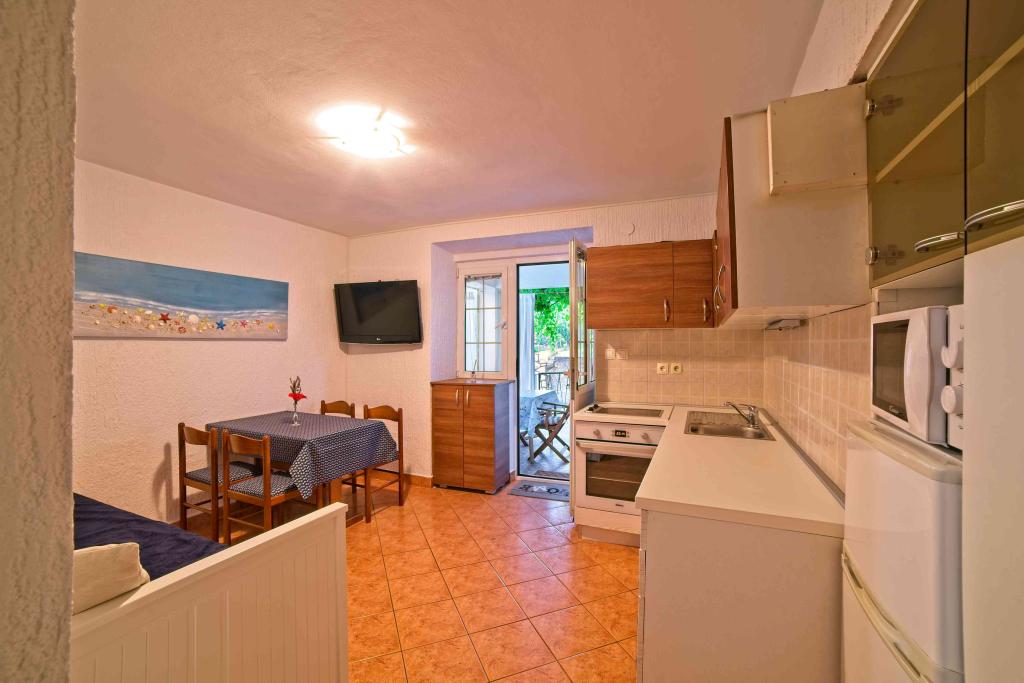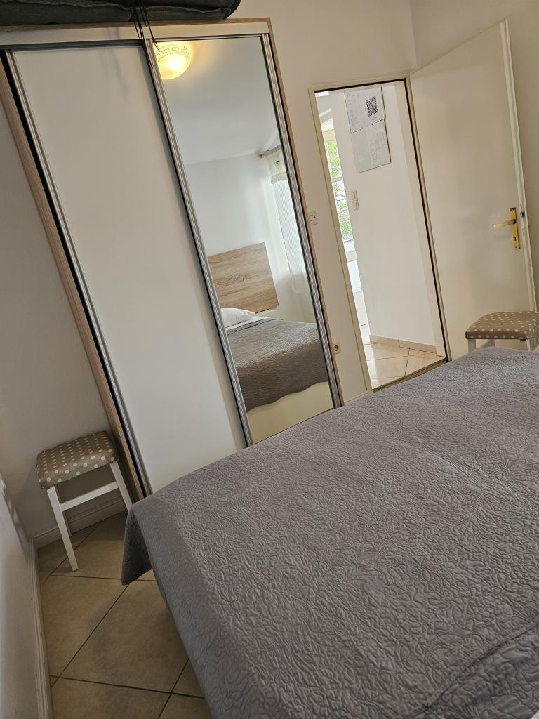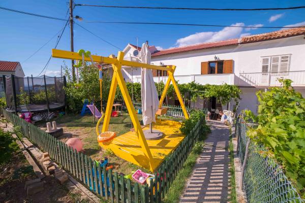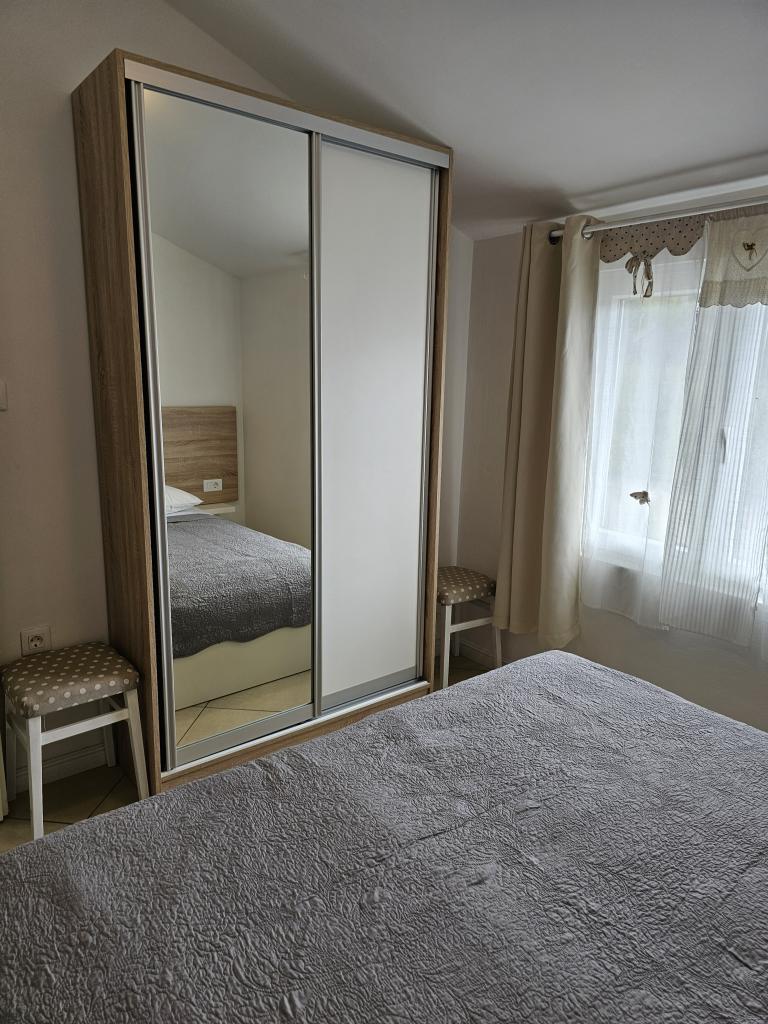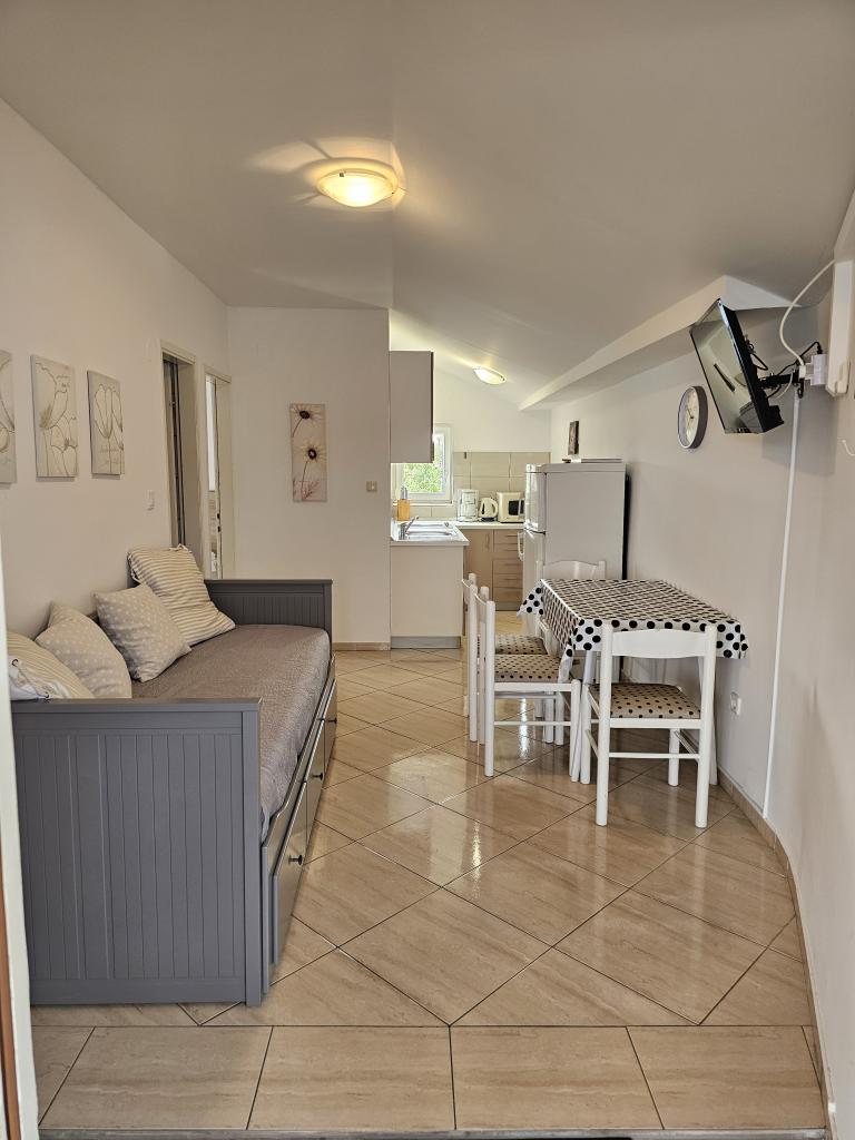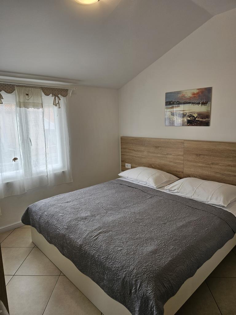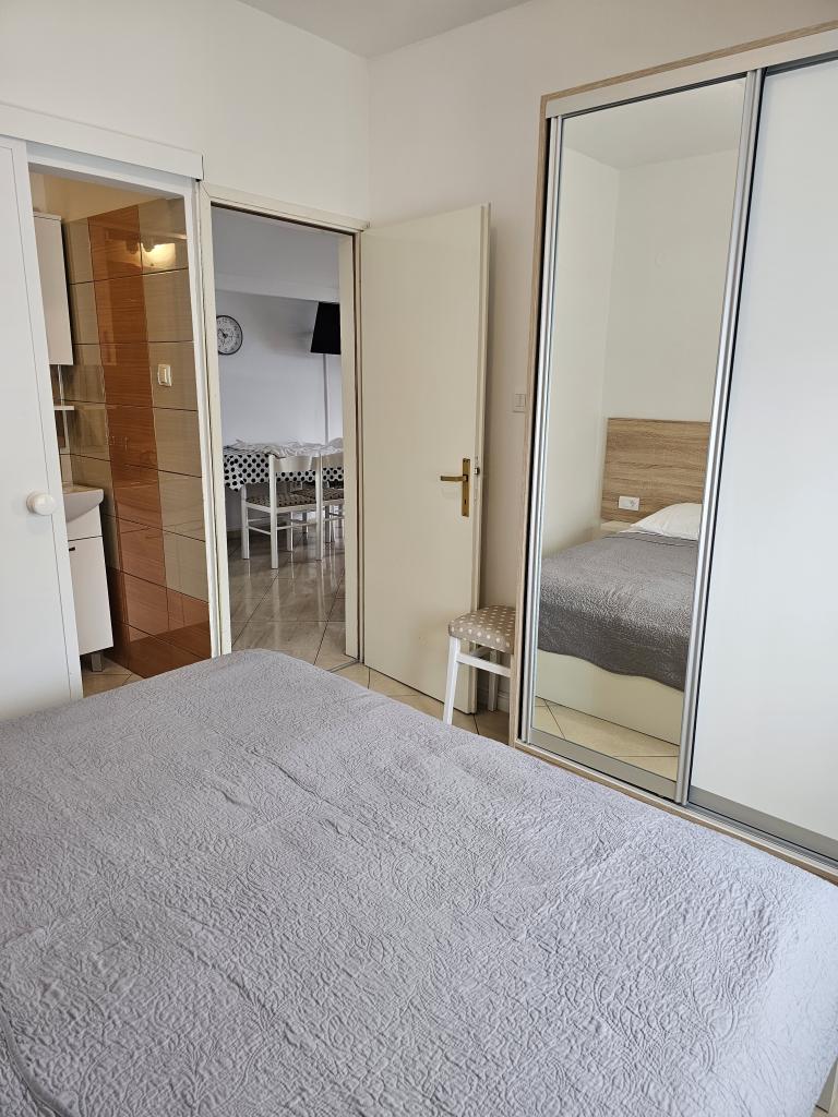 We spent a week there until two families. A total of four adults and four children aged 4 to 11 years. Apartment very well equipped, clean, nice, great location. Two fantastic terraces. Next to the sea with a sandy bottom and shallow, so the kids could safely play around August even 50m from the shore. Shop next to the most needed things, and some kilometers further larger market. At the seaside bar and restaurant, so you can eat something during the day. I highly recommend!