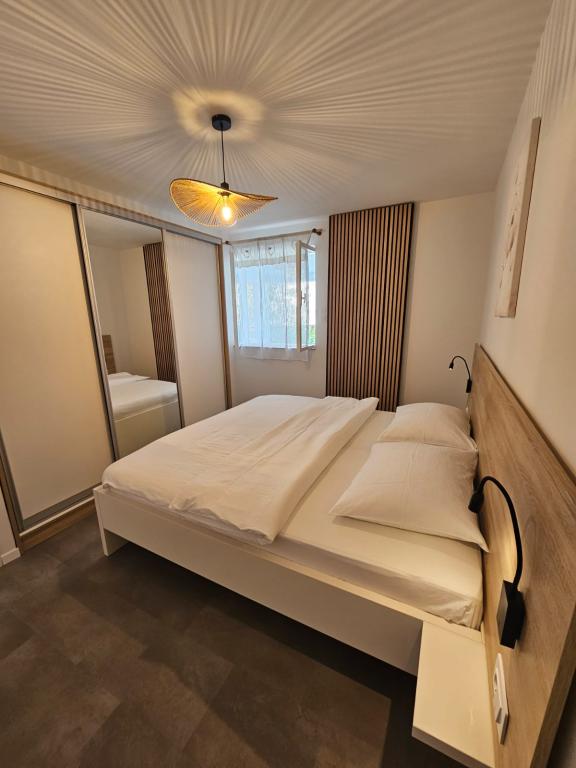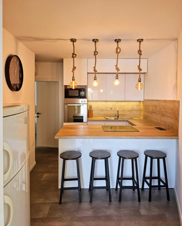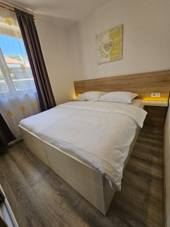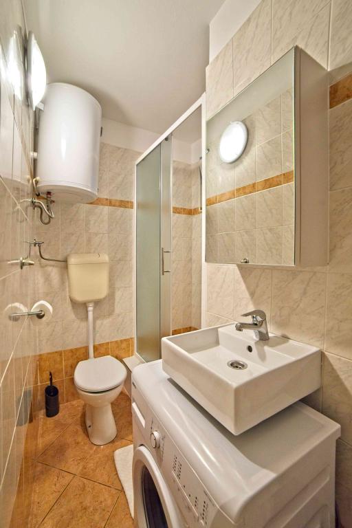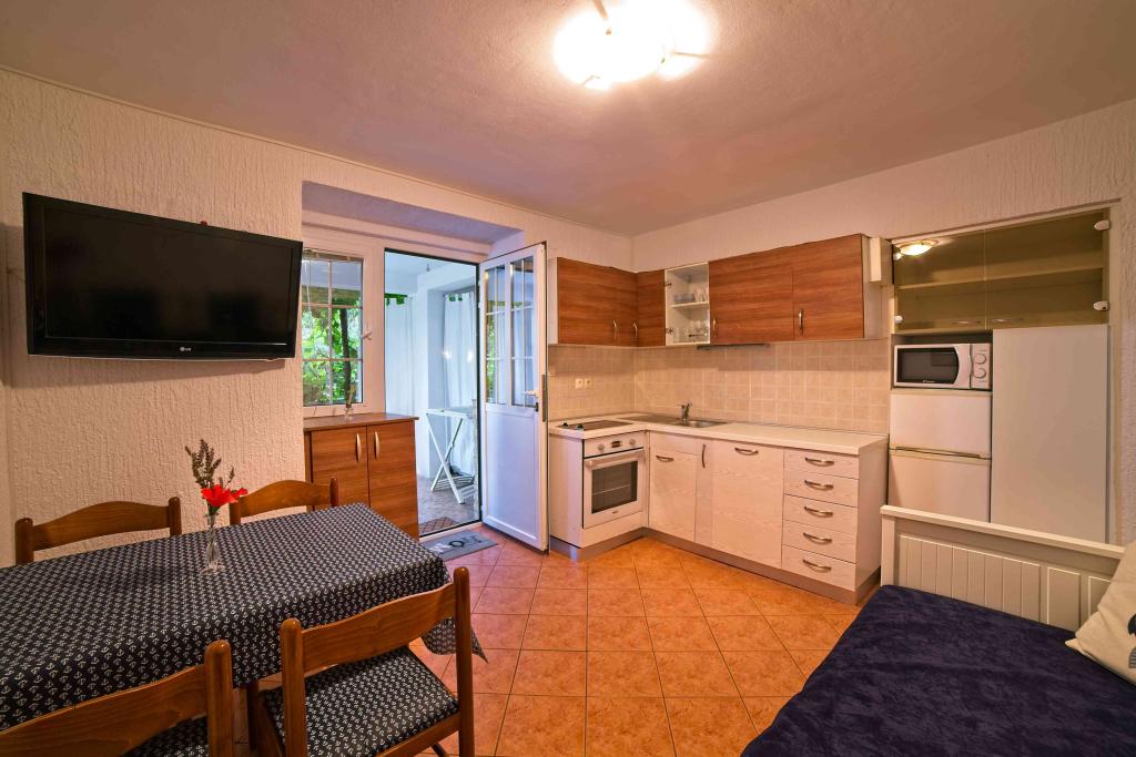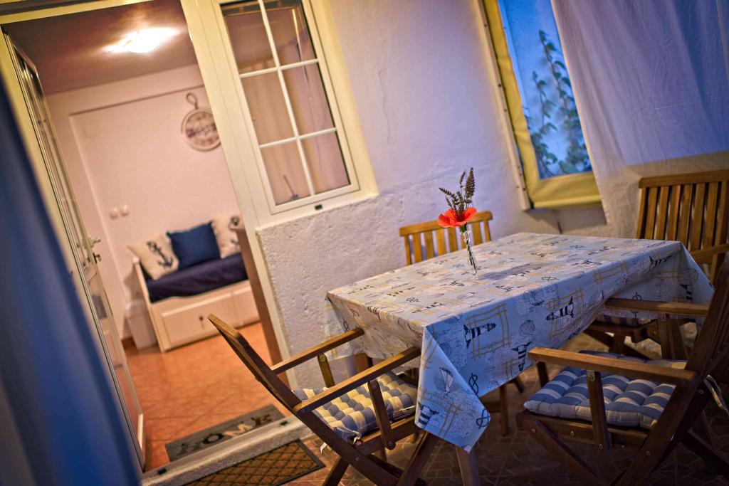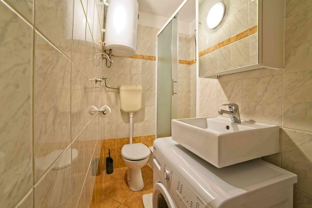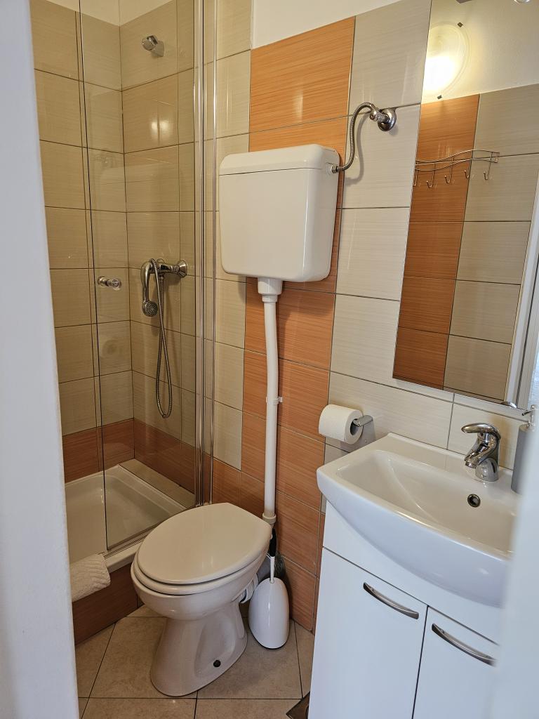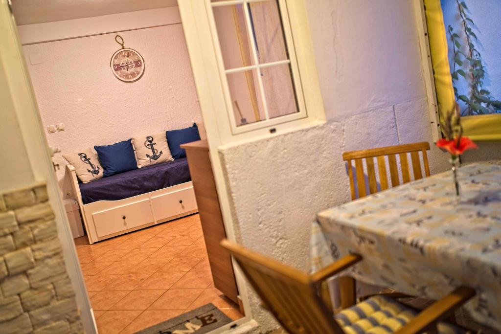 We spent a week there until two families. A total of four adults and four children aged 4 to 11 years. Apartment very well equipped, clean, nice, great location. Two fantastic terraces. Next to the sea with a sandy bottom and shallow, so the kids could safely play around August even 50m from the shore. Shop next to the most needed things, and some kilometers further larger market. At the seaside bar and restaurant, so you can eat something during the day. I highly recommend!