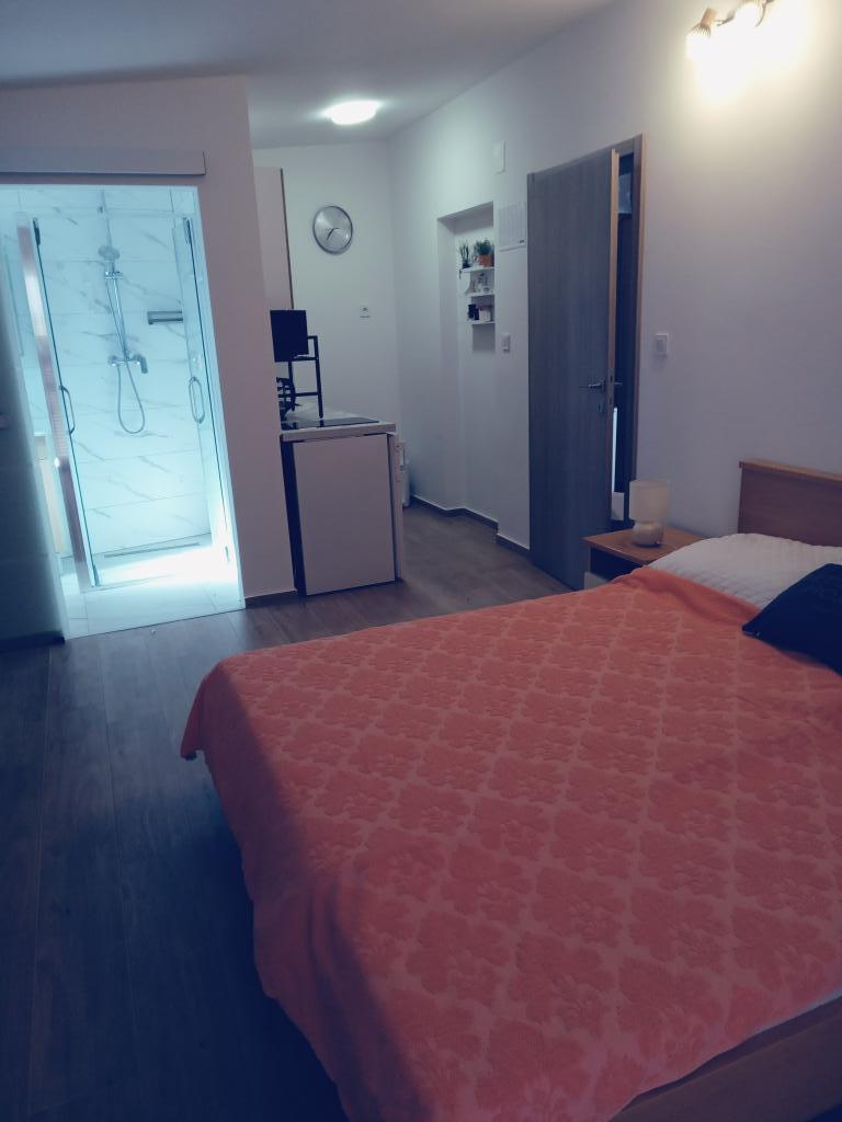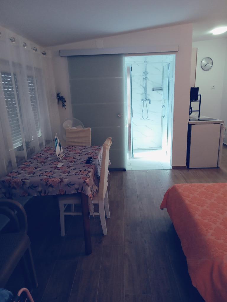 Welcome! Fully furnished and equipped apartment for two people. 200 m from the sea and beach and 200m from the center. The apartment has a kitchen, bathroom, bedroom and balcony. TV, satellite, air conditioning, wi-fi, microwave, coffee maker. Courtyard in front of the building, parking with closed doors and a furnished garden and terrace in front of the building where you can drink coffee as a welcome on the first day of arrival in the apartment. In front of the building in the yard there is a grill that all our guests from the apartment can use.