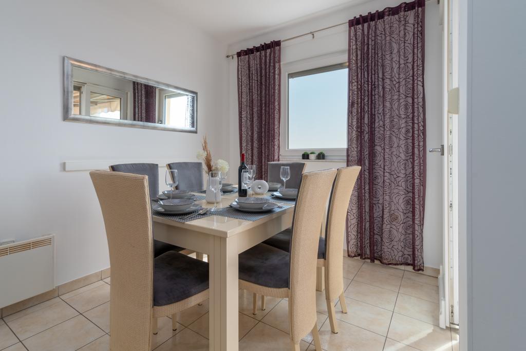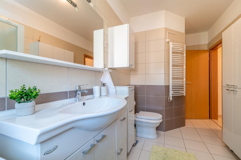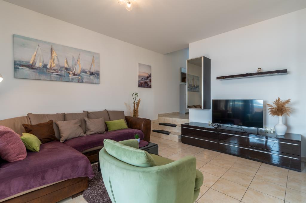 The newly renovated apartment Anđela for 5 people is located in Saldun bay on the island of Čiovo, connected by two bridges. The apartment consists of 2 bedrooms, two bathrooms, a kitchen, a living room and a balcony with a beautiful view of the sea. It is 900 m or a 10-minute walk from the center of the Old Town of Trogir, which is protected by UNESCO, 7 km from Split Airport and 1.5 km from the Trogir bus station.