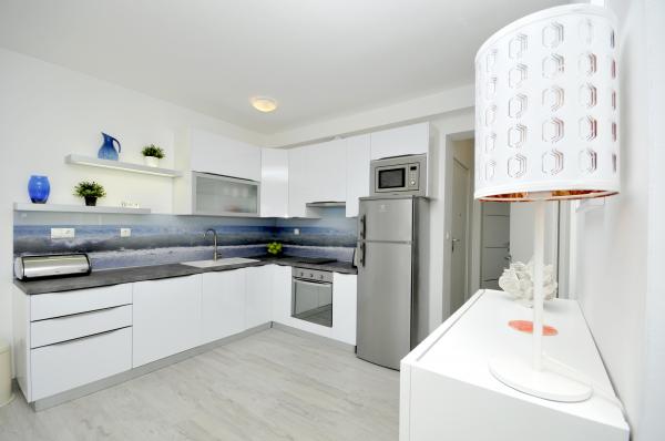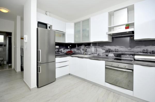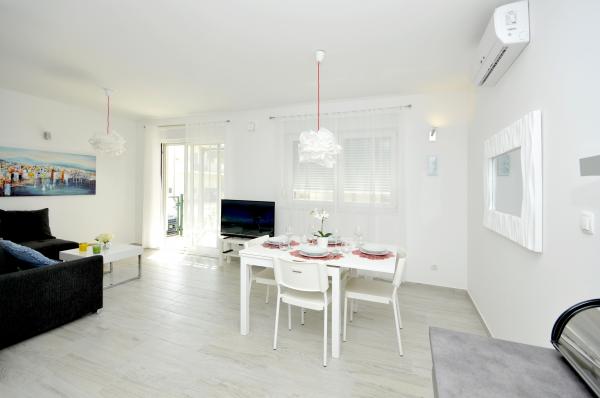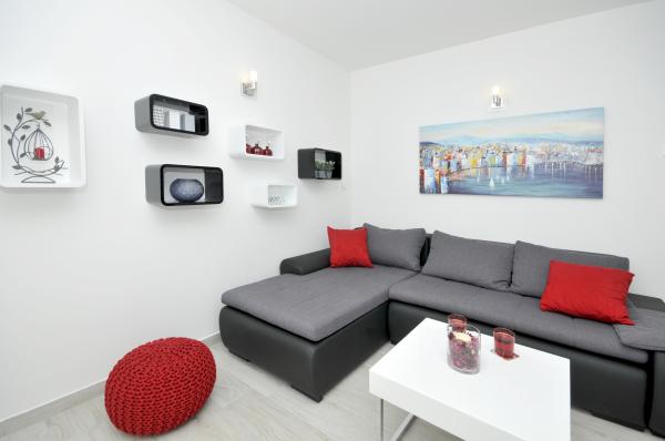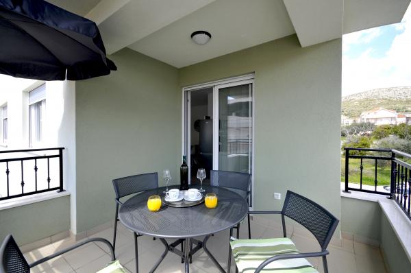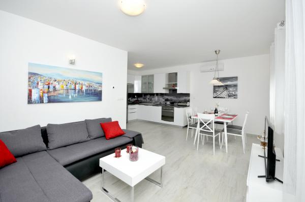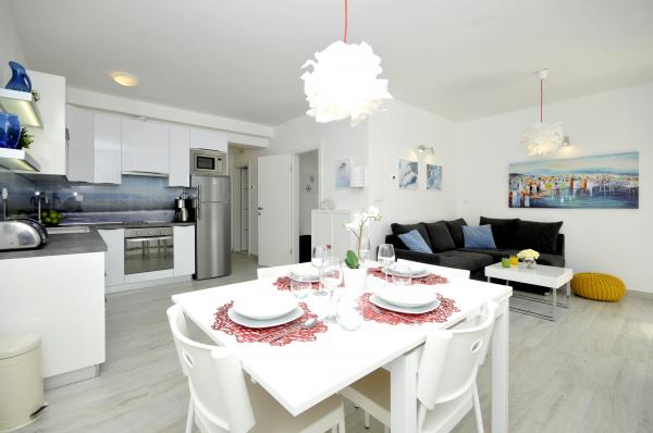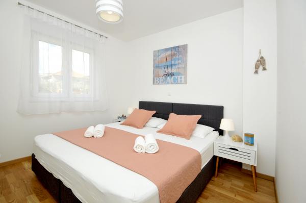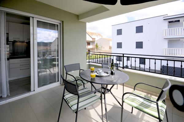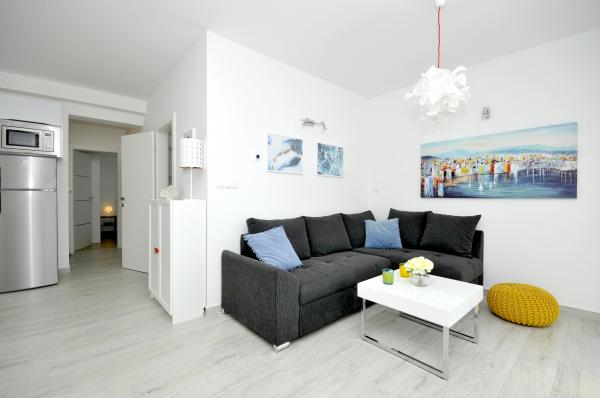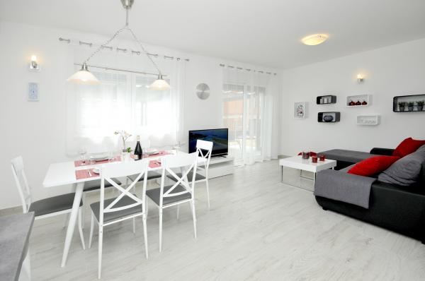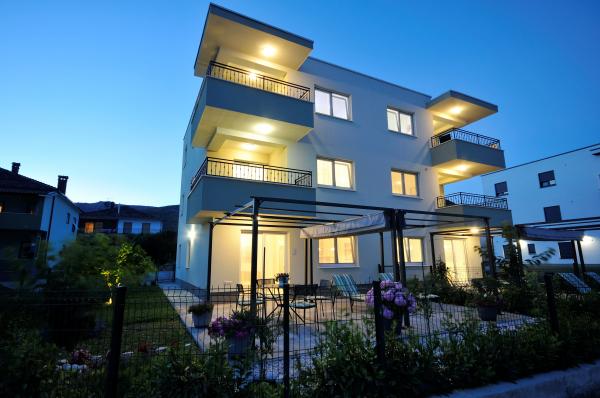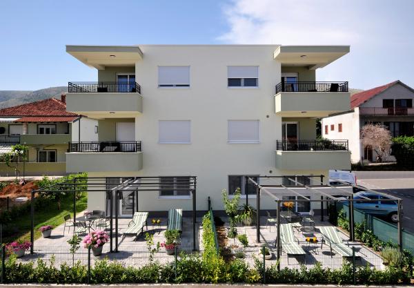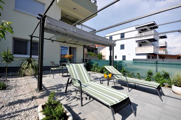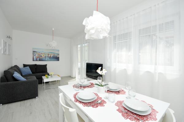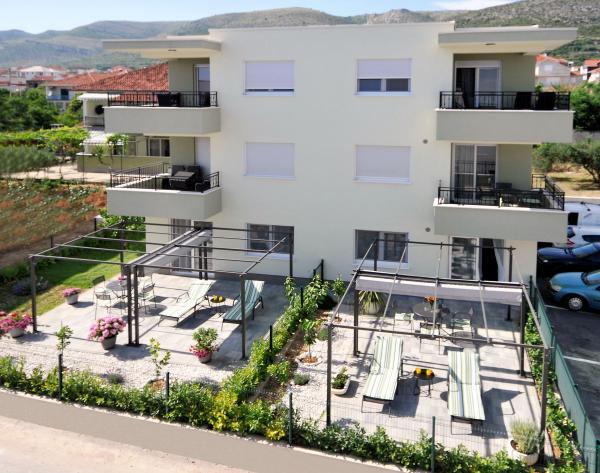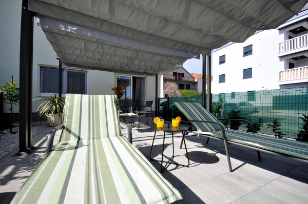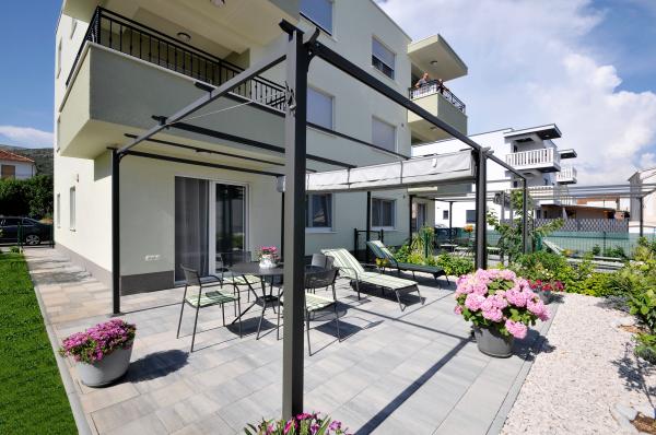 Town Trogir Apartments are located on the mainland of Trogir in a prime location, just 400 m from the old town center and 900 m from the new town beach. The beach can be reached by a promenade along the sea. All main facilities are within walking distance, a 5 to 10-minute walk. Town Trogir Apartments are new and located in a small residential building with 6 apartments. The apartments have an area of 50 to 60 m2. The apartments are located on the ground floor. The apartments are modernly decorated and fully equipped. The apartments have 2 bedrooms, a living room with a dining room, a fully furnished kitchen, a bathroom, and a large terrace with garden furniture on the ground floor. Free parking is provided in front of the building. Bed linen and towels are included. WiFi is free. Tourist tax is included in the price.