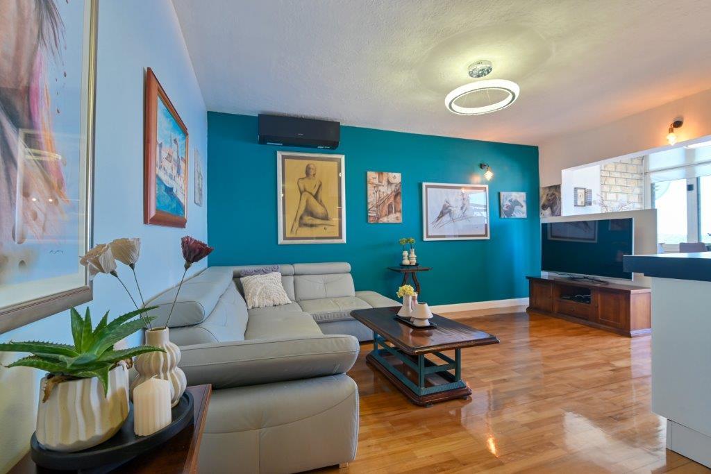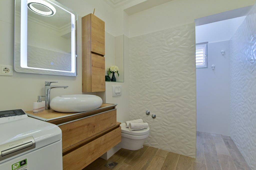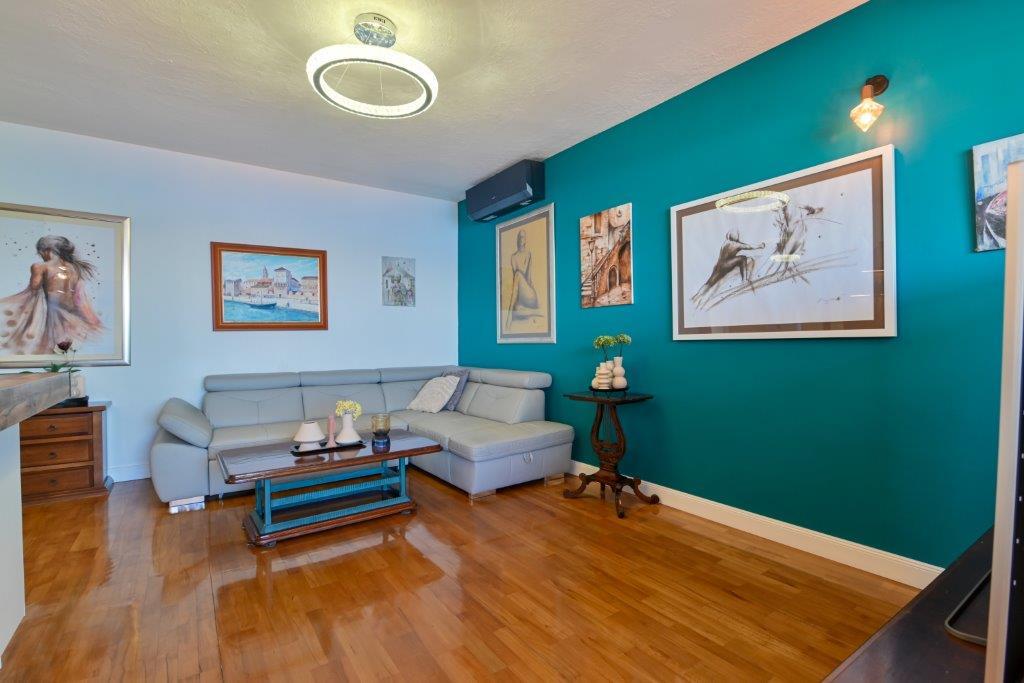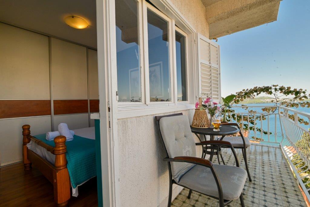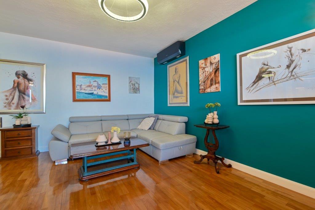 This is a house with tekskluzivna apartments. It is located in an attractive area of the city. The south side of the island Ciovo (connected by bridge to the shore and the beautiful town of Trogir (UNESCO)). The house is located in Mirnyi neighborhood, away from the sea (beach with pine trees), some 200m from the attractive town beach in Okrug Gornji about 700m. Distance from restaurants and shops was completed 150m, hospital, post office and all facilities are located in the city center which is located about 15 minutes. walking and some 5 km from the airport Split (offered transportation from the airport by prior agreement with the owners). The house has two apartments. Each is fully equipped and have a wonderful view of the sea. One is categorized with 4 stars. It is located on the ground floor has a terrace and two balconies. 2 bedrooms, living room with sofa bed, dining area and kitchen and 2 bathrooms. Equipped with a fully (air conditioning, Wi-Fi, satellite TV, washing machine, all kitchen appliances, private parking ... a. The second is categorized with 3 stars. He is the first