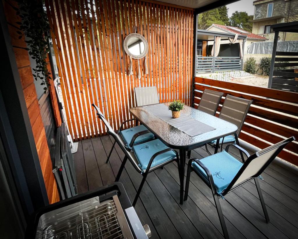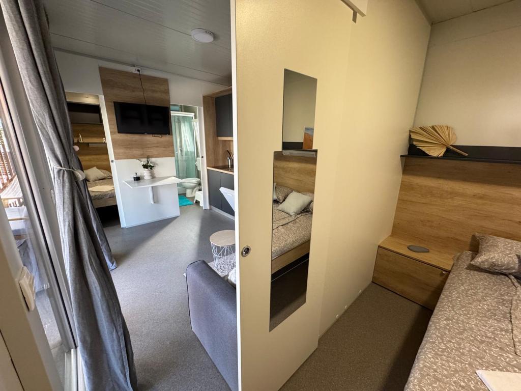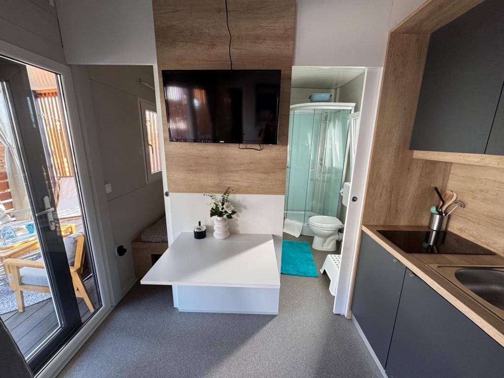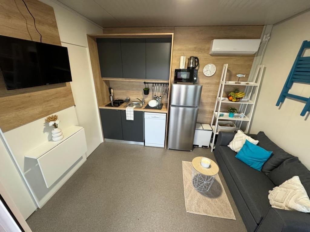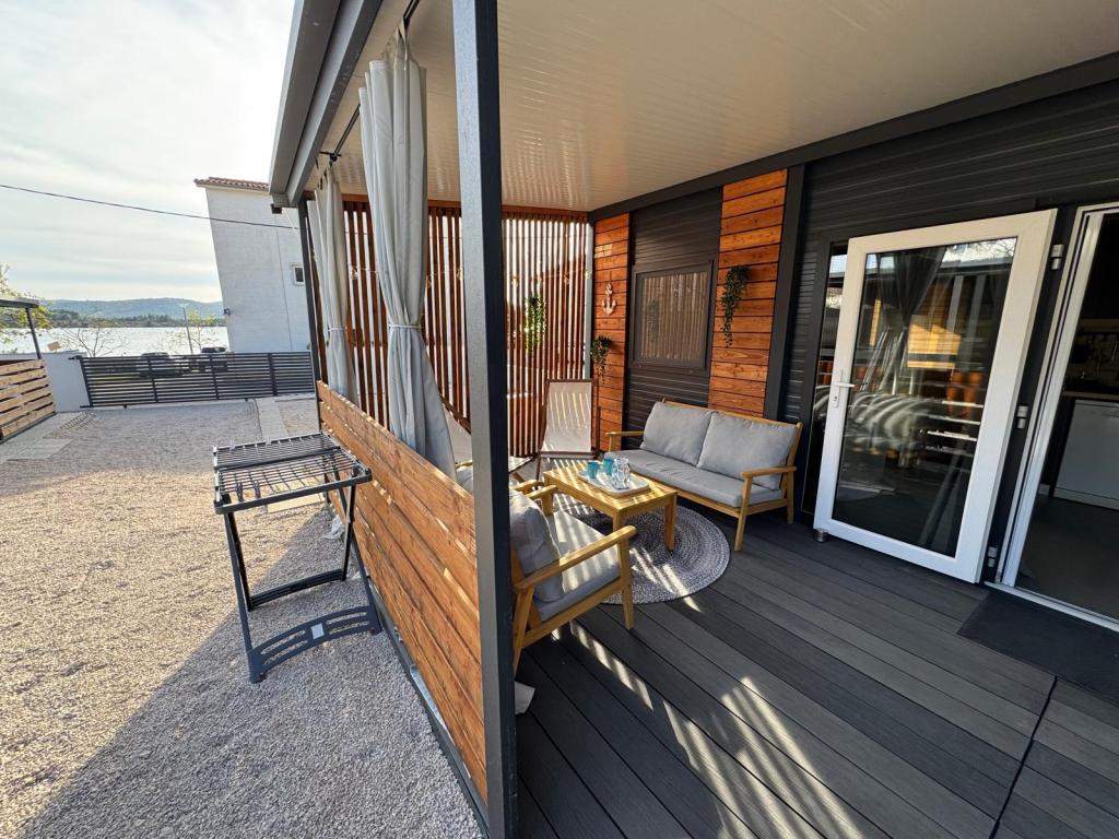 Our Marea mobile homes are designed to make your vacation carefree, comfortable and filled with moments of relaxation. Each home is carefully decorated and fully equipped for a pleasant stay for families or couples looking for privacy, peace and all the amenities of a modern home by the sea. They are located in a small, fenced family campsite just 30 meters from the beach, in the quiet town of Turanj, surrounded by greenery and a Mediterranean atmosphere. Equipment and facilities of both homes: Two bedrooms with double beds Fully equipped kitchen (induction, dishwasher, large refrigerator) Living room: sofa bed, smart TV, Wi-Fi (Starlink), air conditioning Bathroom: shower, towels, hairdryer Spacious terrace with furniture and deck chairs Secure parking ( Marea 1 - Place number 3 | Marea 2 - Place number 5 ) Welcome gift The homes are air-conditioned and available throughout the year, making them an ideal choice for a summer vacation, but also for a quiet winter getaway by the sea.