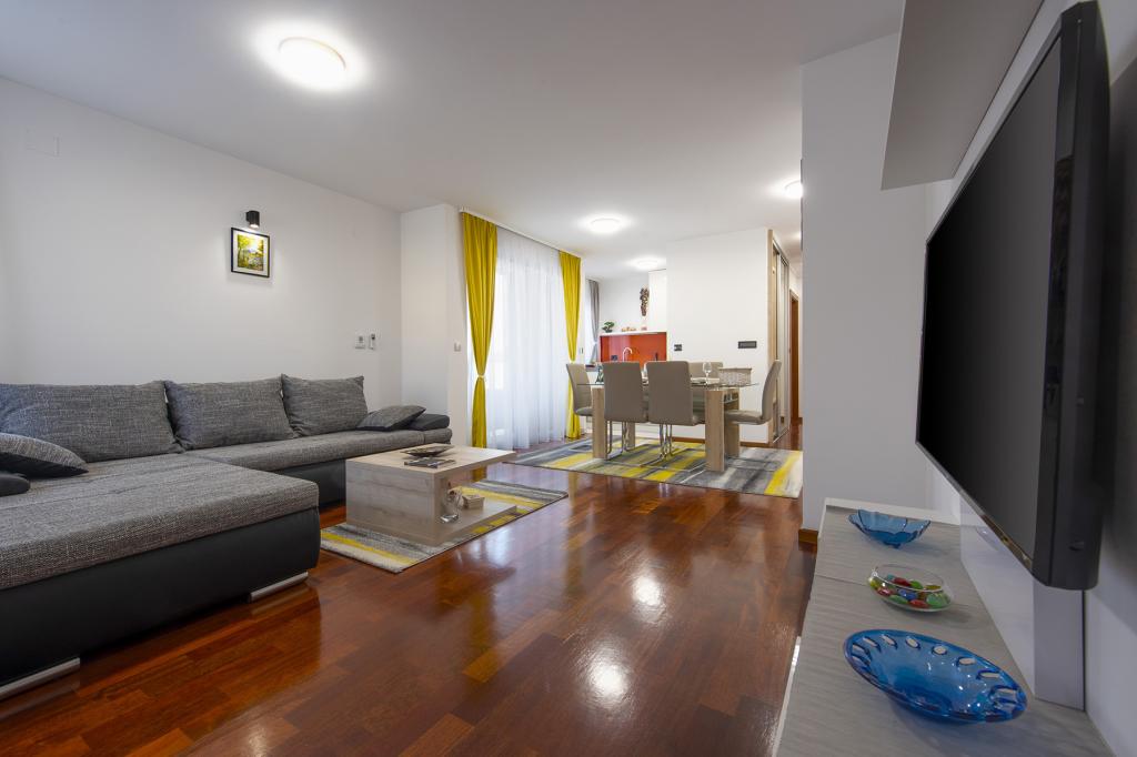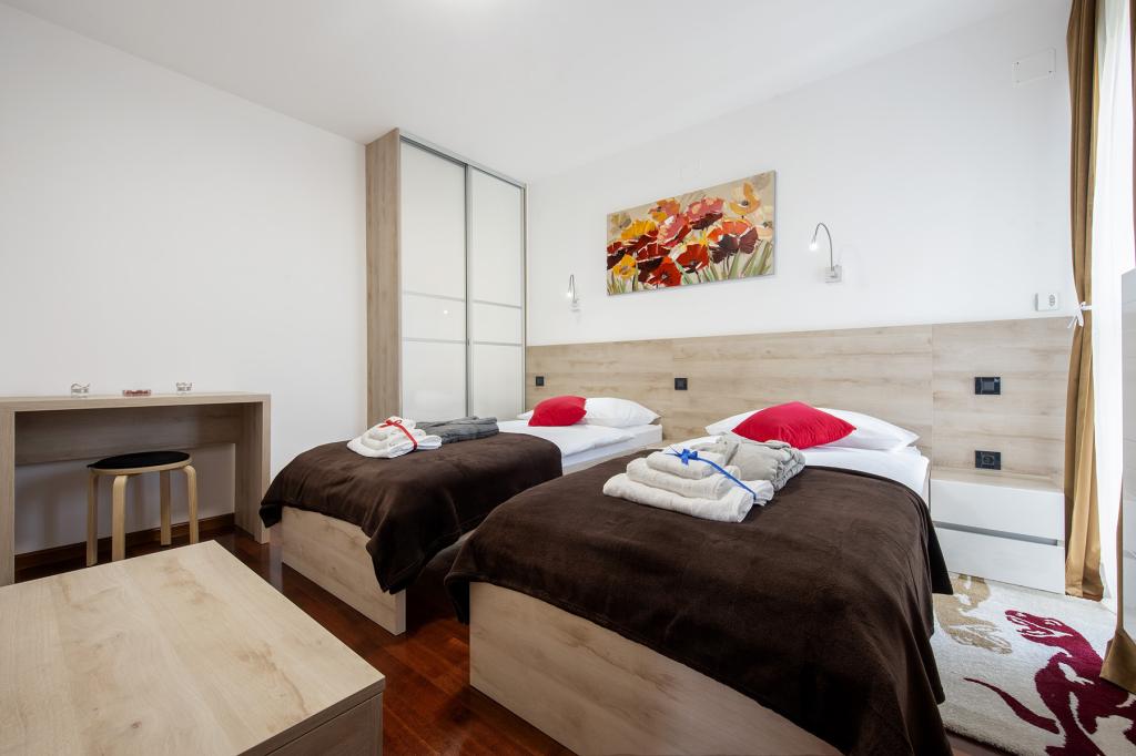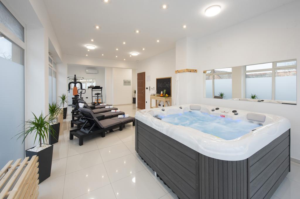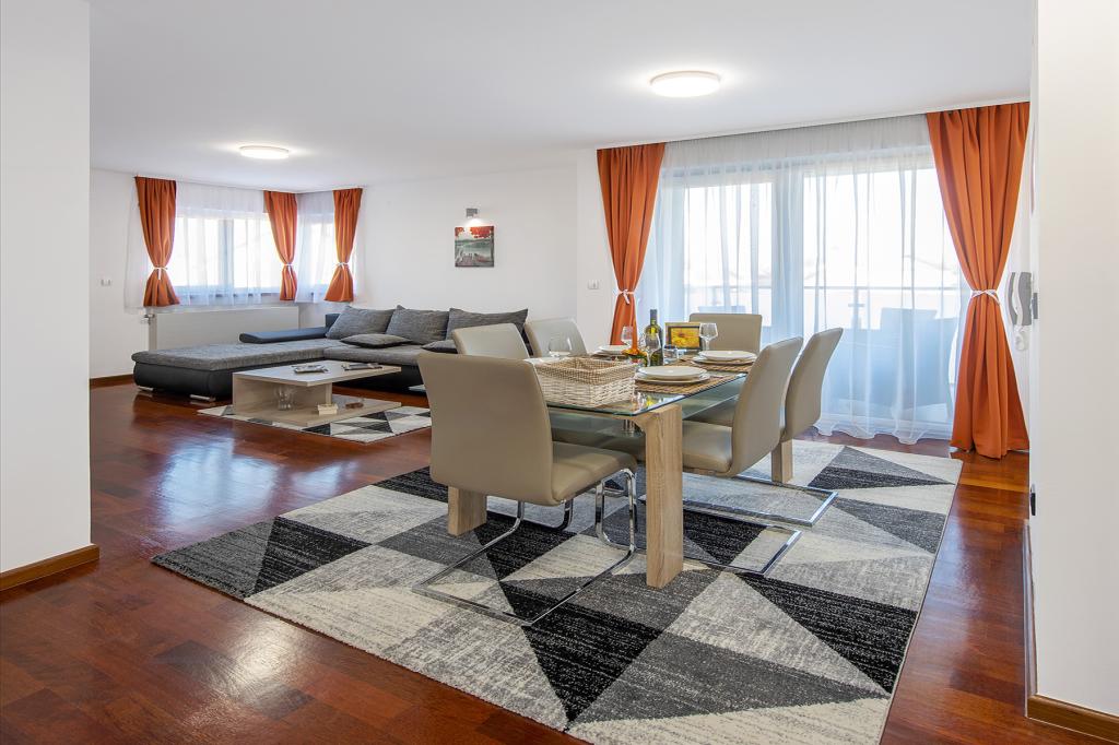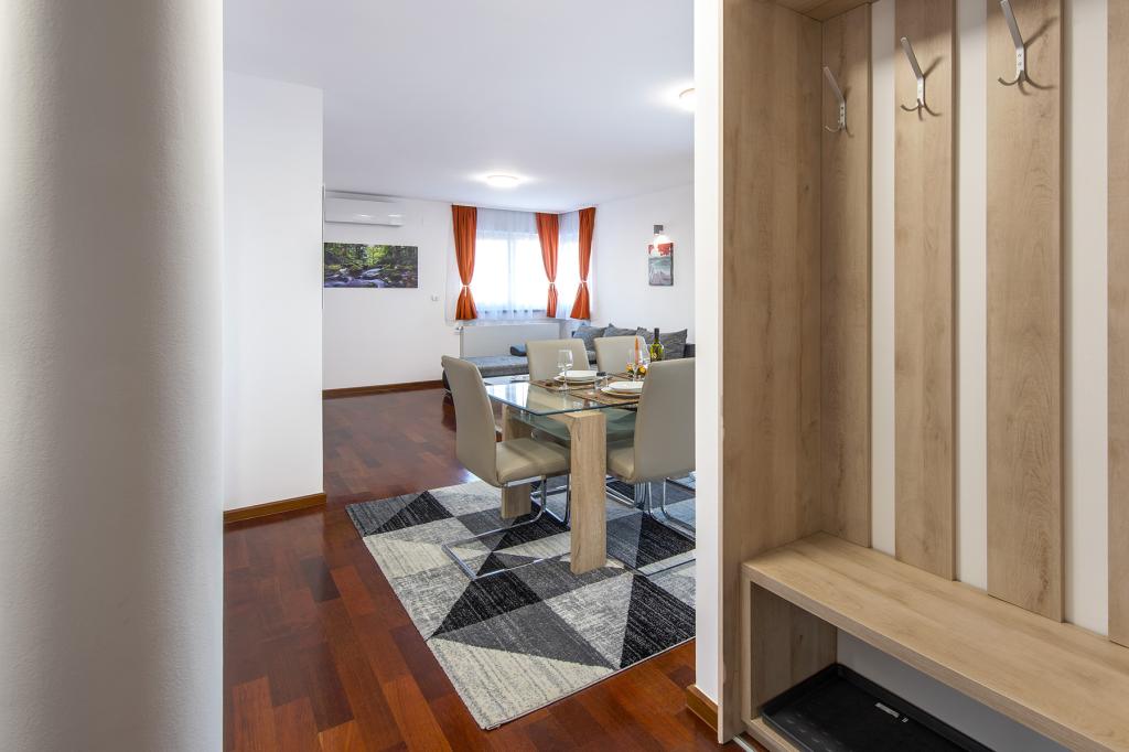 Ratkajec Luxury Apartments are perfect for family, business partners, sports types or individuals because of the facilities it offers. These modern apartments are located in Varaždin, approximately 1.7 km from the city center. There is a fenced parking lot next to the building, which is under video surveillance. The apartment is air-conditioned and equipped with central heating and a dishwasher and washing machine, it can accommodate up to 6 people. The apartment has two bedrooms, one with a double bed, and the other with 2 single beds + extra bed in the living room. The price of the apartment includes a wellness area with a hydromassage tub, sauna, deckchairs and fitness equipment. Also, other facilities such as a punching bag, darts and table football are included. In the vicinity of the apartment there are shops, cafes, restaurants with a diverse gastronomic offer of traditional dishes and drinks, and many cultural sights.