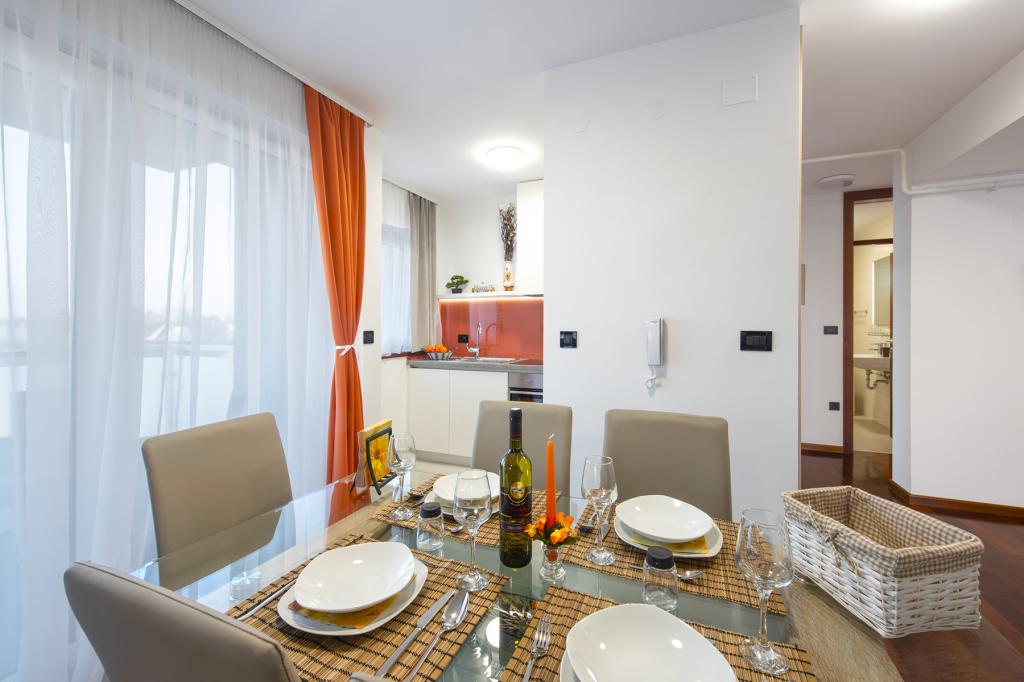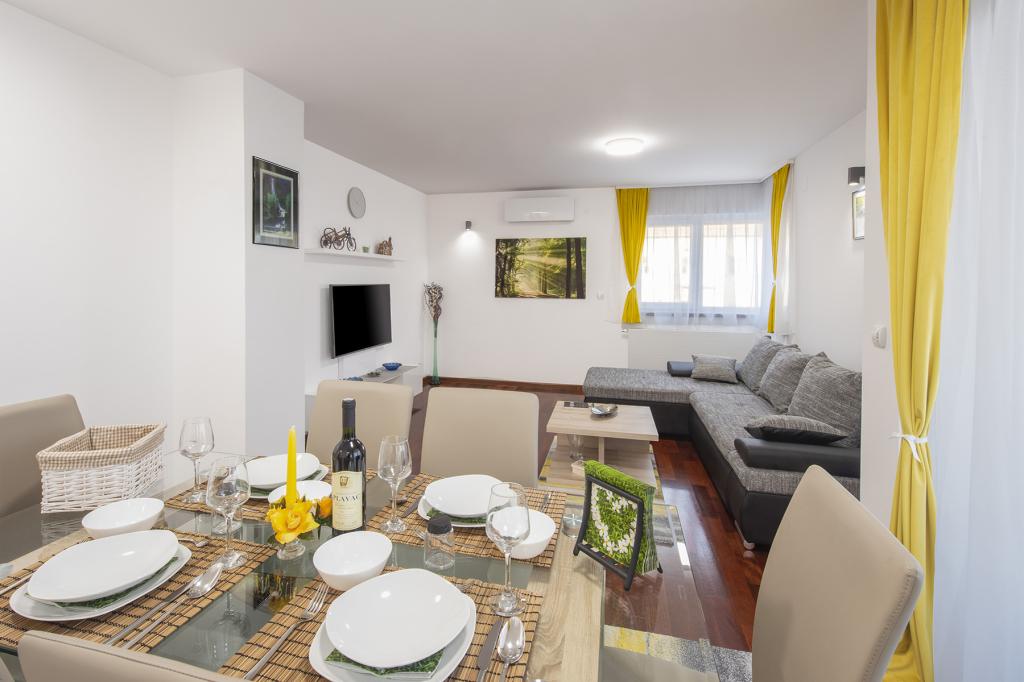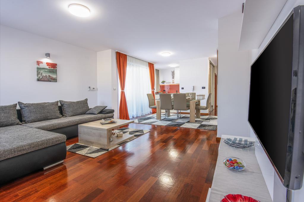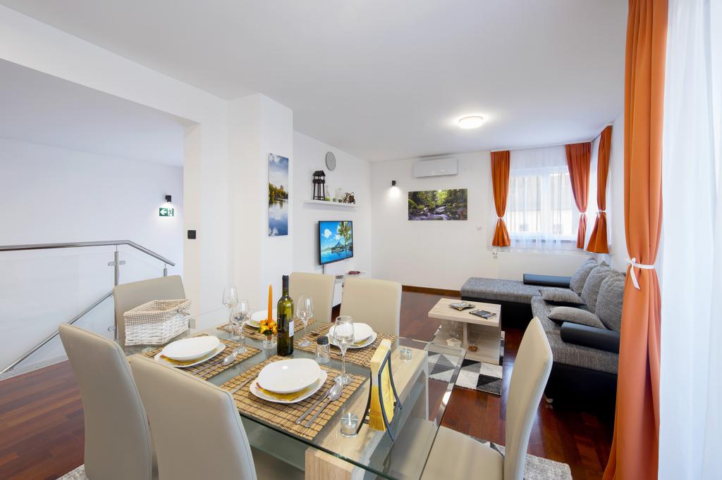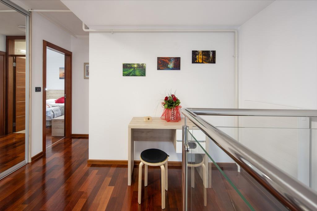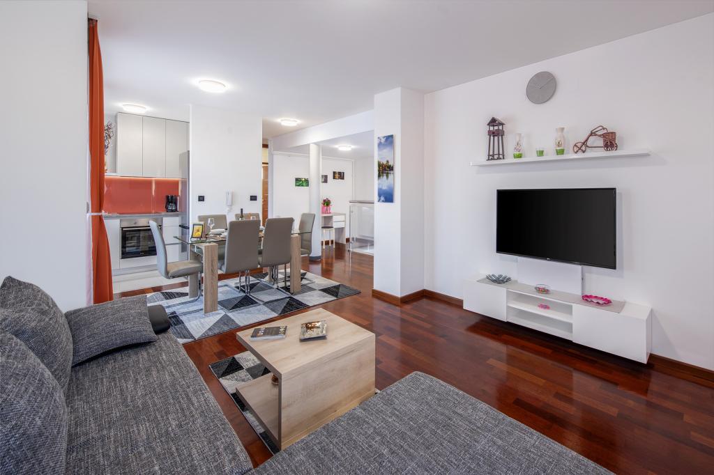 Ratkajec Luxury Apartments are perfect for family, business partners, sports types or individuals because of the facilities it offers. These modern apartments are located in Varaždin, approximately 1.7 km from the city center. There is a fenced parking lot next to the building, which is under video surveillance. The apartment is air-conditioned and equipped with central heating and a dishwasher and washing machine, it can accommodate up to 6 people. The apartment has two bedrooms, one with a double bed, and the other with 2 single beds + extra bed in the living room. The price of the apartment includes a wellness area with a hydromassage tub, sauna, deckchairs and fitness equipment. Also, other facilities such as a punching bag, darts and table football are included. In the vicinity of the apartment there are shops, cafes, restaurants with a diverse gastronomic offer of traditional dishes and drinks, and many cultural sights.