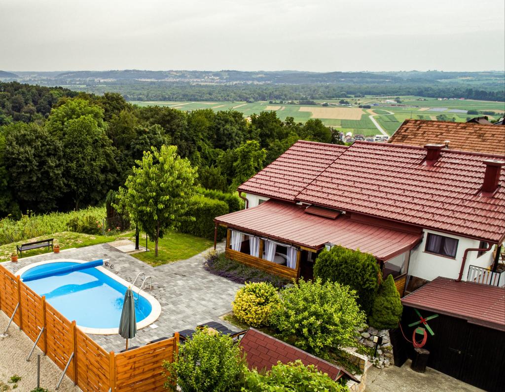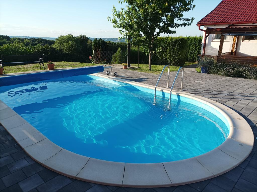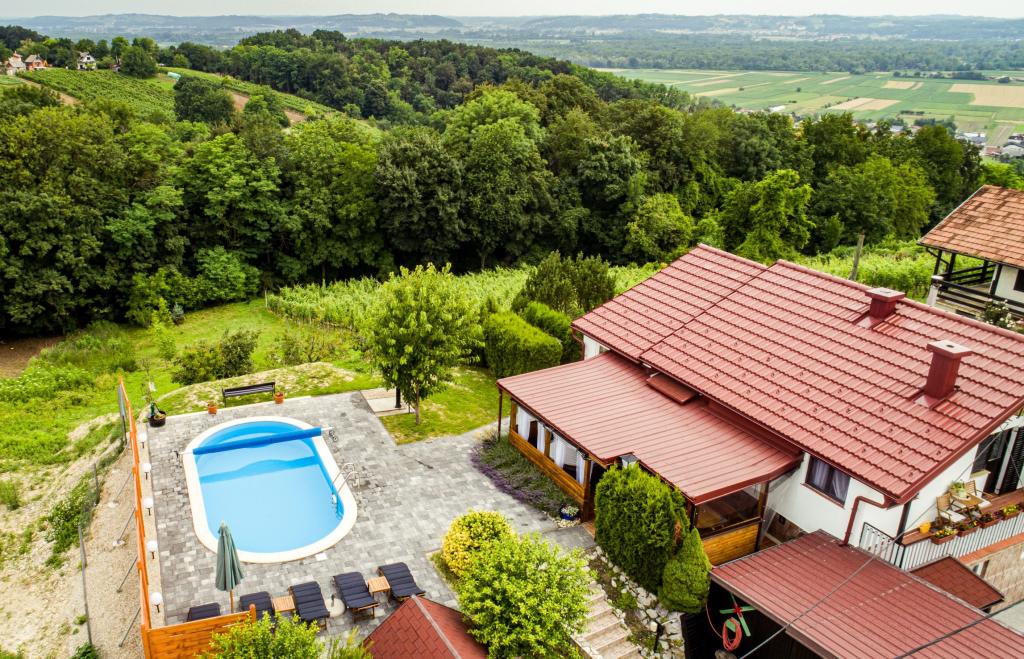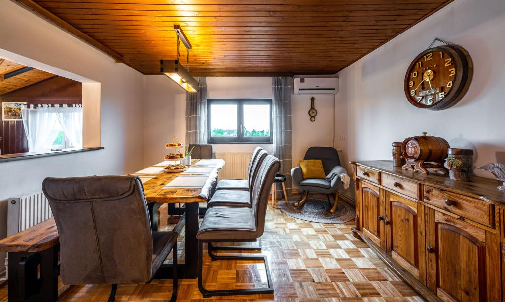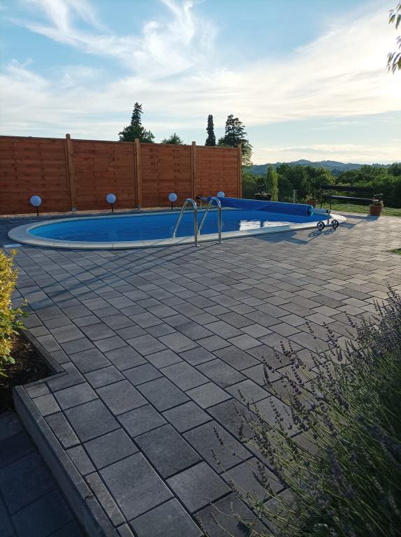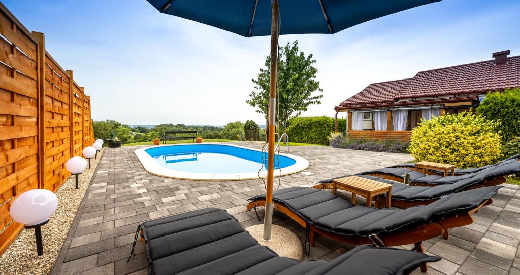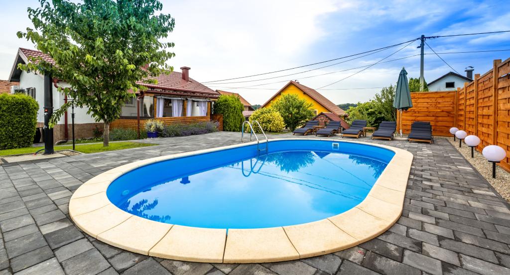 The holiday house "Nihil deest" is located in Falinić Breg, municipality of Cestica, 20 km from Varaždin, and 6 km from the border crossing Dubrava Križovljanska. The house offers a fully equipped kitchen, bathroom with bathtub, shower and toilet, separate toilet, dining room, living room and 2 bedrooms with a double bed and 1 room with a single bed. The house has a terrace with a hydromassage pool and wooden garden furniture, a barbecue, and an outdoor solar shower. The house is suitable for families with children. The yard of the house is fenced. In the yard there is a wooden climbing frame for children, a mini gym, a hanging bowling alley and a badminton set. From June to the end of September, an outdoor swimming pool (dimensions 7.5x3.5 m) with a sunbathing area is open.