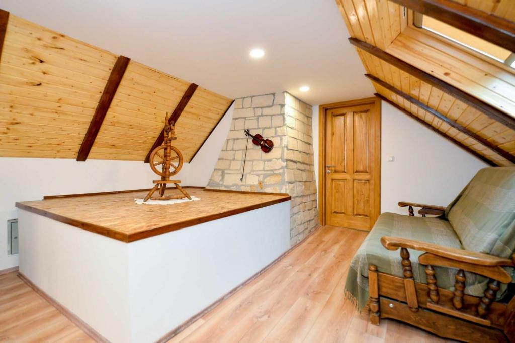 An autochthonous house built in 1778 is for rent, located in Hrvatsko zagorje (Varaždin County) at Vinica Breg 97 (2 km from the road Varaždin - Maribor). The house was recently renovated, and the traditional building materials (vinicite stone and wood) were kept. On the ground floor of the house there is a large living room with a dining room, a kitchen, a bathroom with a toilet, a sauna room and a corridor, while in the attic there is a large bedroom and a spacious hall (91 m2 in total). The house has one double bed and one extra bed, so it is suitable for accommodating a family. There is a secured parking space and a covered barbecue with a small terrace in the yard. In the surroundings of the house there is beautiful nature, so the house is ideal for accommodation for nature lovers, hunters (close to LD Zelendvor), fishermen (close to the Drava and the Vinica pond). Not far from the house is the famous Opeka Arboretum, the Vindija cave and other cultural and sacred objects.