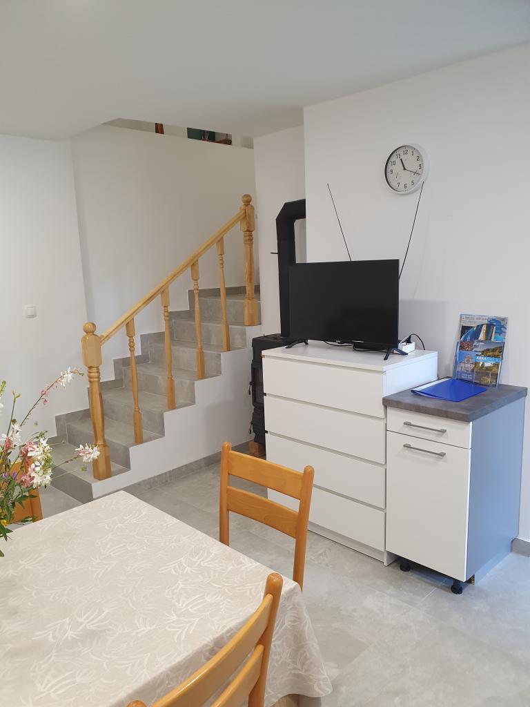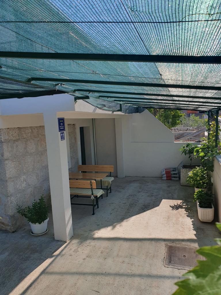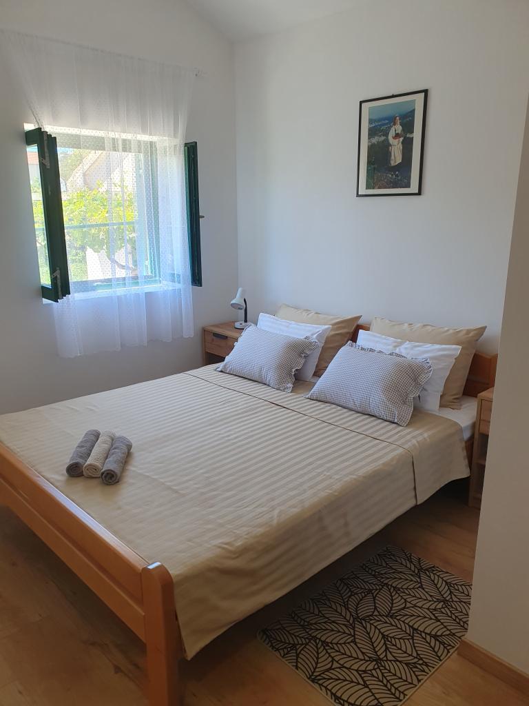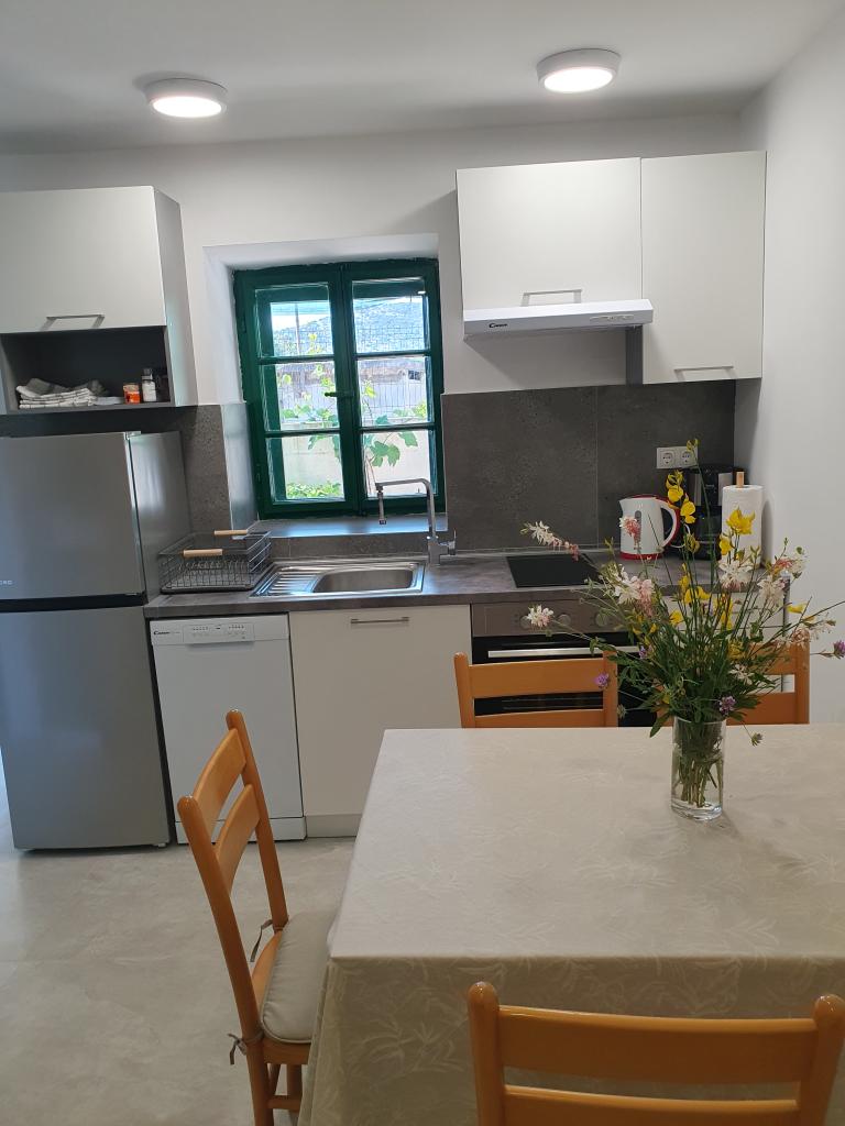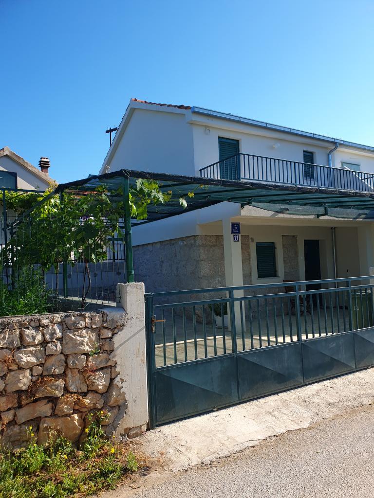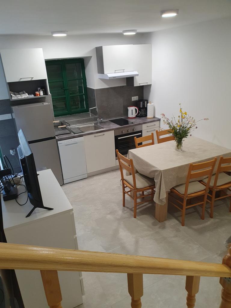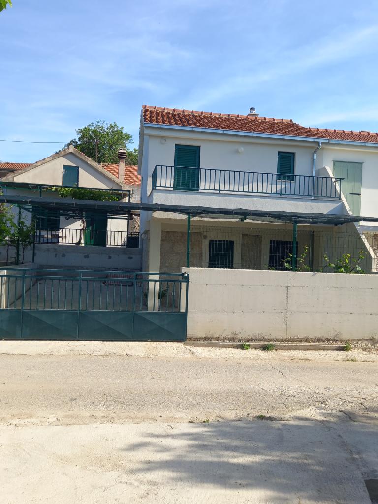 The holiday house "Kaja" is located in the old, quiet part of a small Dalmatian town. It is equipped with all the necessary equipment for a pleasant stay. Right next to the house there is a parking space and a shaded terrace. The house is spread over two floors, connected by an internal staircase. On the ground floor there is a fully equipped kitchen with a dining room, a living room and a small toilet. On the first floor there are two double bedrooms and a bathroom with a toilet. One of the rooms has an exit to a balcony from which there is a panoramic view of the entire town. The beach is about a 10-minute walk from the house, and other facilities such as restaurants and shops are located at a similar distance.
