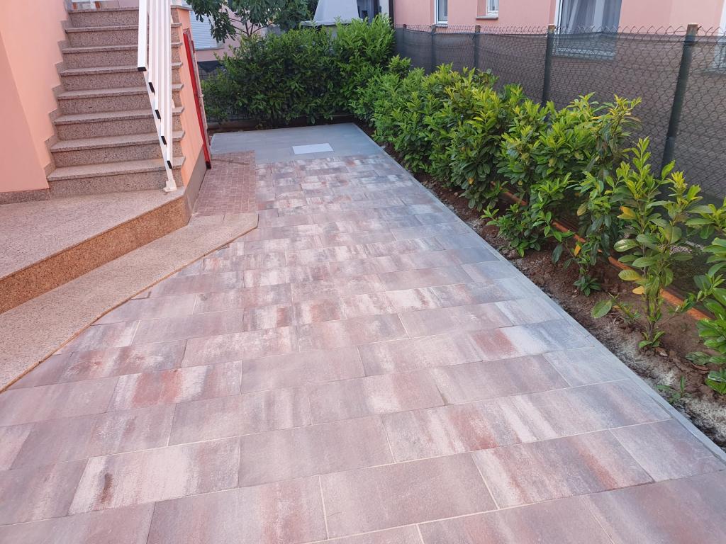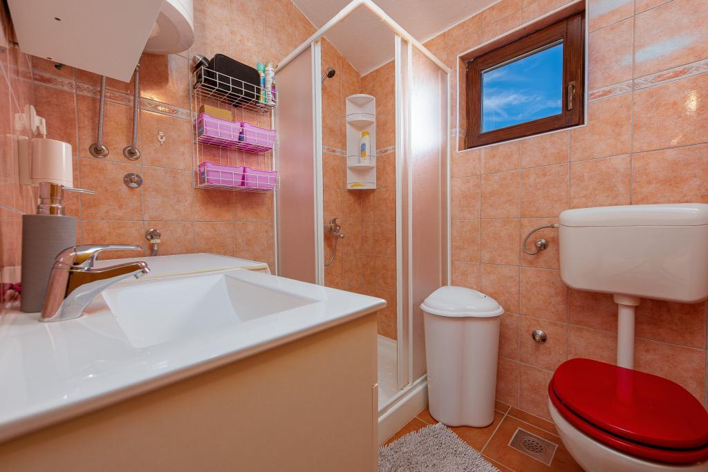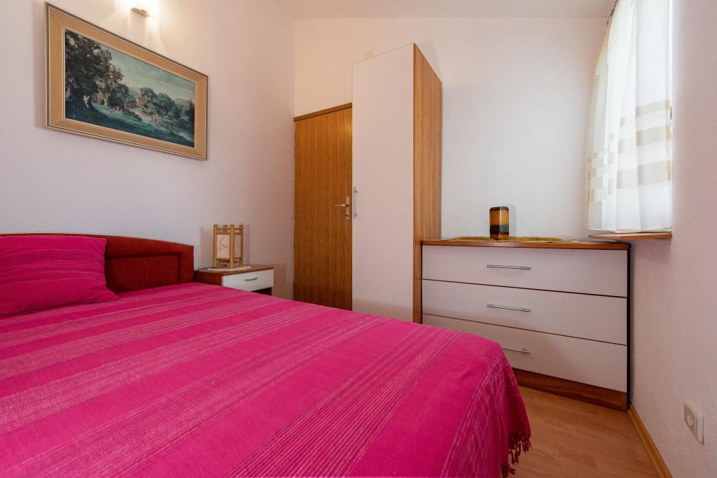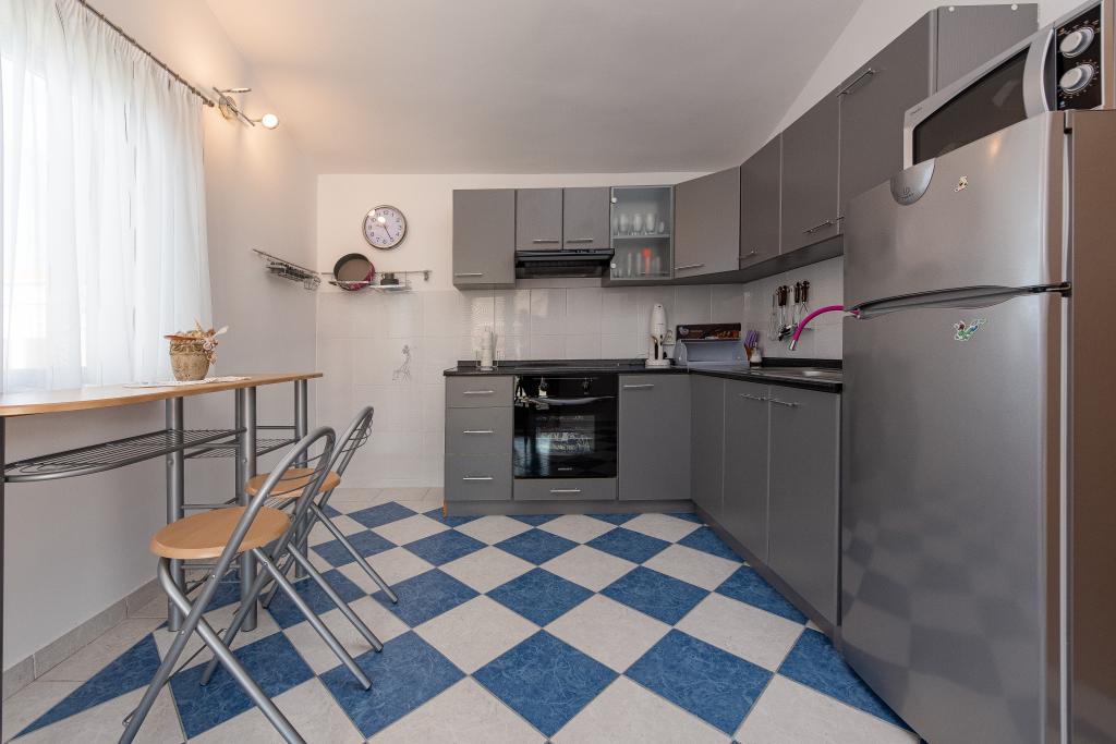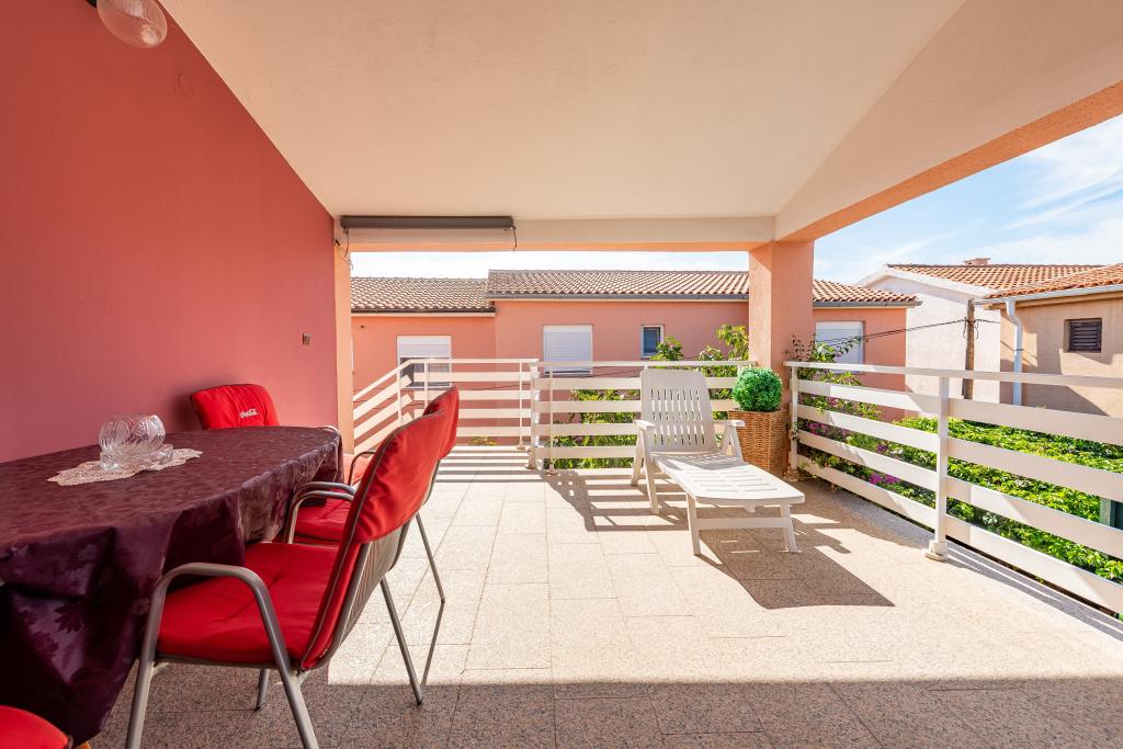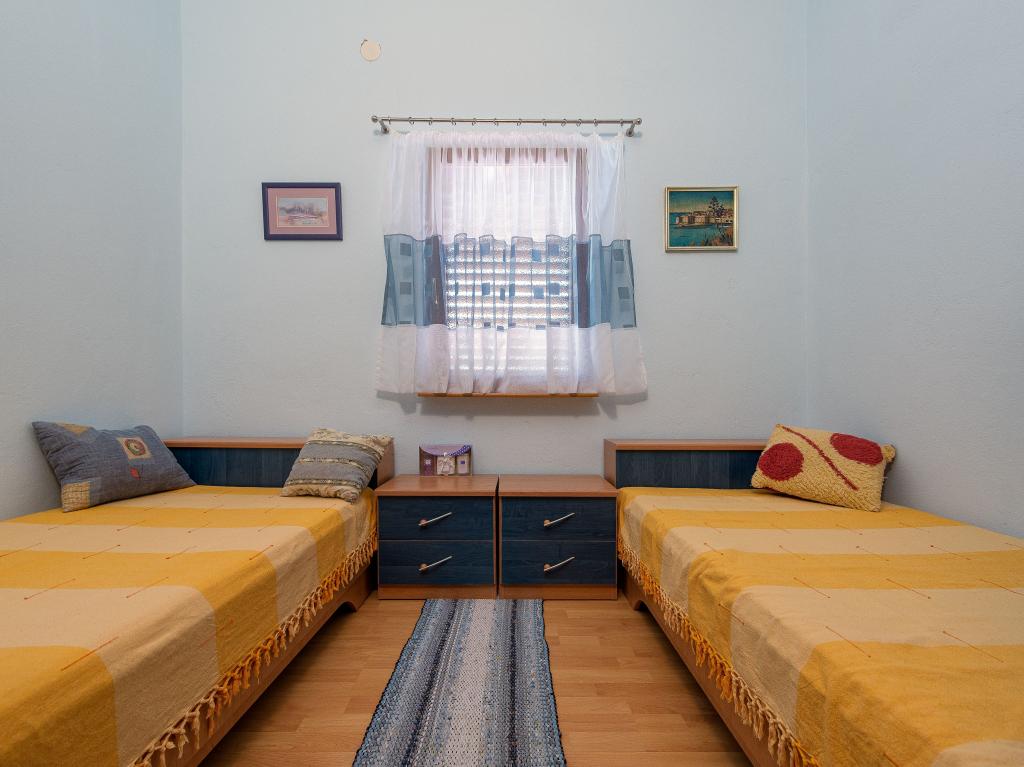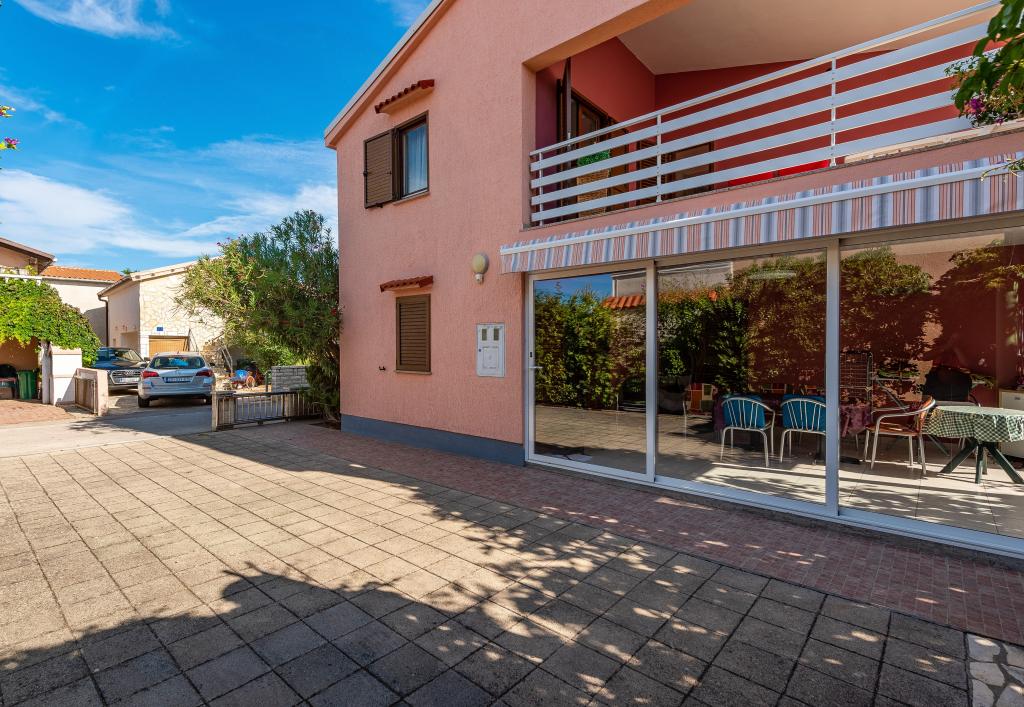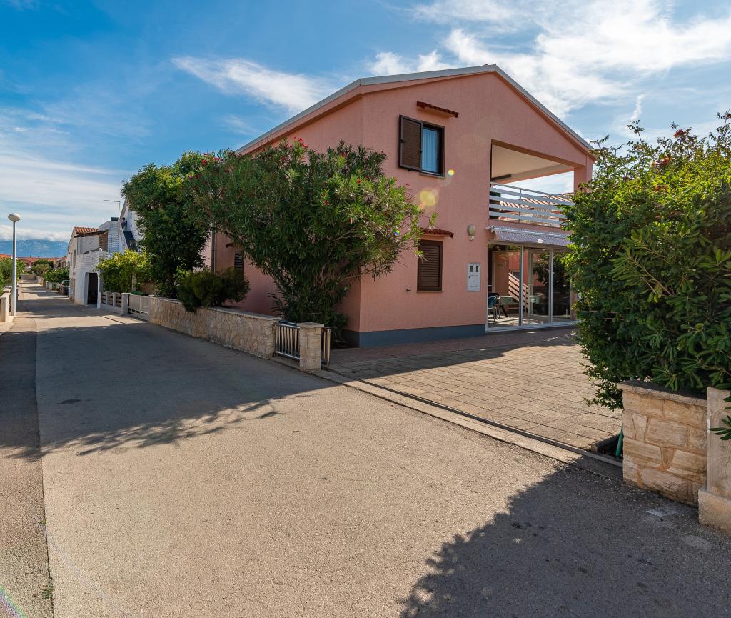 The apartment is located in a quiet street on the island of Vir. The distance to the beach is a five-minute easy walk. There are two beach bars, a bakery and a restaurant on the beach. The beach is sandy, ideal for children. The apartment is air-conditioned, newly renovated, with a separate entrance and a covered terrace of 20 m2. It consists of a kitchen with dining room, living room, bathroom and two bedrooms. The apartment has free WiFi and satellite programs via A1. A parking space is provided in the closed courtyard.