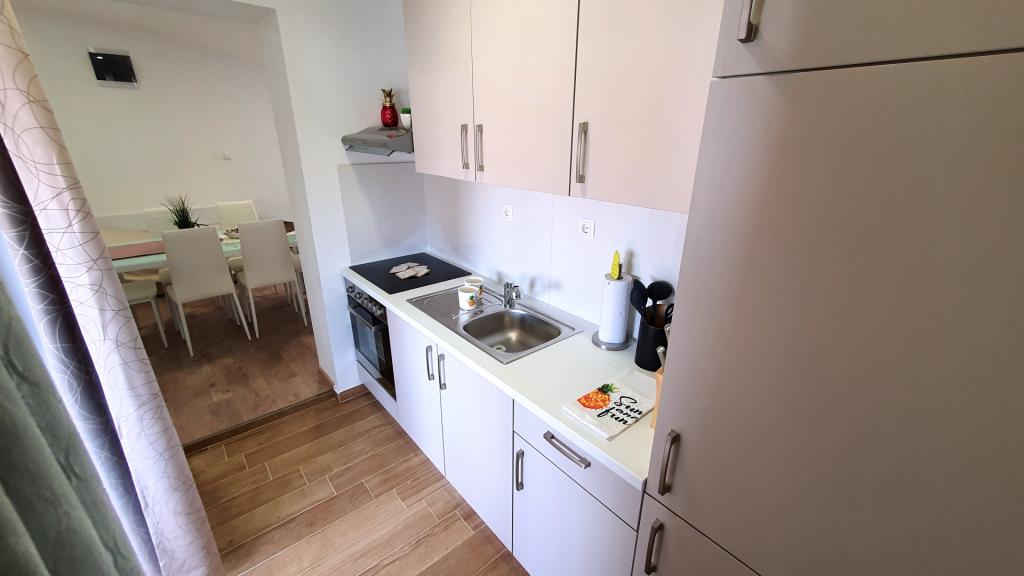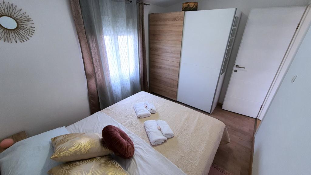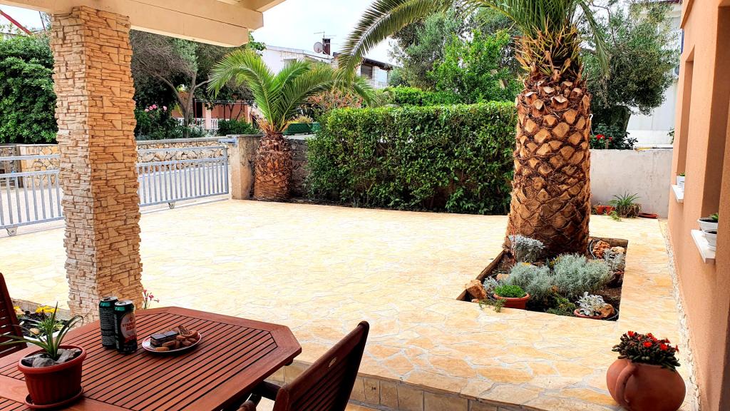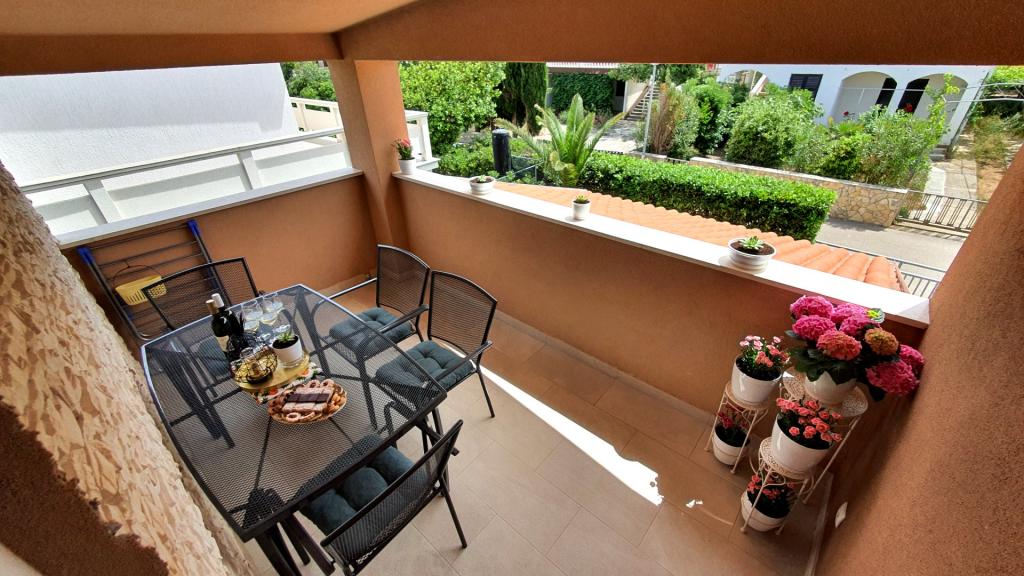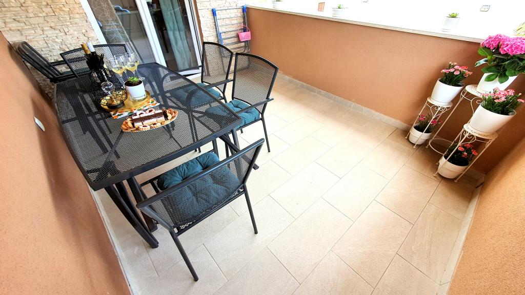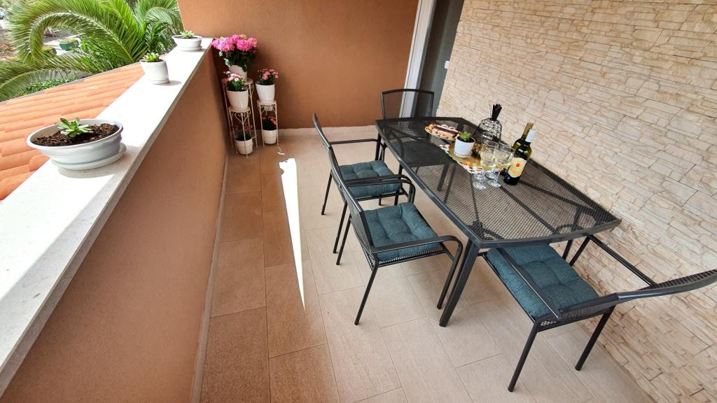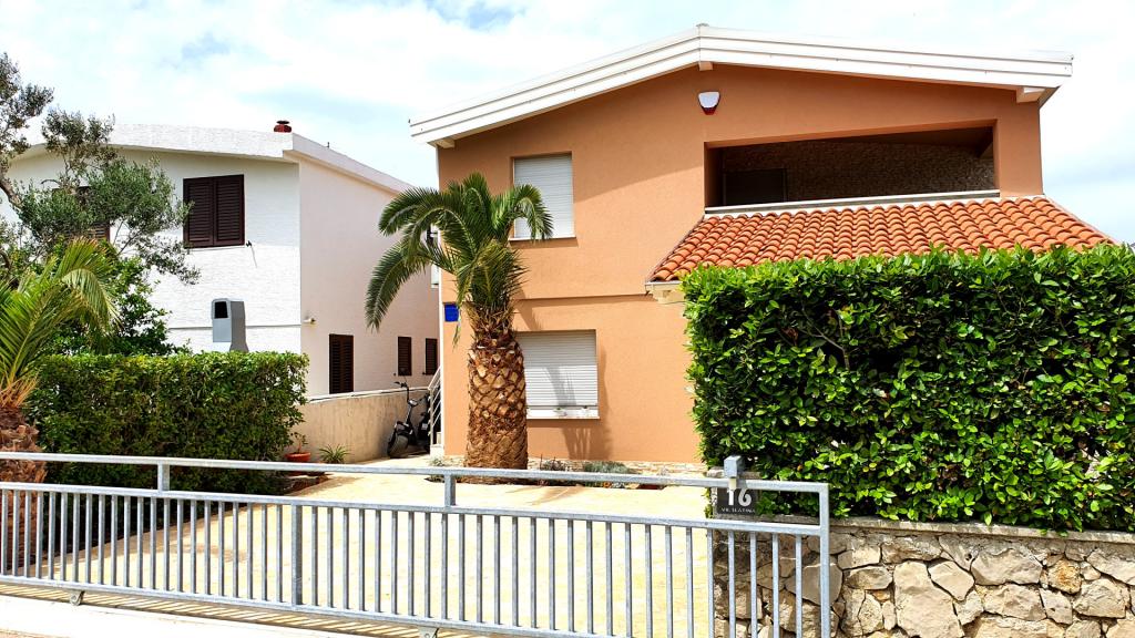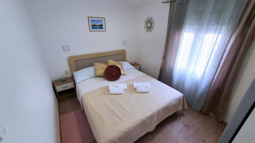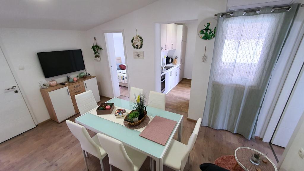 Newly decorated, modern apartments on the island of Vir are equipped with everything you need for a pleasant and relaxing vacation. The apartments are located on the first floor of the family house and each has its own large terrace as well as a fully equipped kitchen, bathroom and bedroom and an associated parking space that is under 24-hour video surveillance for the safety of your car. The apartments are located in a quiet part of the island without any night noise and suitable for children to play because many beaches have a sandy bottom and are very shallow in most parts, making them an ideal choice for parents with children. Nearby there are various beaches, promenades as well as all other facilities such as shops, bakeries, cafes, restaurants, pharmacies, clinics, churches, post offices and bus stations. All facilities are within walking distance and it is not necessary to use a car during your stay. All apartments have wi-fi, air conditioning and a washing machine, which are included in the price. For all other information and questions, please feel free to contact us.