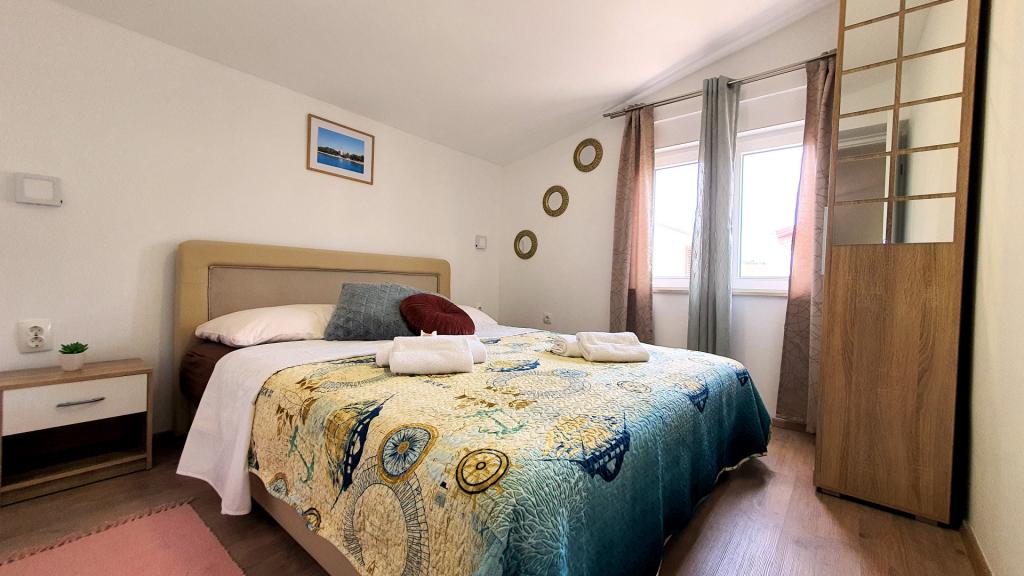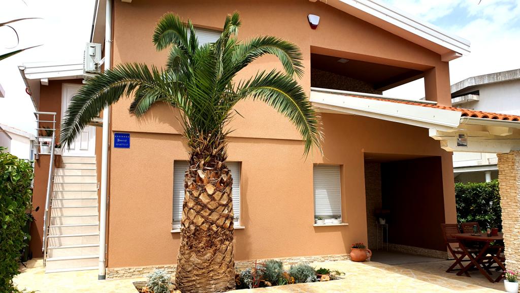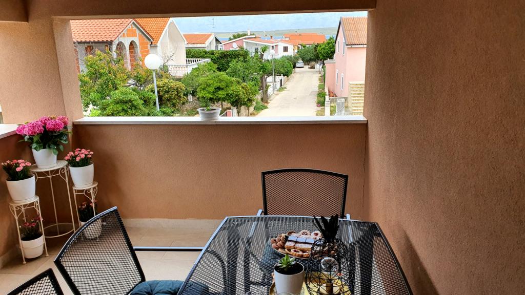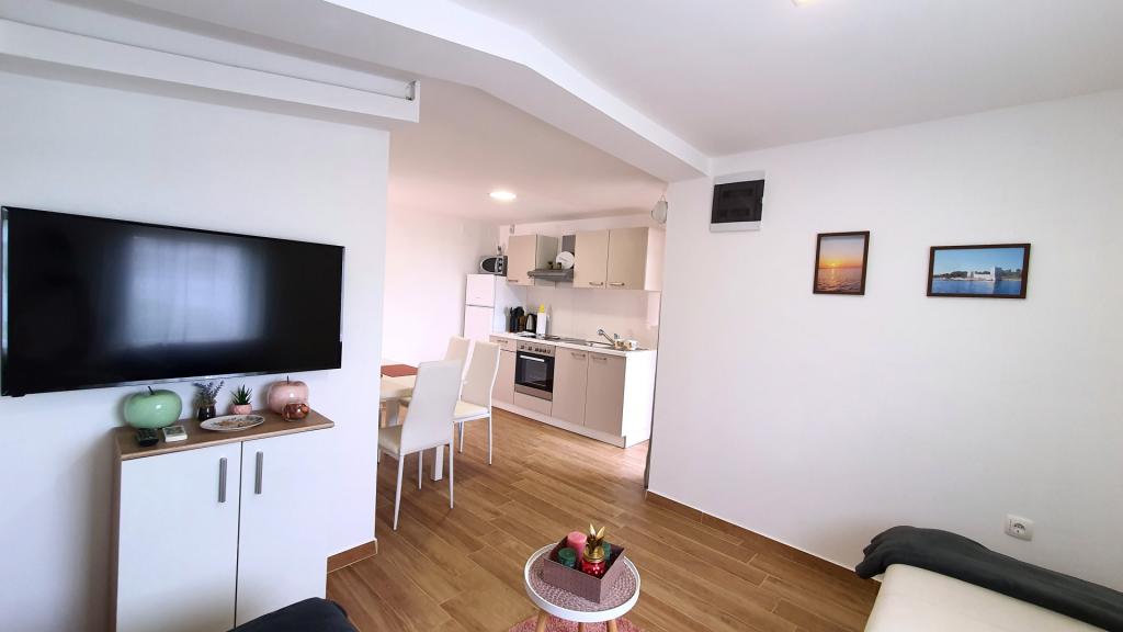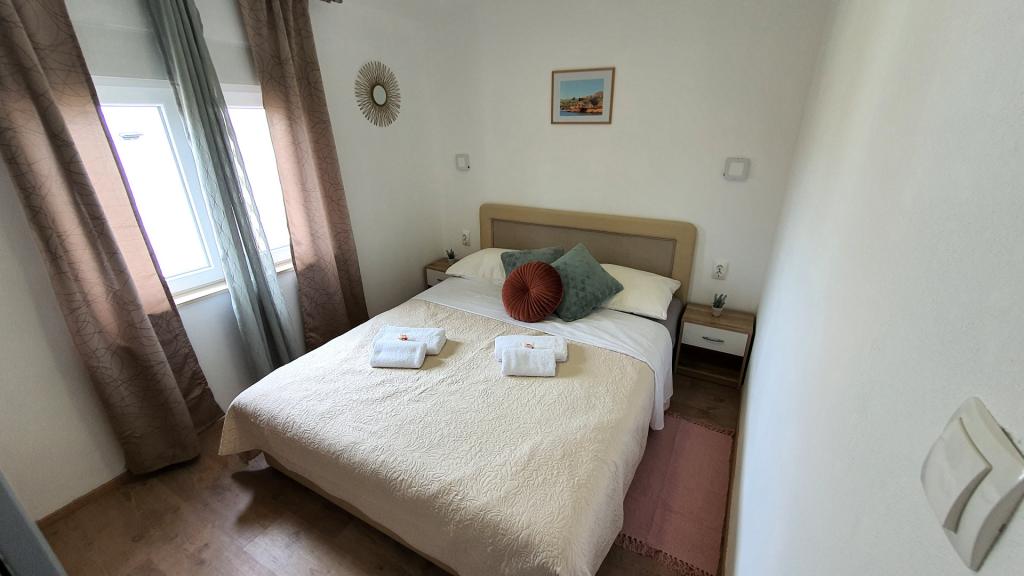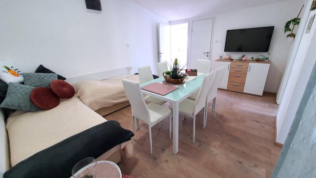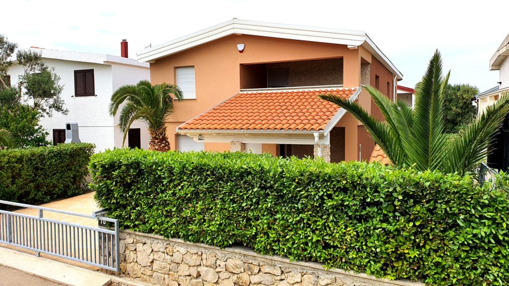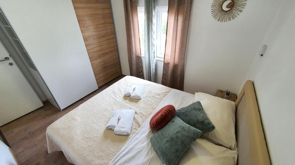 Newly decorated, modern apartments on the island of Vir are equipped with everything you need for a pleasant and relaxing vacation. The apartments are located on the first floor of the family house and each has its own large terrace as well as a fully equipped kitchen, bathroom and bedroom and an associated parking space that is under 24-hour video surveillance for the safety of your car. The apartments are located in a quiet part of the island without any night noise and suitable for children to play because many beaches have a sandy bottom and are very shallow in most parts, making them an ideal choice for parents with children. Nearby there are various beaches, promenades as well as all other facilities such as shops, bakeries, cafes, restaurants, pharmacies, clinics, churches, post offices and bus stations. All facilities are within walking distance and it is not necessary to use a car during your stay. All apartments have wi-fi, air conditioning and a washing machine, which are included in the price. For all other information and questions, please feel free to contact us.