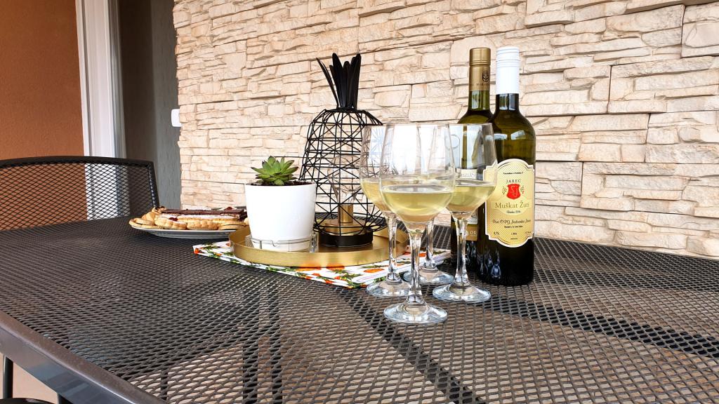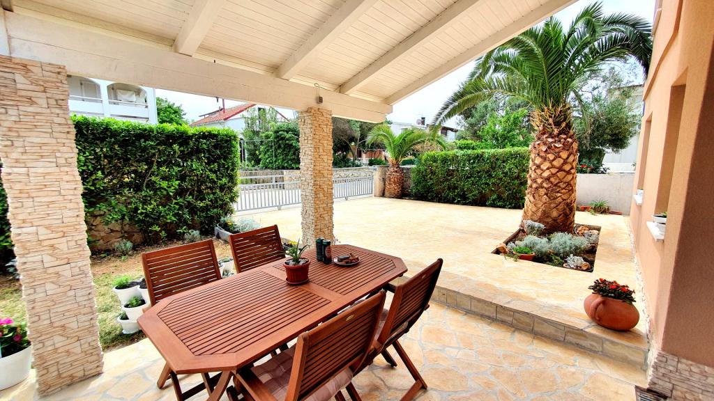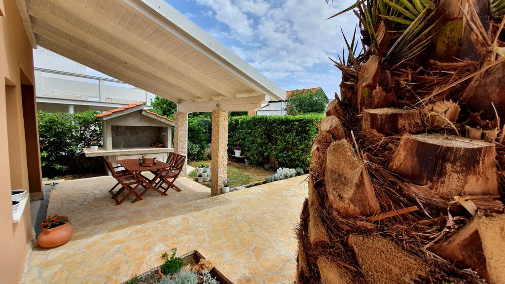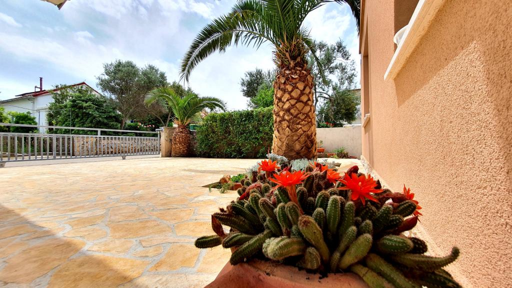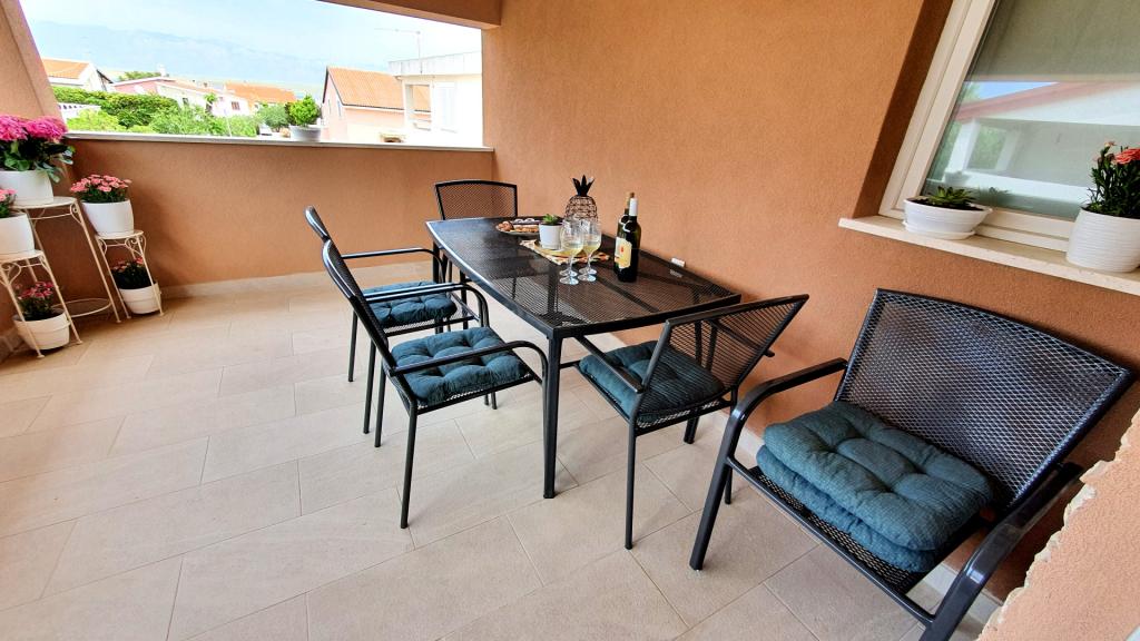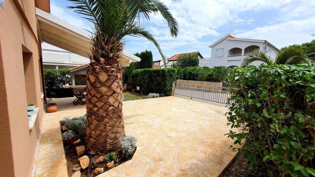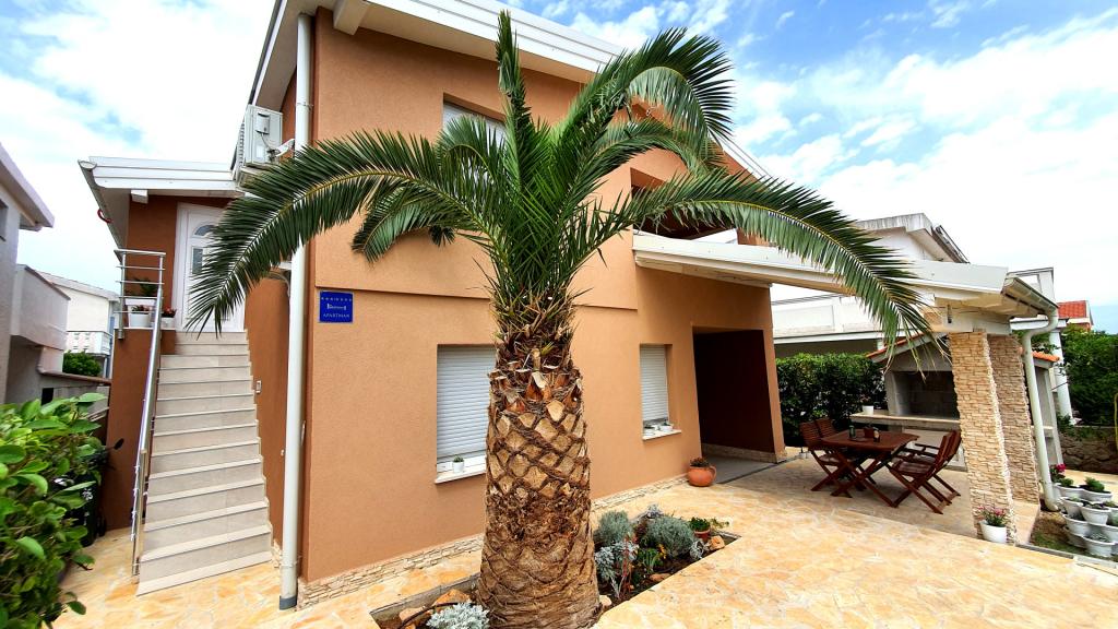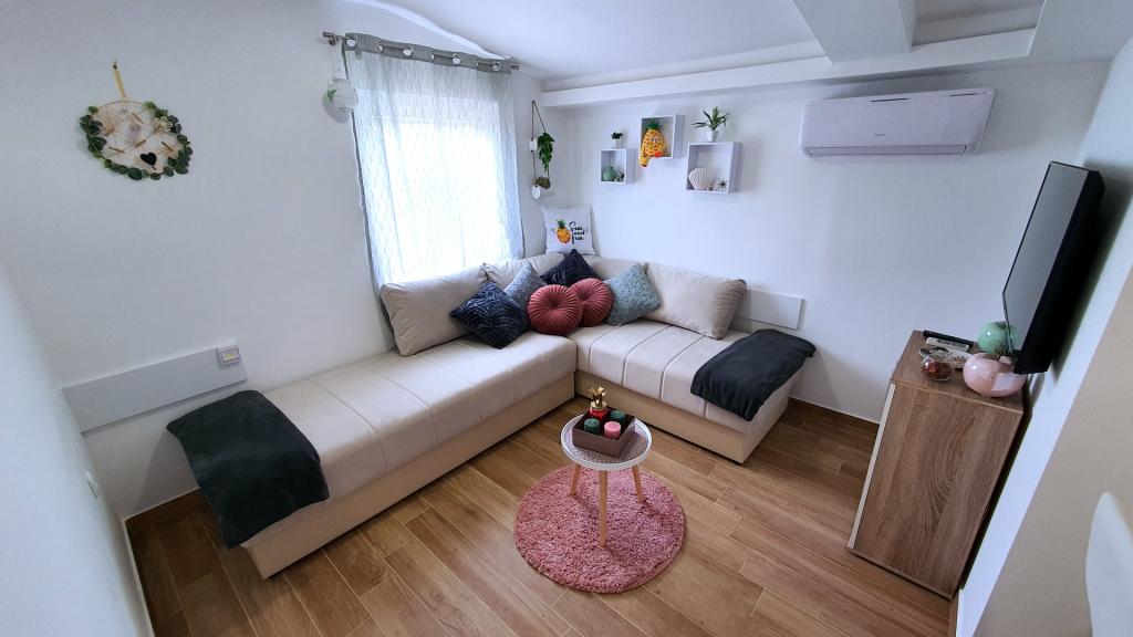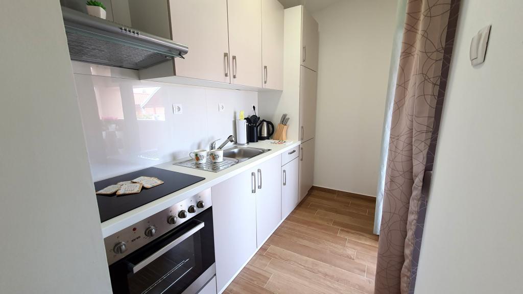 Newly decorated, modern apartments on the island of Vir are equipped with everything you need for a pleasant and relaxing vacation. The apartments are located on the first floor of the family house and each has its own large terrace as well as a fully equipped kitchen, bathroom and bedroom and an associated parking space that is under 24-hour video surveillance for the safety of your car. The apartments are located in a quiet part of the island without any night noise and suitable for children to play because many beaches have a sandy bottom and are very shallow in most parts, making them an ideal choice for parents with children. Nearby there are various beaches, promenades as well as all other facilities such as shops, bakeries, cafes, restaurants, pharmacies, clinics, churches, post offices and bus stations. All facilities are within walking distance and it is not necessary to use a car during your stay. All apartments have wi-fi, air conditioning and a washing machine, which are included in the price. For all other information and questions, please feel free to contact us.