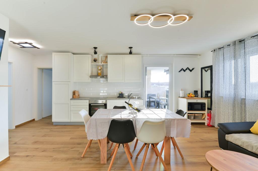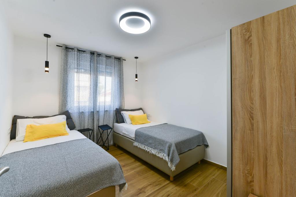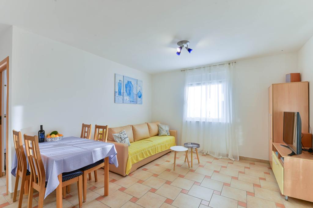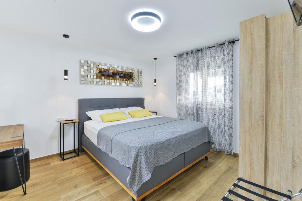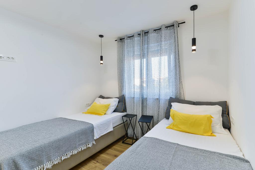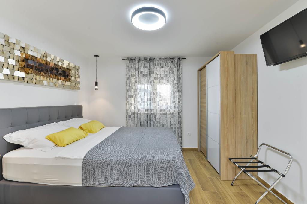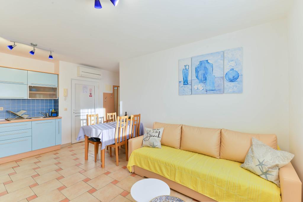 Fully equipped apartments, each room has its own air conditioning and TV, located 40 meters from the sea. Bar, restaurants and supermarket are within walking distance. The beach is pebbly and concrete, a ten-minute walk away is a sandy beach. The house has its own parking, grill and children's swing in the garden. Beach chairs, umbrellas and bicycles are available to guests.
