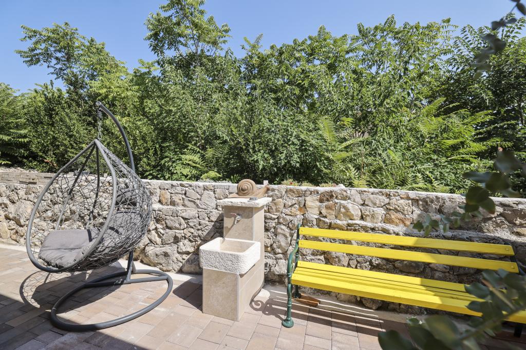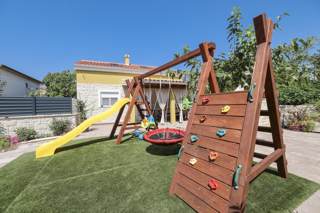 This new holiday home is located in the very center of the island of Vir. Hidden from noise and view. The house has 2 bedrooms with a double bed and one double bed on the gallery. The total capacity is 6 people. Also, there are two bathrooms, one in the attic and the other on the ground floor, equipped with a washing machine and dryer. The kitchen is also equipped with all appliances. In the yard there is a covered terrace, barbecue and children's playground. Parking is available to guests as well as one space in the garage. All neighbors are at a decent distance and you have privacy to yourself. If you want to be in the center, close to all facilities, and yet hidden from view, this house is the right choice for you. We are looking forward to your arrival.