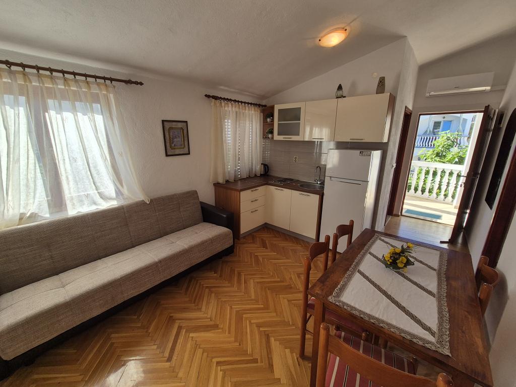 A wonderful facility, we used the app 2+2+2, we were delighted with the clean and tidy accommodation, spaciousness, peace and quiet. Apartments in abundance of greenery and shade in the summer heat. Close to the beach. The owners are extremely accommodating, friendly and available for all inquiries. We were particularly impressed by the owner's help with the grill, preparing the fire, and everything else we needed for grilling. Homemade wine for a welcome but also for a pleasant stay. Unobtrusive, yet available! Congratulations, we will be back next year!