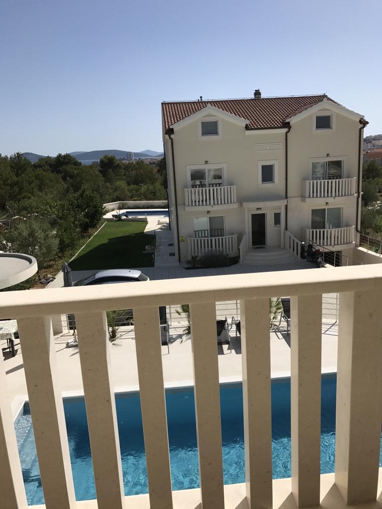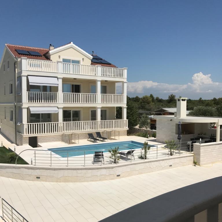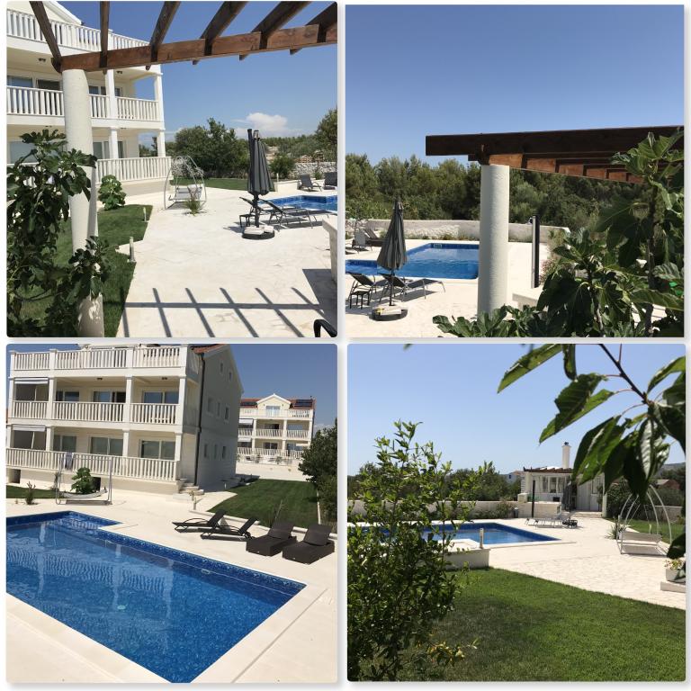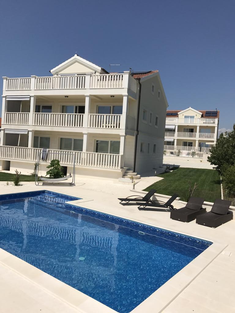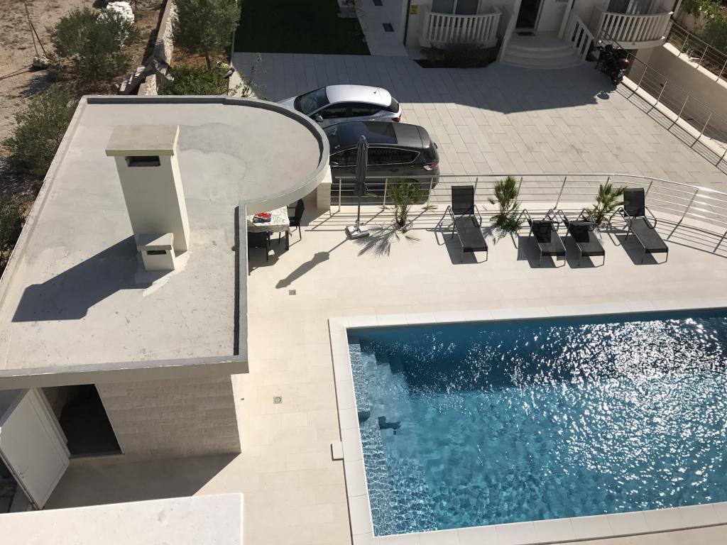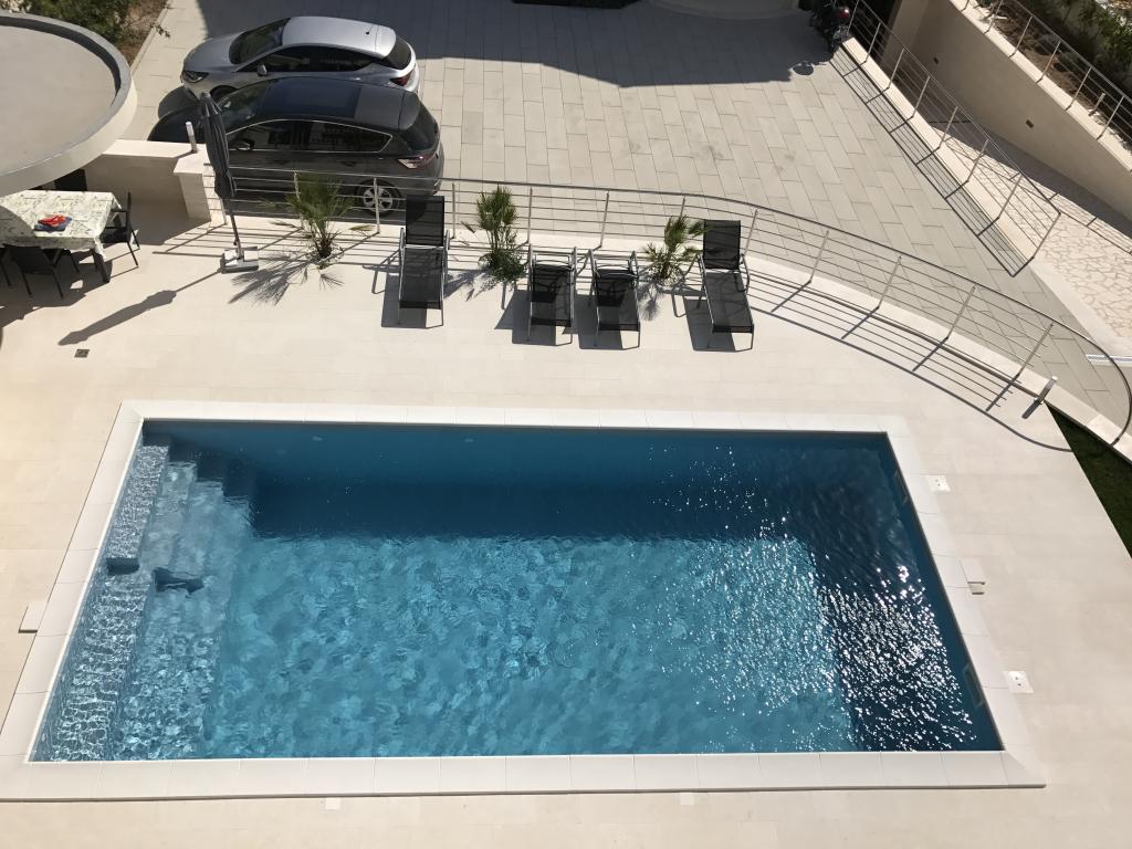 The luxurious Villa Bachelors contains four large apartments, C1, C2, D1 and D2 Penthouse. Each of them is 140 m2 in size and has a south-facing terrace of 35 m2. All but one apartment have a fully equipped kitchen, dining room, bedrooms for six people, living room with TV, three bedrooms, 3 large air conditioners, 2 bathrooms, one larger with double shower and sink. The other bathroom is standard in size. Large terraces with views of the city, sea, islands, pool and garden. The D2 Penthouse apartment enjoys spectacular views from the top floor. It has one large bathroom with double shower. Private outdoor area with two large swimming pools. Apartments C1 and C2 share one of these pools and the surrounding outdoor area with shower, toilet, sun loungers and grill house with a large table for 12 people. D1 and D2 Penthouse share the second pool with the surrounding outdoor area with shower, toilet, sun loungers, kitchen and grill house.