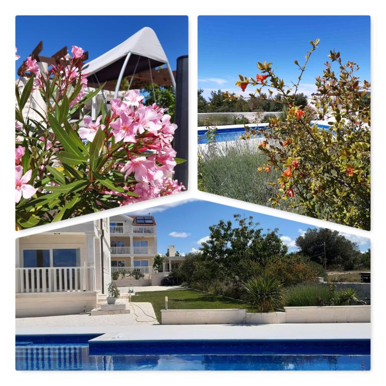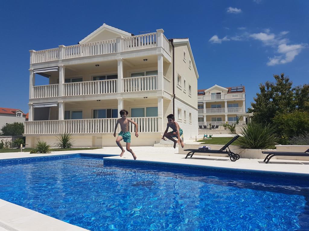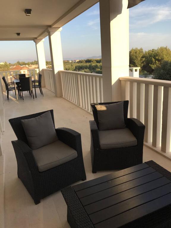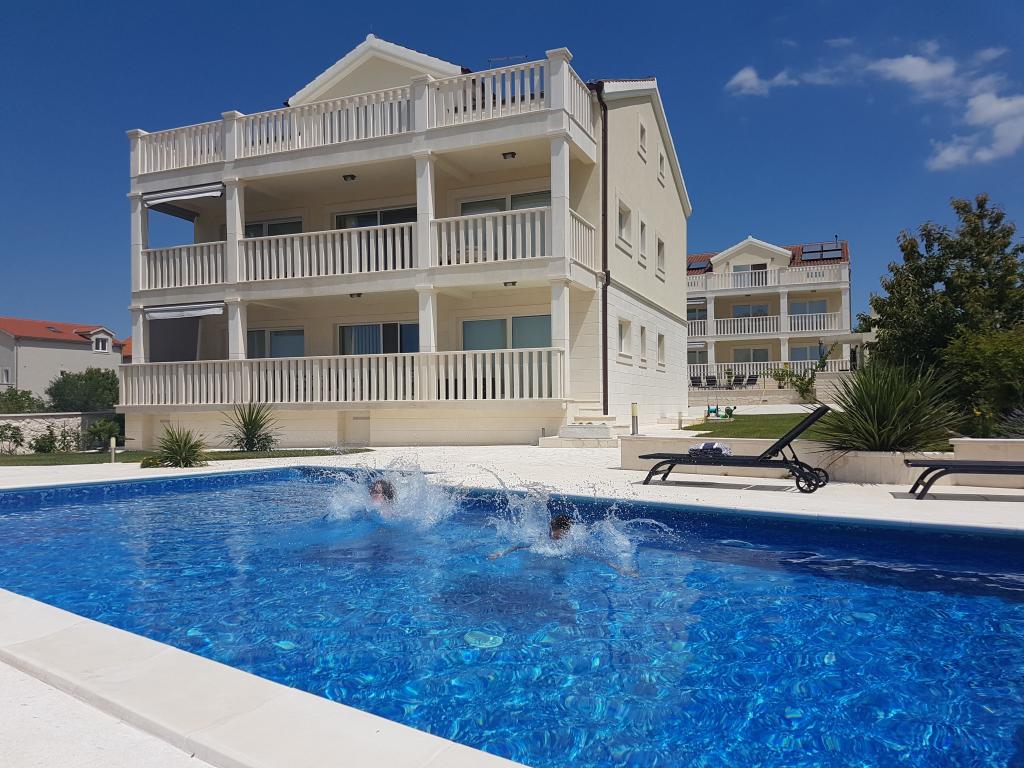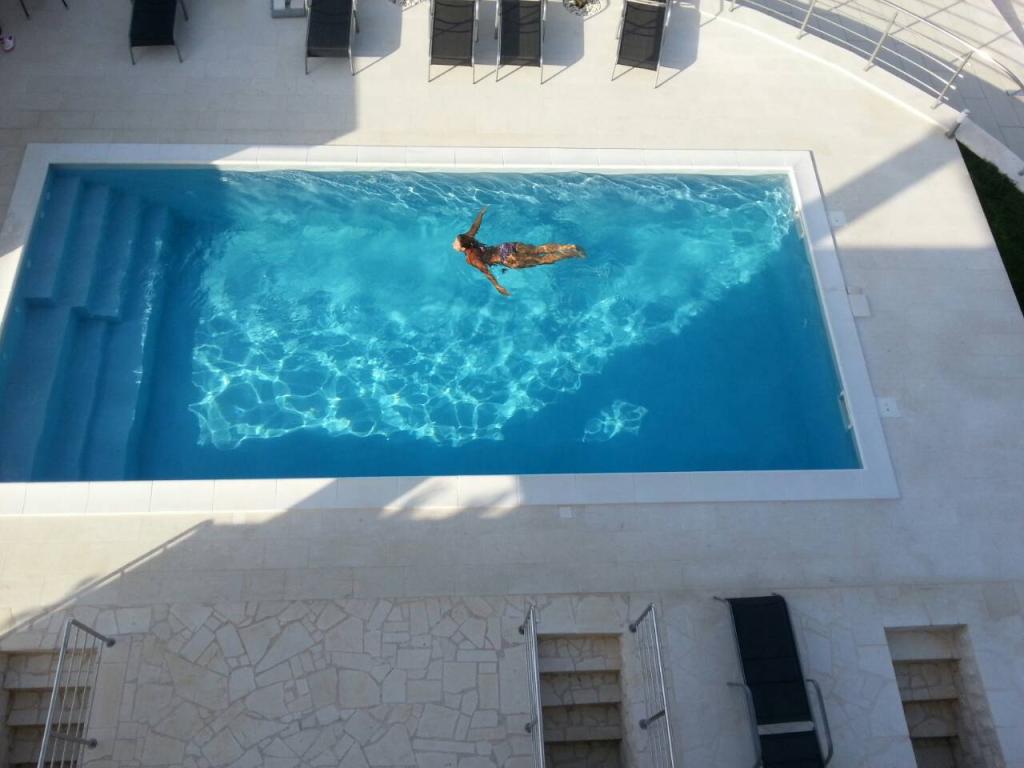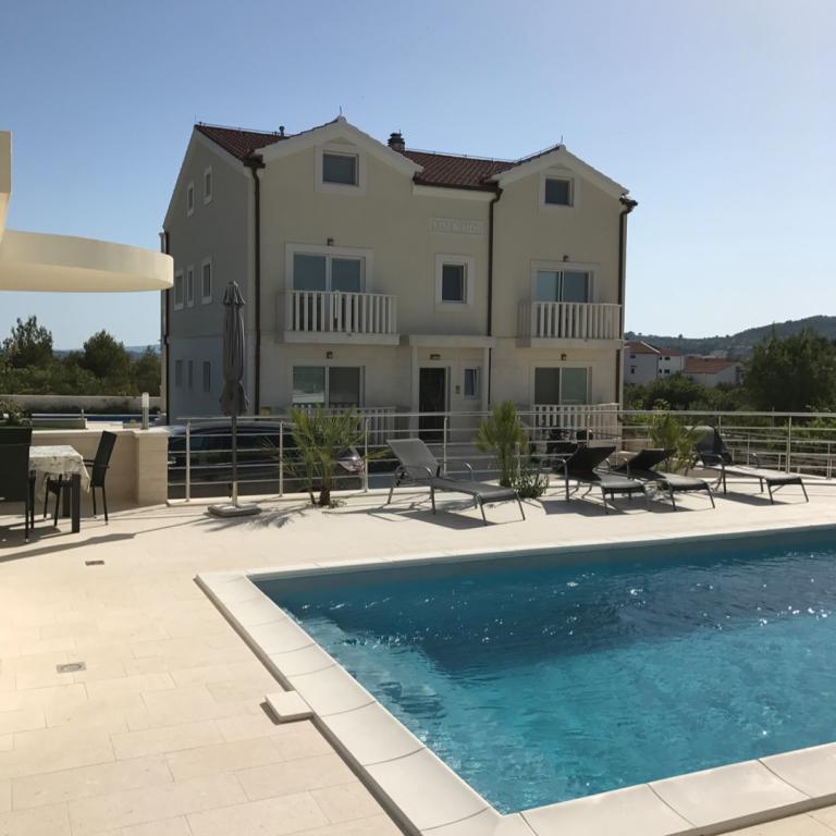 The luxurious Villa Bachelors contains four large apartments, C1, C2, D1 and D2 Penthouse. Each of them is 140 m2 in size and has a south-facing terrace of 35 m2. All but one apartment have a fully equipped kitchen, dining room, bedrooms for six people, living room with TV, three bedrooms, 3 large air conditioners, 2 bathrooms, one larger with double shower and sink. The other bathroom is standard in size. Large terraces with views of the city, sea, islands, pool and garden. The D2 Penthouse apartment enjoys spectacular views from the top floor. It has one large bathroom with double shower. Private outdoor area with two large swimming pools. Apartments C1 and C2 share one of these pools and the surrounding outdoor area with shower, toilet, sun loungers and grill house with a large table for 12 people. D1 and D2 Penthouse share the second pool with the surrounding outdoor area with shower, toilet, sun loungers, kitchen and grill house.