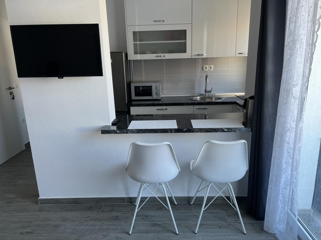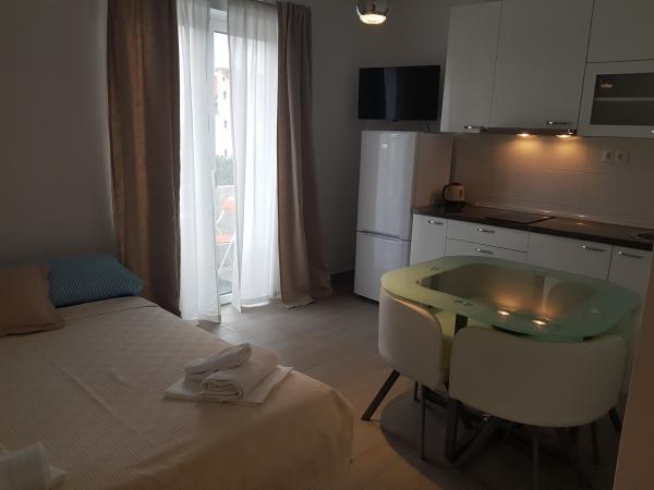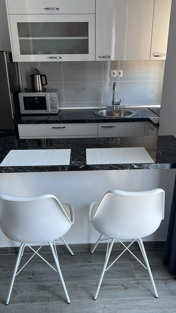 The apartment is perfect for a 2+1 family. There's a large bed in the bedroom and a sofa in the kitchenette area. Everything is as described. The kitchen and bathroom are equipped like home. The landlady is very friendly. She and her daughter take care of the apartments, ensuring they're clean and perfectly prepared for new tenants. Our apartment had a small balcony with chairs. Perfect for breakfast and coffee. The neighborhood is quiet, and it's close to the beach and a bakery with delicious rolls and pizza by the slice. I highly recommend it, especially since this is my second time staying here.