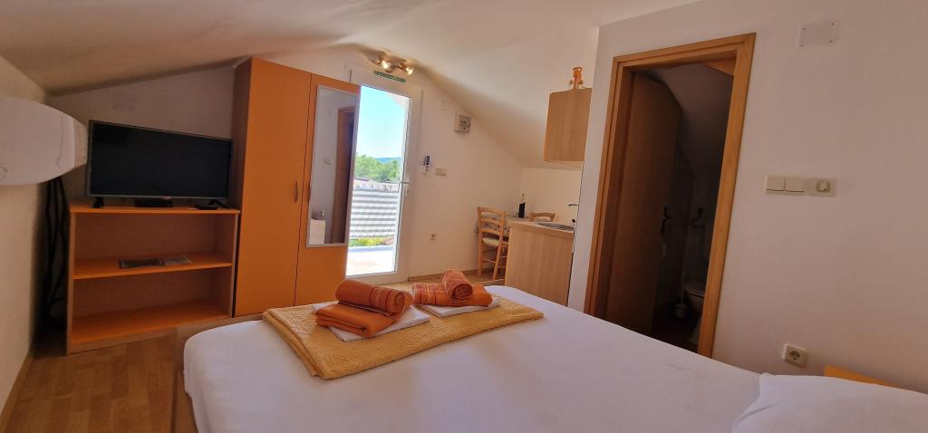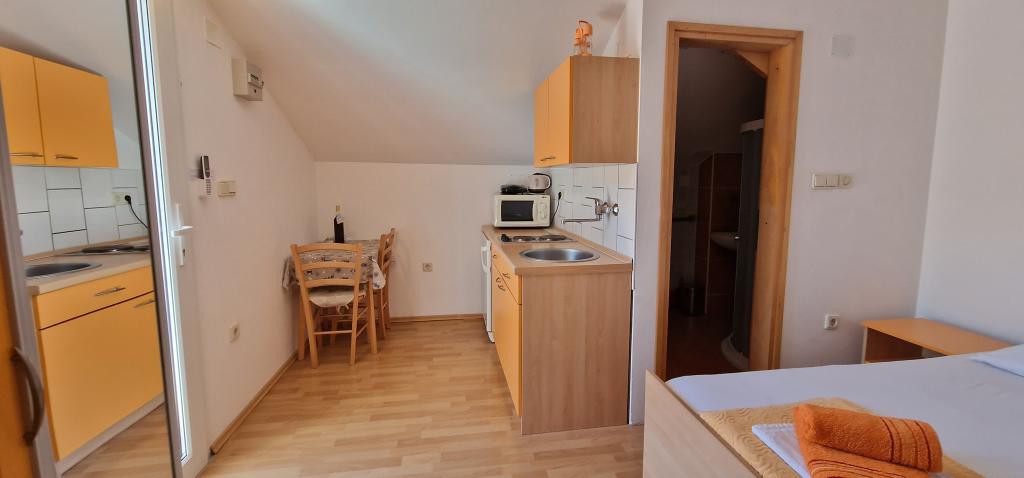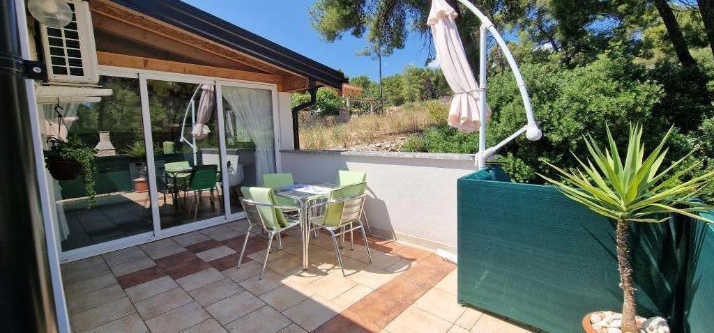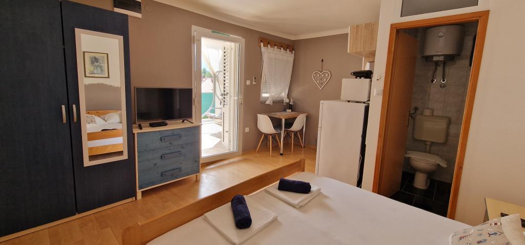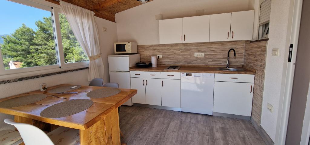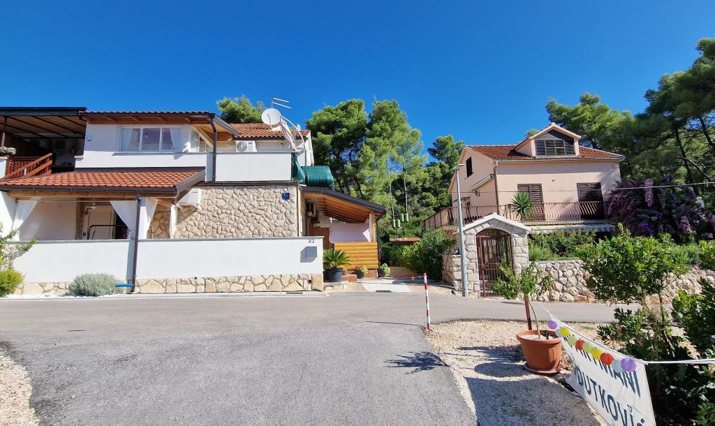 Our house is located at the very beginning of the peninsula in a village called Zaglav, so the sea is on two sides, i.e. the first bay is already 100 m away, while on the other side it is a slightly greater distance (about 500 m). The house consists of six apartments of different sizes (for 2-4 people). Each apartment has its own bathroom, kitchen and terrace. In front of the house there is a parking lot only for the guests of our house. Guests can use the outdoor barbecue (electric). The distance from the house to the center of Vrboska, i.e. to the shop, post office is about 900 m. The road to the center and the main city beach Soline runs along the seashore. The distance from the bus stop is 900 m. The distance from the ferry port is 10 km (Stari grad). The distance from the pharmacy and ambulance is 6 km (Jelsa) where there is also an emergency medical service. The distance from the gas station is 5 km. Water supply: local water supply Type of beach: sandy, rocky, pebble, larger stones and concrete slabs Access by personal vehicles to the facility: good