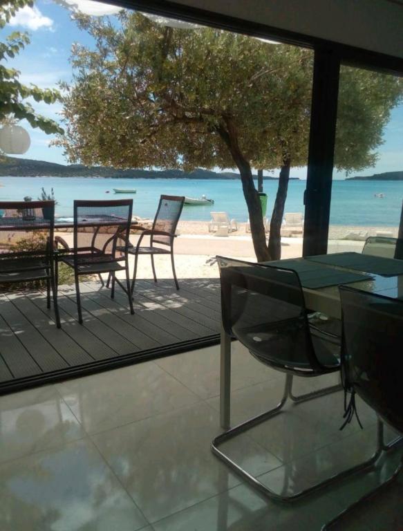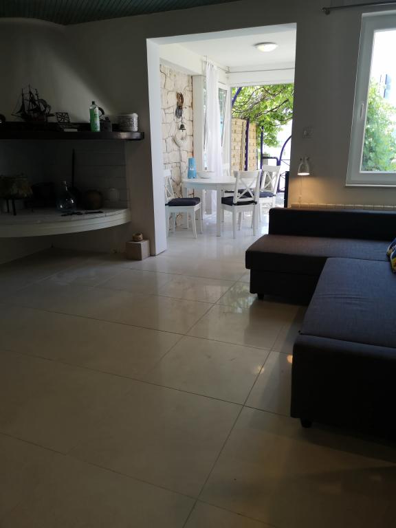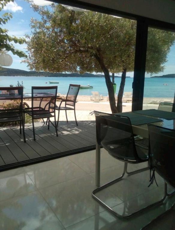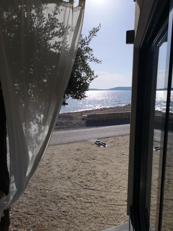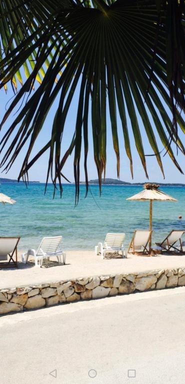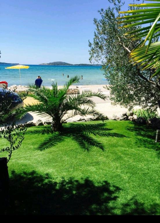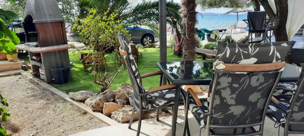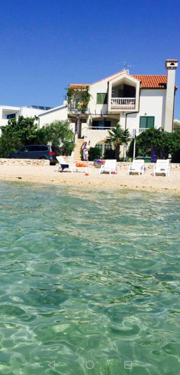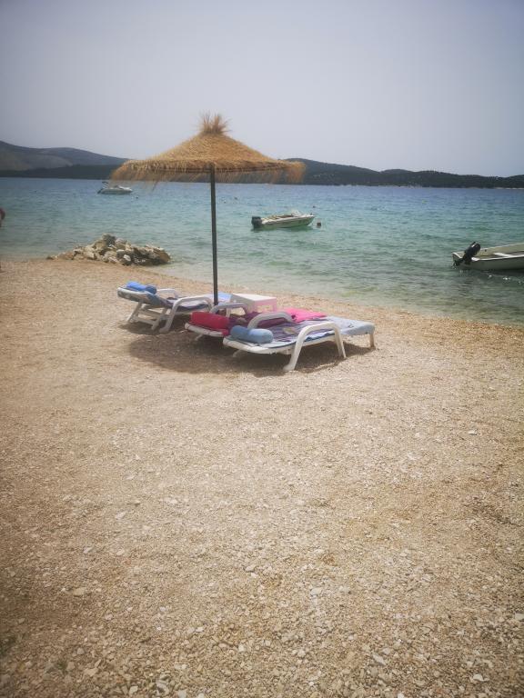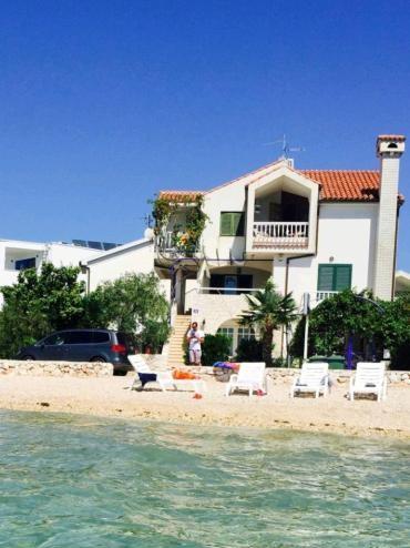 Completely and modernly equipped apartments in a quiet place Zaboric near Sibenik, located first row to the sea. The beach is right in front of the building at a distance of 5 meters from the apartment. All apartments have a sea view. All apartments are equipped with all household appliances from dishwasher, washing machine, microwave, hob, oven, kettle, refrigerator with freezer,, TV SAT, WI-FI internet, hair dryer, toaster. Some apartments have an ice machine. All apartments have free parking, and free use of barbecue in the yard as well as free beach chairs. Pets are allowed. Possibility to use boat moorings up to 7 meters, and parking for the trailer. Baby cot on request. Guests can relax on a hammock in the shade of the garden. It is possible to rent a boat and jet ski next to the house. There is a water trampoline for children nearby, as well as a land trampoline.