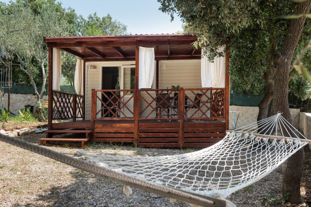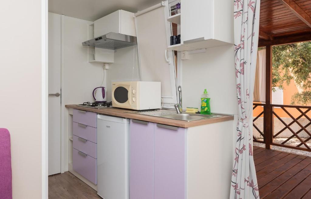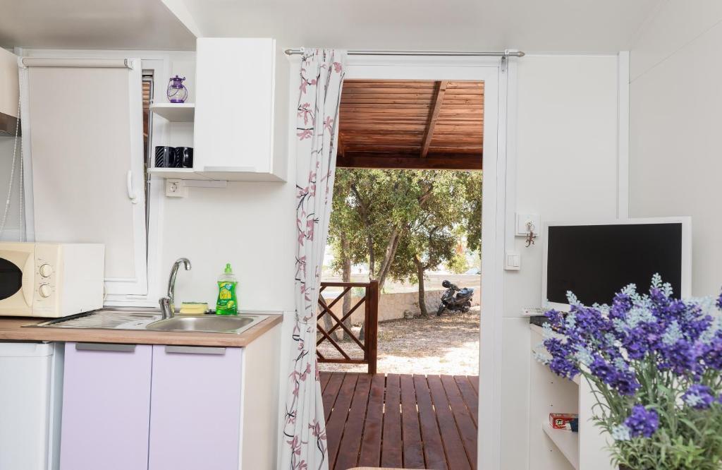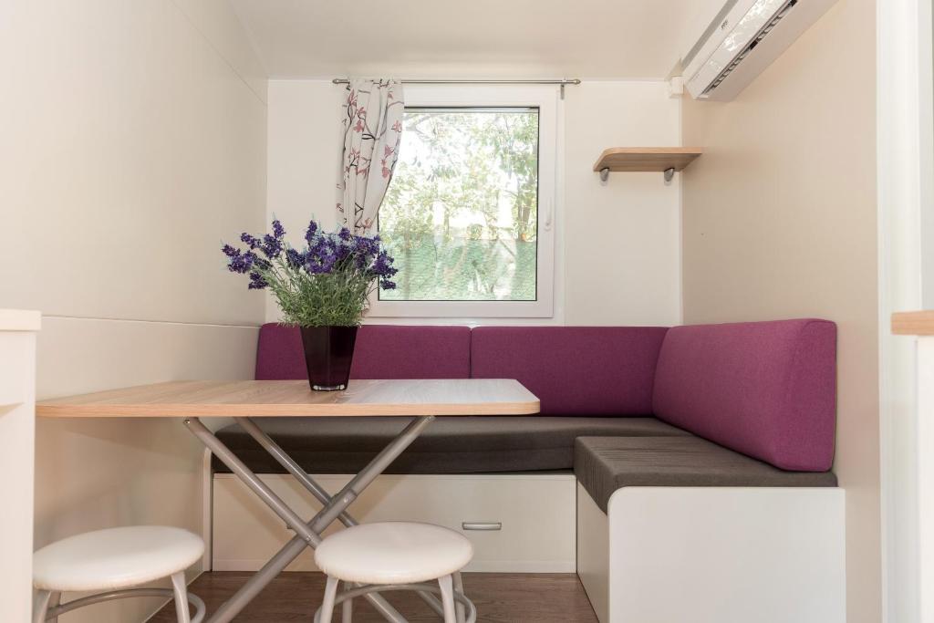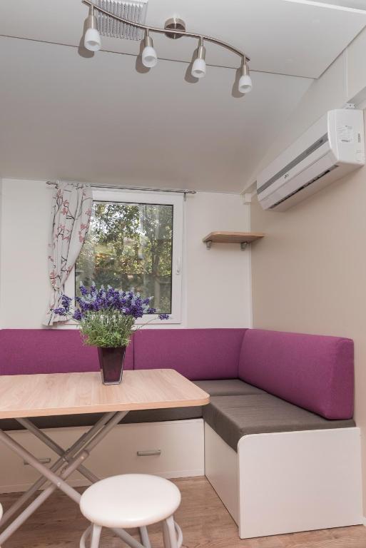 The mobile home is located in the center of Žaborić. It consists of one bedroom, bathroom, kitchen and dining room. The mobile home has a large terrace with a table, chairs and two deck chairs. Parking is provided and is located right in front of the house.