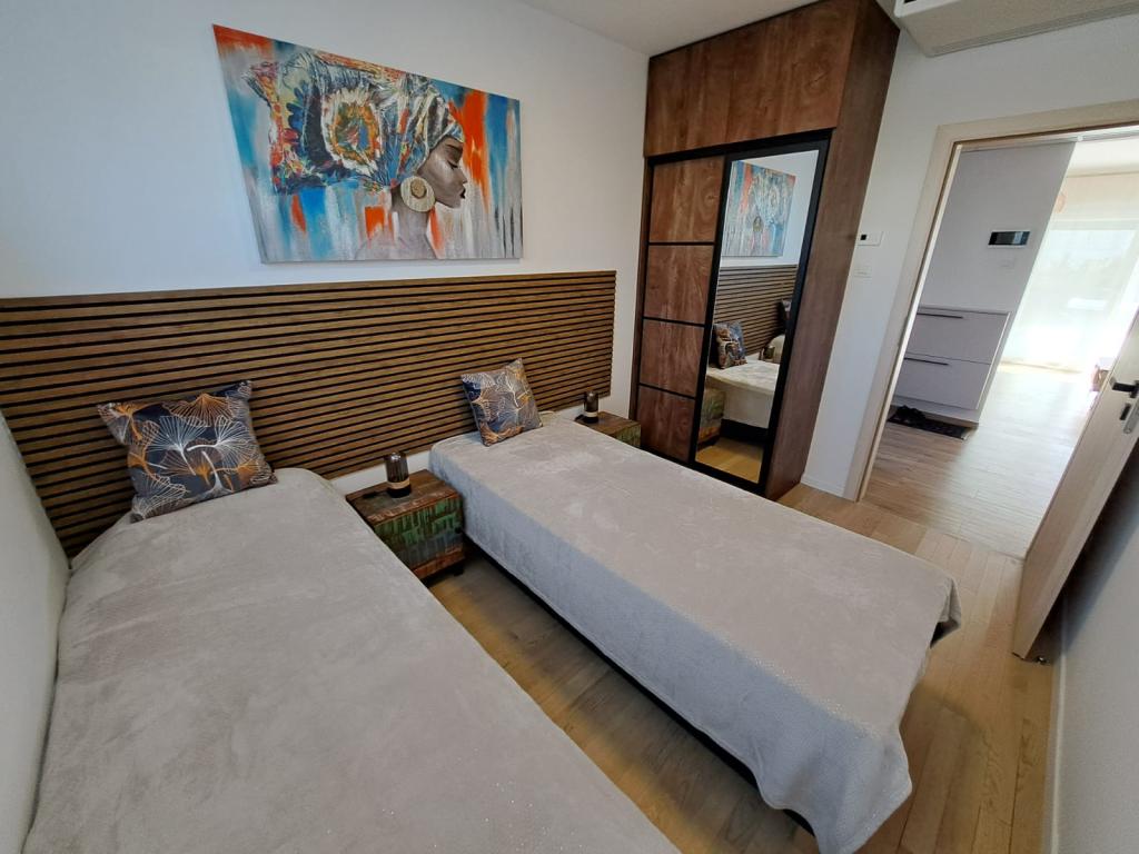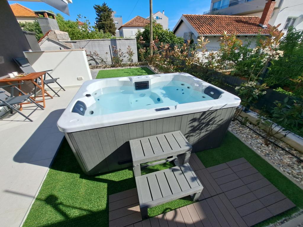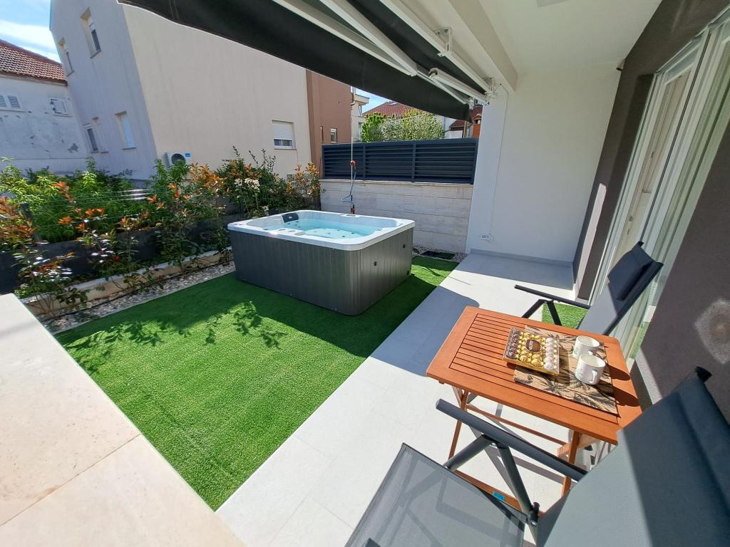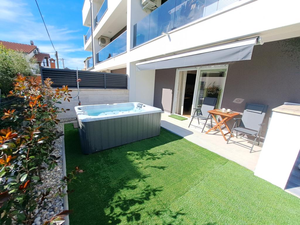 APARTMENT EQUIPMENT: - cooling and heating in every room (heat pump, underfloor heating in the bathroom) - WiFi - TV - washer-dryer - dishwasher - oven with microwave - induction stove - fridge - dishes, cooking utensils, cutlery - electric kettle - coffee maker (capsules) - kitchen cloths - bed linen - towels - jacuzzi towels - hair dryer - safe - set of garden furniture - outdoor shower - clothes dryer and clothespins - basic cleaning products The apartment does not have a grill. Excellent rotisserie dishes can be purchased in nearby restaurants. DISTANCES: 600m - Višnjik sports and recreation center (indoor swimming pools, tennis and paddle courts, football, basketball, table tennis, jogging tracks, outdoor gym, children's playgrounds, trampoline park, mini golf, bouncing castle, rollerblading track/ during winter- ice rink), 1.8 km - old town, 2 km - Kolovare beach, 1.6 km - main bus station, 10 km - Zadar Zemunik airport