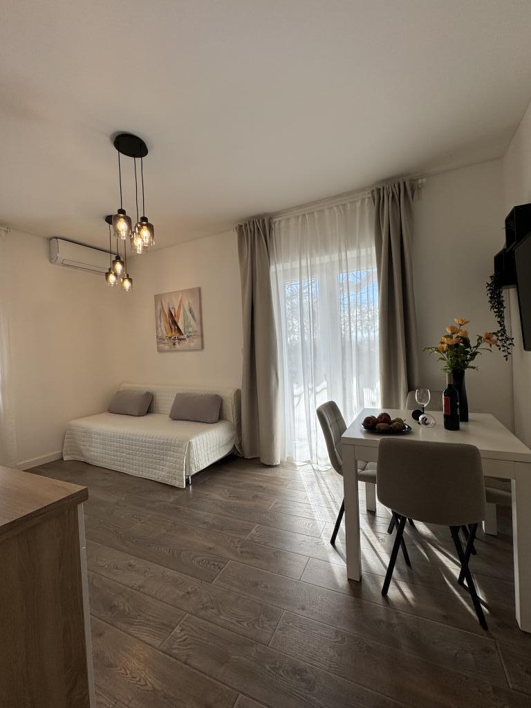 In July we were in studio Apartment. Apartment is completely new, so beautiful and cozy, with sweet little details. Terrace is distanced so we completely had privacy. I enjoyed reading book on sunbeds in the flowery garden. Sand beach is 3 min walk, old town is really near. Hosts were helpful with recommending restaurants, therefore I recommend this place for everyone.