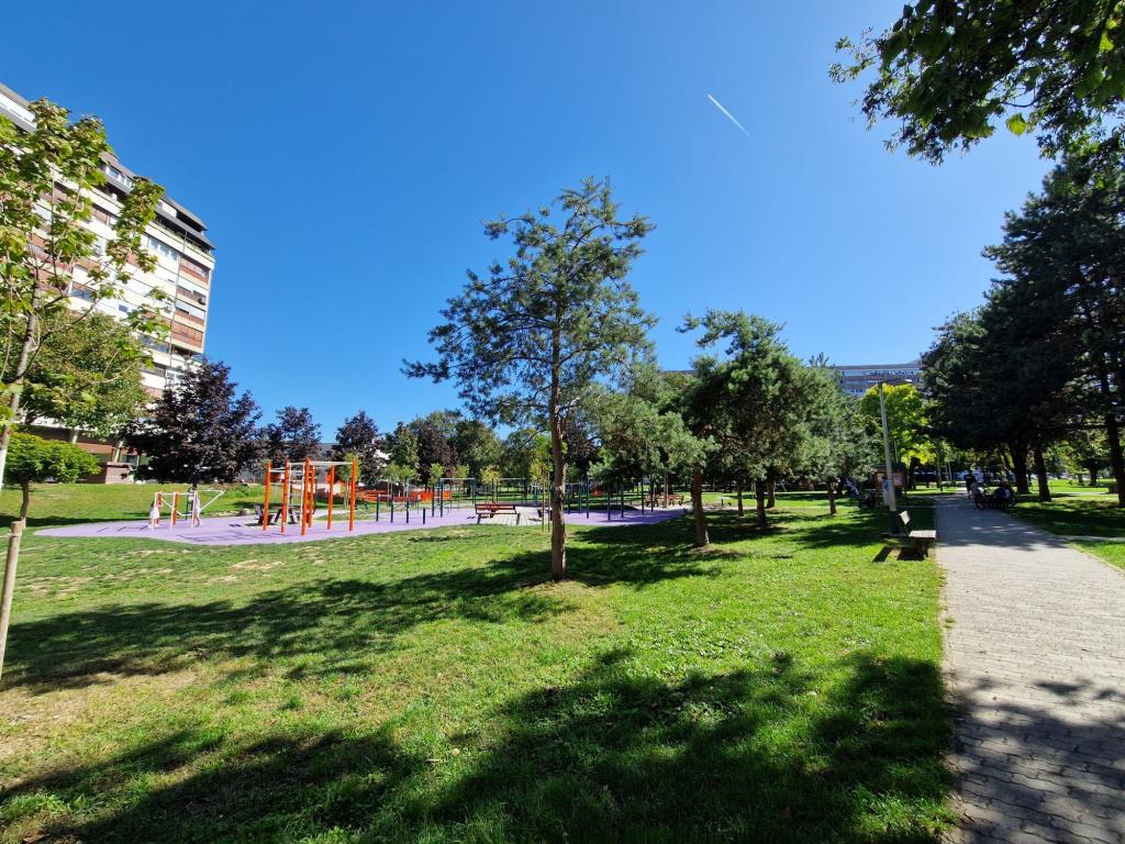 Enjoy with your family in this modern, completely and newly renovated accommodation in a bright and comfortable apartment whose location has numerous advantages. 10 minutes from all Zagreb destinations, the main square, parks, congress center, concert halls. Plenty of greenery and parks, excellent public transport, 15 minutes from the airport, easy to get to from all directions. The apartment is located in a building in a quiet, family-friendly neighborhood with a school and parks, a lake, a museum, many restaurants and cafes, large shops and malls. There is a good transport connection between the settlement and the city center, which is 10 minutes away by car or public transport. Very safe neighborhood full of children and young people. The parking lot in front of the building is charged, and in the immediate vicinity (across the road) there is a parking lot that is charged less than 1 Euro all day.