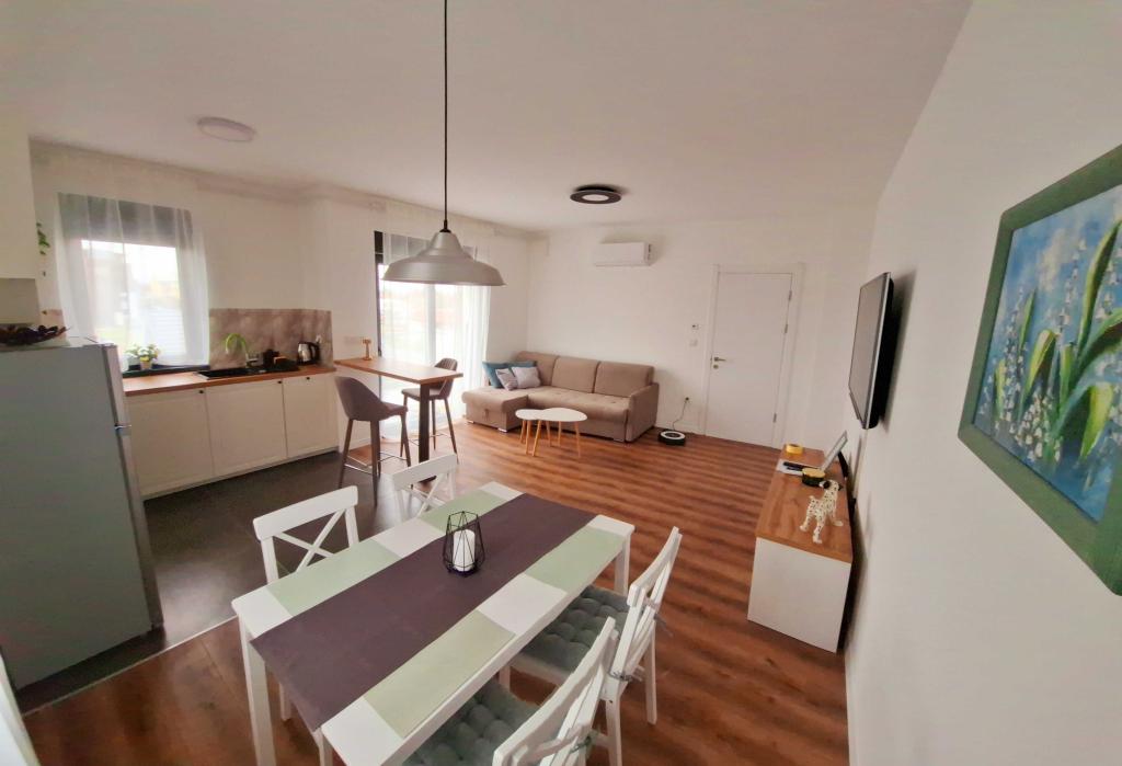 MODERN 2+2 APARTMENT FOR RENT IN ZAGREB – DAILY RENTAL (BANI 76) A fully equipped, modern 2+2 apartment is for rent in a prime location in Zagreb, in the quiet neighborhood of Bani, Bani 76 street. The apartment is ideal for couples, families or business travelers who want comfort, privacy and good connections to the city. Apartment description: The apartment consists of a comfortable bedroom with a double bed, a modernly decorated living room with a corner sofa bed (2 additional beds), a fully equipped kitchen and dining room, a bathroom with a bathtub, and a hallway and entrance area. The living room opens onto a spacious balcony, ideal for morning coffee or evening relaxation. Amenities: Free Wi-Fi Air conditioning Smart TV Washing machine Fully equipped kitchen (fridge, oven, hob, microwave, kettle) Clean towels and bed linen Hair dryer and basic toiletries Parking available in front of the building