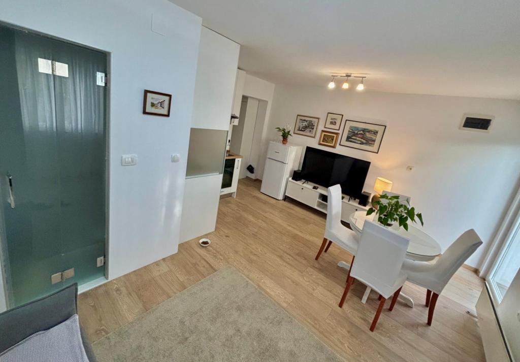 The studio apartment is fully and modernly equipped on the first floor of a family house, which is 30m from the sea and a beautiful pebble beach with a gradual entrance to the sea. There is parking for a car in front of the house, and in the yard there is a gazebo with a barbecue and tables for staying in the shade. Nearby are shops, restaurants, a pastry shop, and at the entrance to the town is the Plodine shopping center.