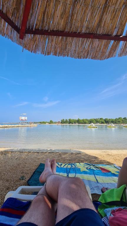 Everything is as in the picture.. Clean, pleasant, comfortable, all inclusive... All you need is this... Toaster, kettle, oven, 5-gas stove, large dishwasher, fridge, freezer, you name it.. The owners are pleasant, whatever you need they are there. They take care of everything and find a quick solution for everything... Hats off... Then a bakery, fitness on the beach, games on the beach, markets on the beach, cafe and ice cream shop on the beach, pancake maker, toilet on the beach... All this from the apartment 150 m... World... The beach is small pebbles, and then at least 300 m of water a little above the knees... Ideal for children... In the evening after 6 p.m., you can walk around the Zaton camping resort park for free Here you can find inflatable games, merry-go-rounds, restaurants, markets... We'll get there