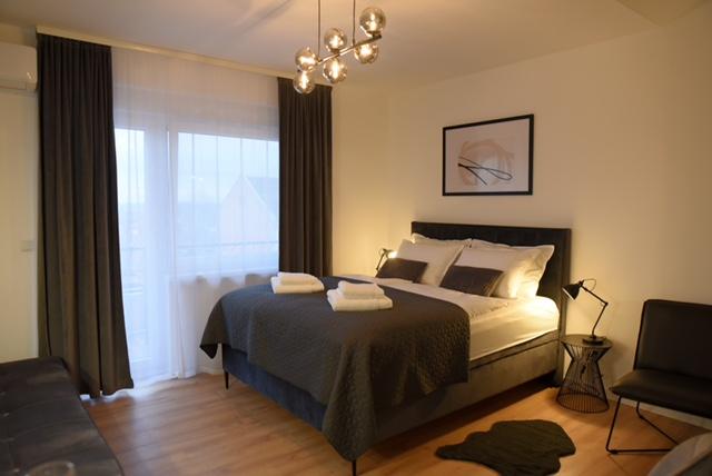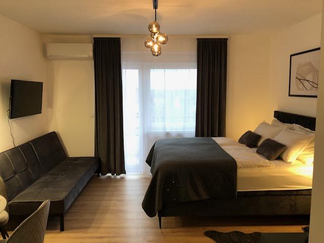 Studio apartment Mia is located in the center of Županja. The apartment is newly renovated and modernly and luxuriously equipped. It consists of one room with a large double bed, one pull-out bed, a sitting area, a flat-screen TV, free WiFi, an equipped kitchen with a refrigerator, microwave oven, coffee machine and other appliances, a separate bathroom with a washing machine and cosmetics, a hallway with a wardrobe, and a balcony with a view of the city. The apartment is located in a residential building that does not have an elevator on the 4th floor. There is a public parking lot in front of the building, which is charged, the price per hour is €0.40.