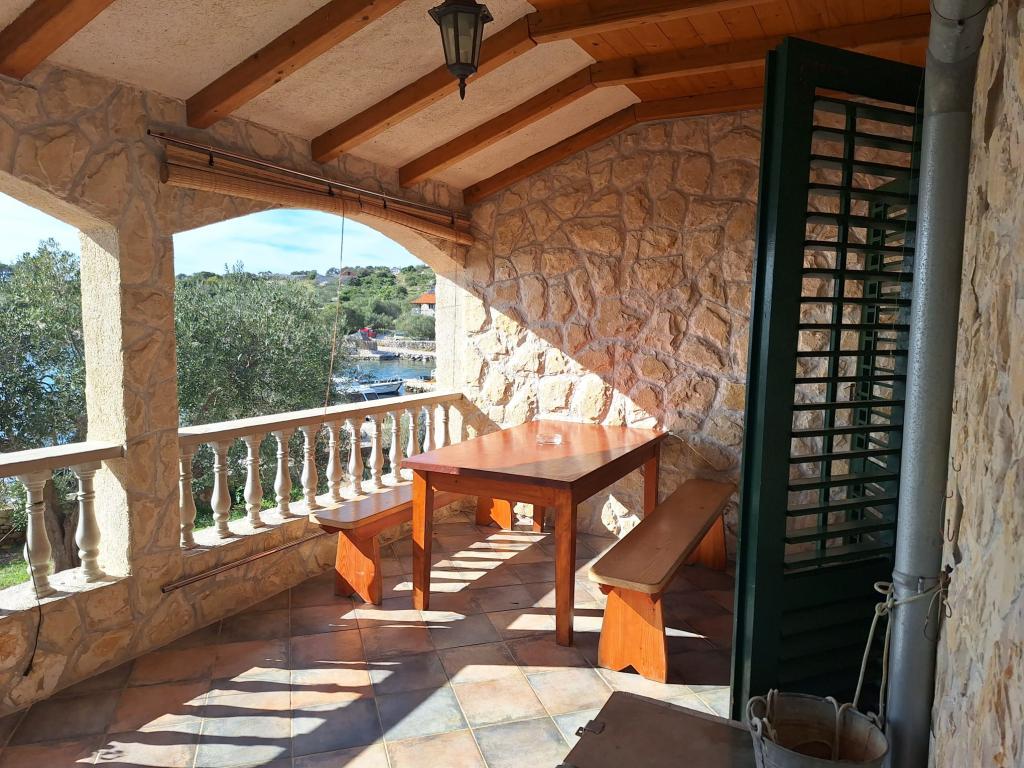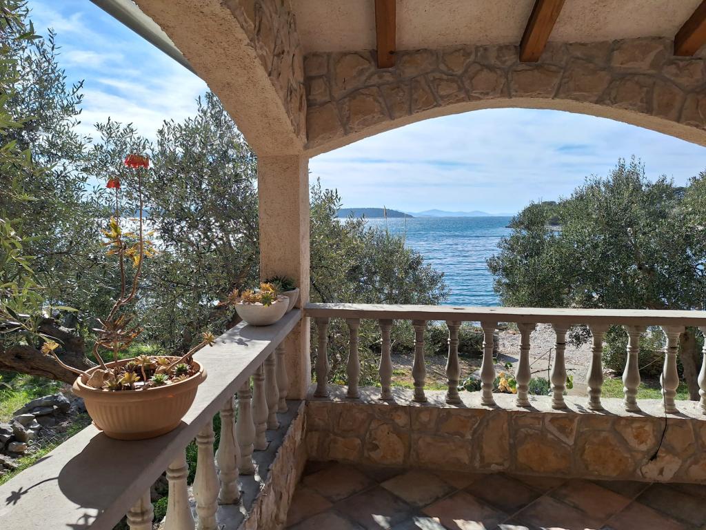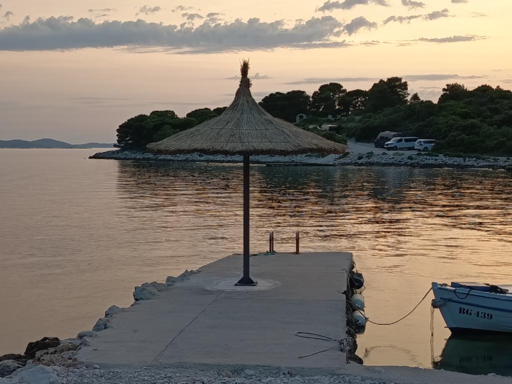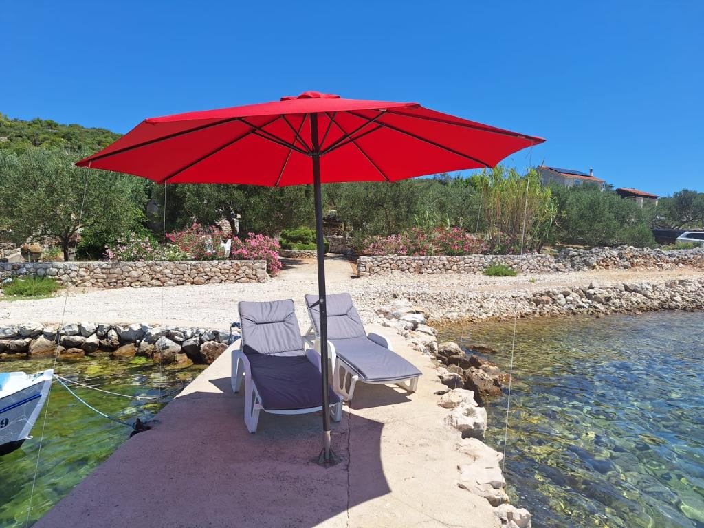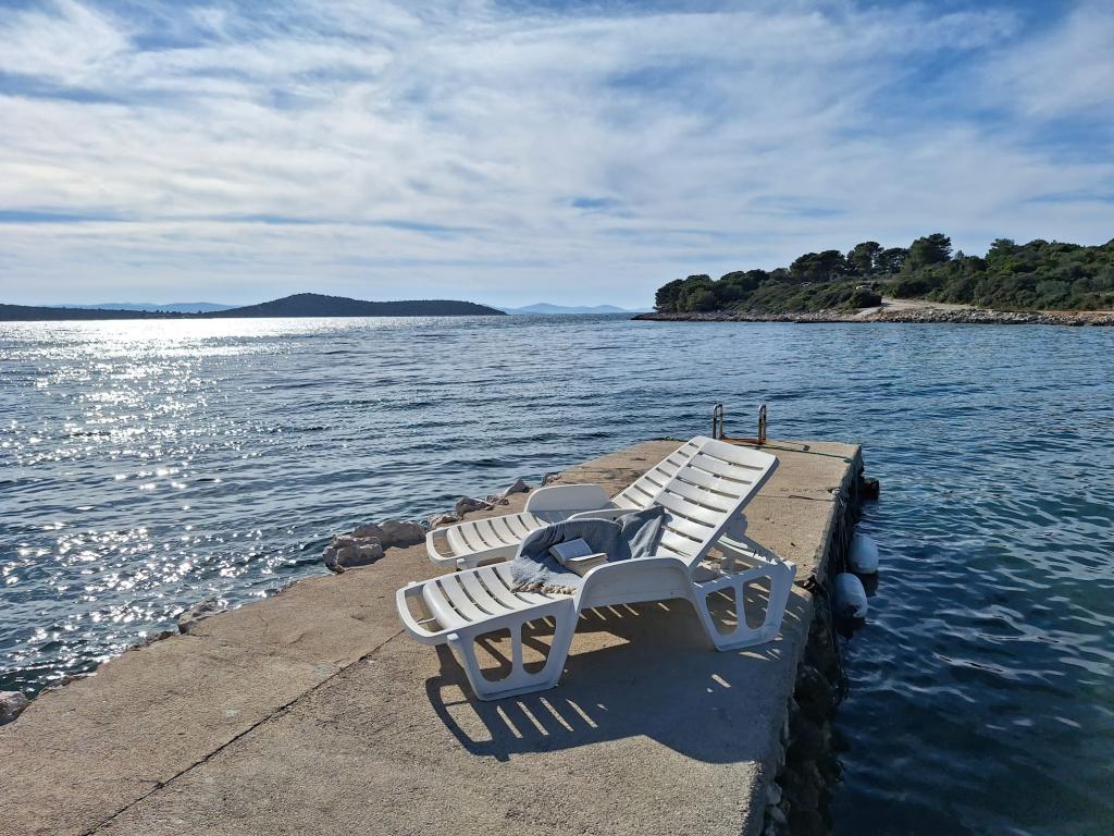 The Robinson house Cvita is located on the south side of Pašman, in Vitane bay. It is 4.5 km from Tkon. Tkon can be reached by ferry from Biograd (15 min. drive). The property has two bedrooms with a ceiling fan for a comfortable sleep, a bathroom with a shower, a living room with a kitchen and a covered terrace with a grill. The house is equipped with 220v electricity via solar collectors, hot water, wi-fi, solar shower, parking... In the living room there is a pull-out sofa (extra bed for two). In front of the building is a jetty for mooring boats. There are 4 deckchairs with umbrellas on it.