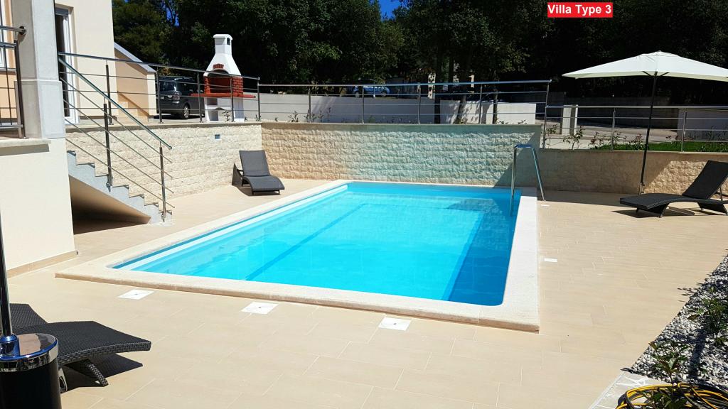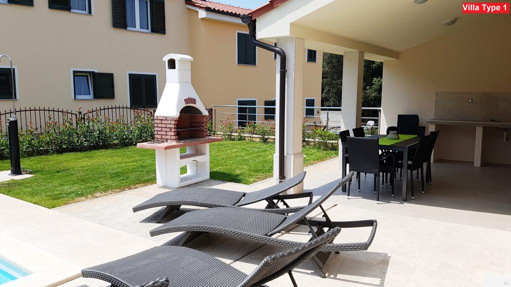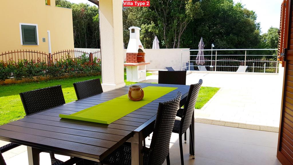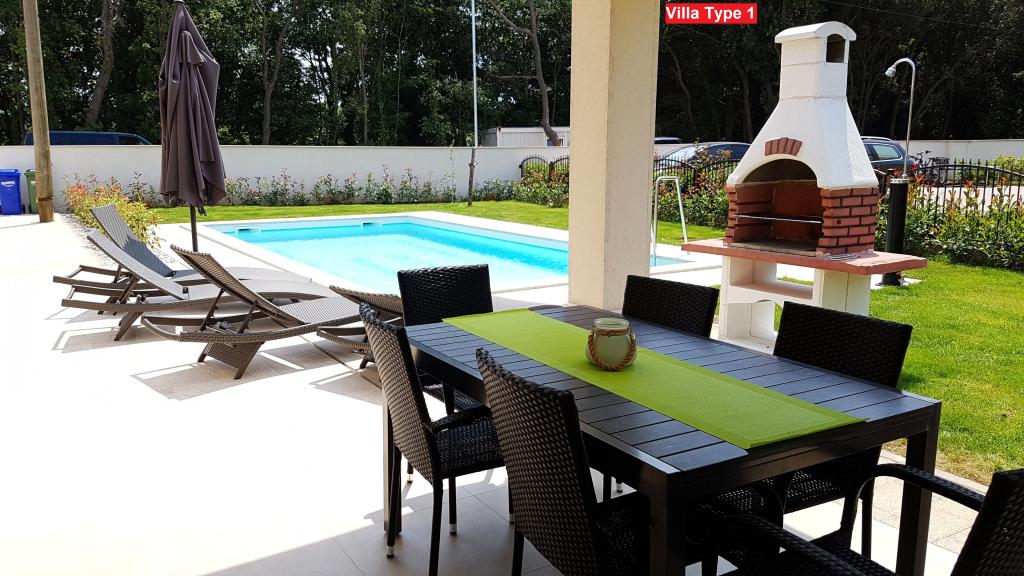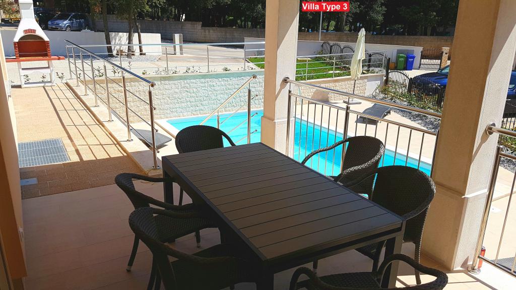 There are 3 types of villas that you can choose from. All villas have the same interior, you just need to choose Villa Type 1, Type 2 or Type 3! The villa can host up to 8 plus 2 guests. There are 4 bedrooms in the Villa, each with its own bathroom. Relax in the cozy living room and prepare delicious meals in the fully equipped kitchen with dining room. You can relax by your private pool, lie on the deckchairs and enjoy the beauty of the sun. You can also prepare specialties on the charcoal grill for your friends and family. If you want to go to the beach, just bring a towel and you're on the beach in a few minutes' walk, but there are also amazing restaurants within walking distance. The villa is air-conditioned, has WiFi, private parking for 3 cars and offers everything for a pleasant vacation.