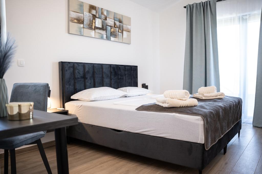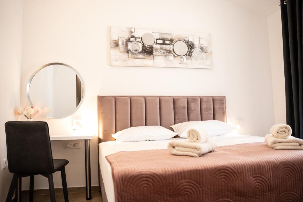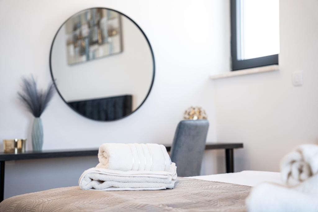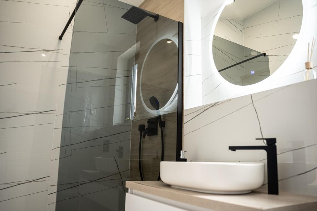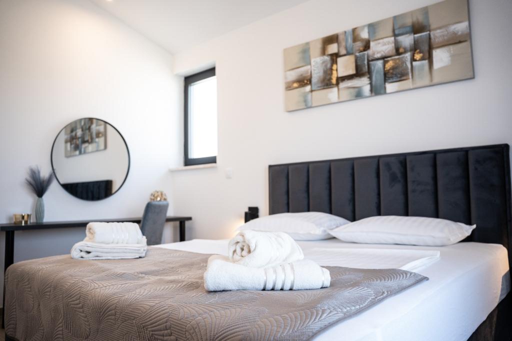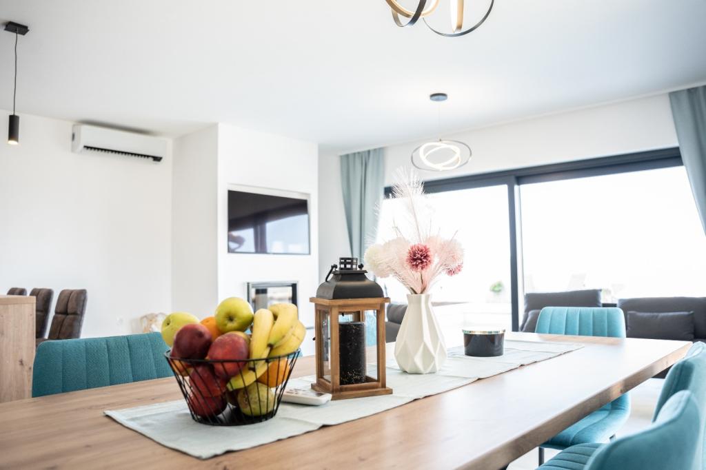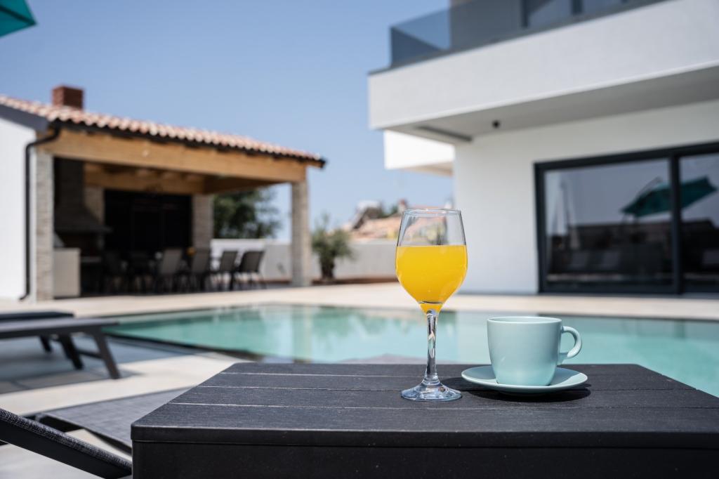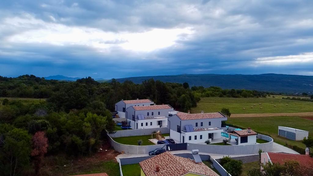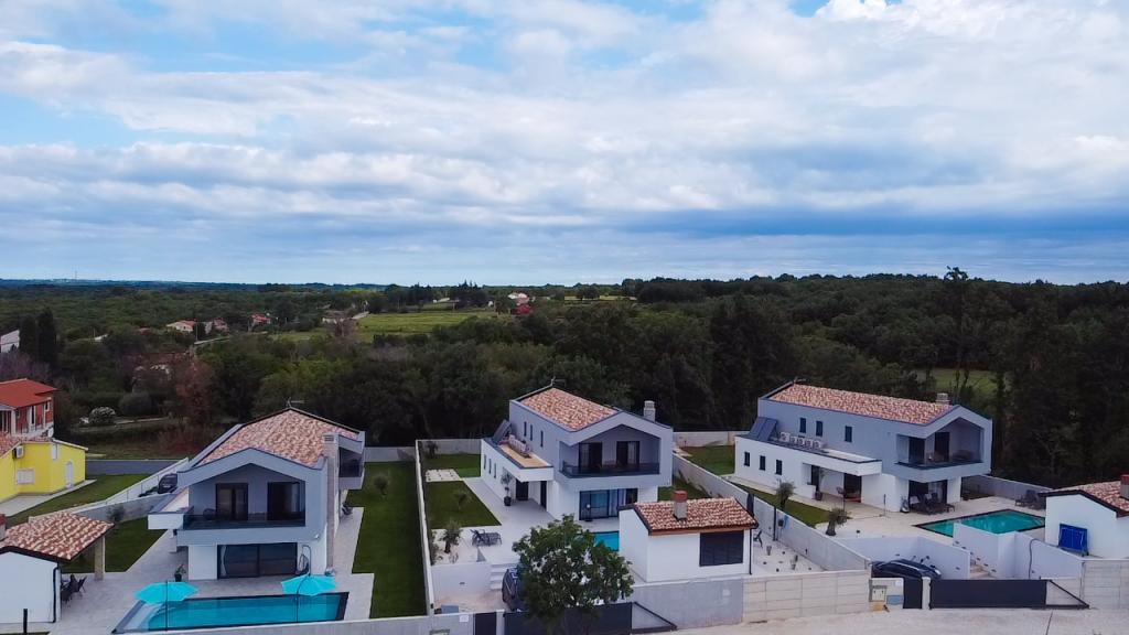 This beautiful villa is located in a very quiet place Rebići, Barban, only 2.5 km from the sea, surrounded by natural beauty and greenery, and as such serves for a carefree and perfect vacation, far from city crowds, noise and traffic. On clear days, you can see the sea from the balcony on the first floor of the house. Each room has its own terrace for moments of privacy and peace when needed. The villa is decorated in a very modern way, giving you the atmosphere and warmth of home, it was built in 2023 in a very modern style and it also contains an outdoor facility with an outdoor kitchen, a fridge and two grills, gas and wood-burning. The environment is specially arranged in a combination of a modern beach around an infinity pool measuring 10 x 3.8 meters and a beautiful lawn decorated with old olive trees and other various plants, creating an oasis for relaxation. in the yard there are deckchairs, umbrellas and additional facilities such as table tennis, table football.