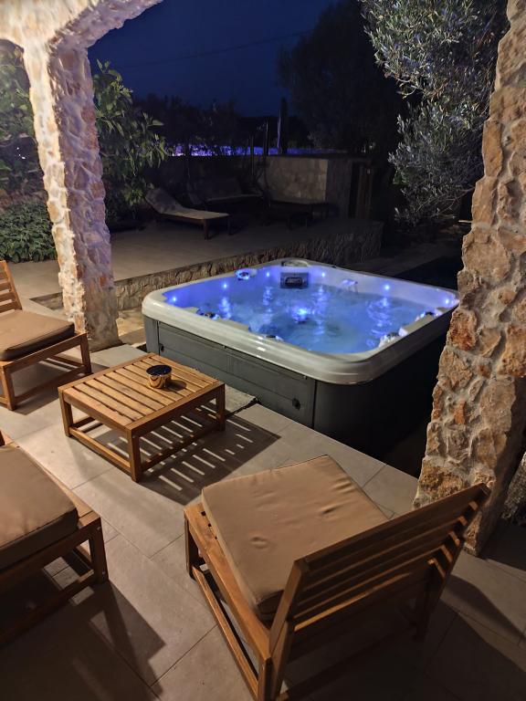 Beautiful, natural and peaceful place. House with jacuzzi for rent on Drvenik Mali, approximately 150 meters from the sea. The house consists of two bedrooms, a living room with kitchen and dining room and a bathroom. The most beautiful part of the house is the terrace with an open fireplace-stone barbecue. Drvenik Mali is surrounded by the clear waters of the Adriatic Sea, an island near the town of Trogir and the town of Split. It is connected by a small ferry that sails four times a day during the season. Drvenik Mali is a very peaceful island, so much peace, unique natural beauty and exceptionally clear sea. This is the perfect holiday destination "far from the city crowds" and is a real challenge for all modern Robinsons. If you are looking for lush Mediterranean vegetation, an original atmosphere and an authentic island atmosphere, Drvenik Mali is the right choice for you.
