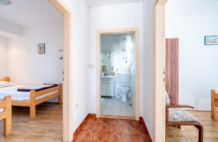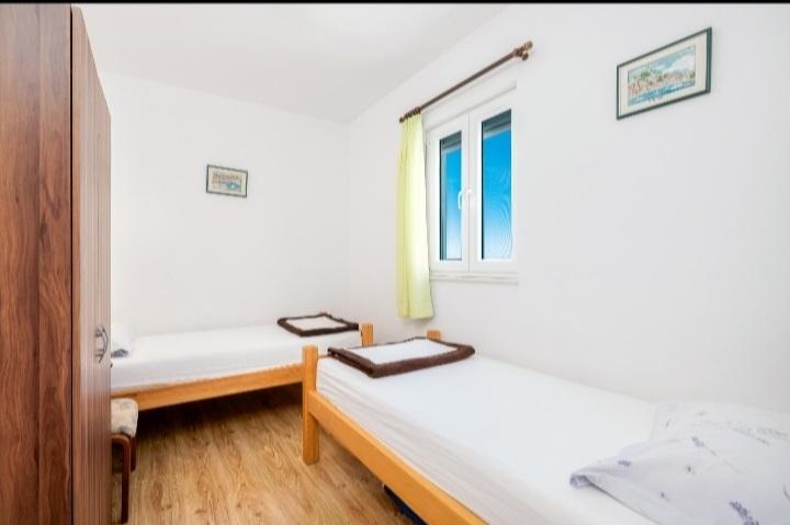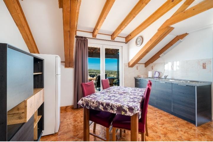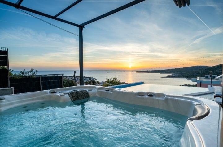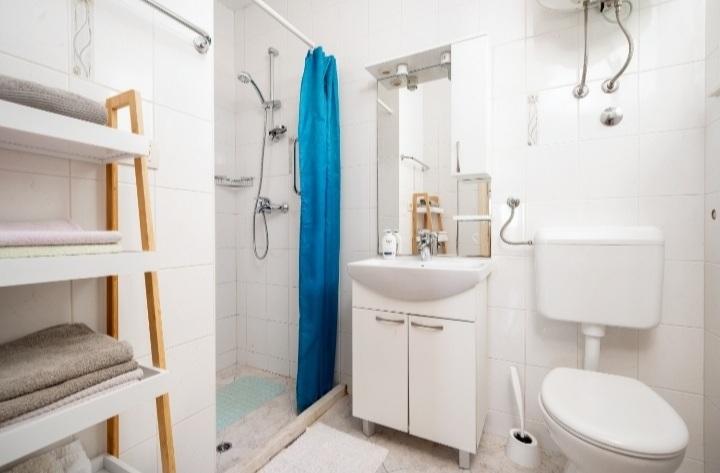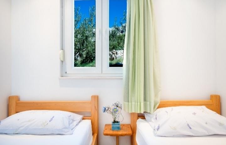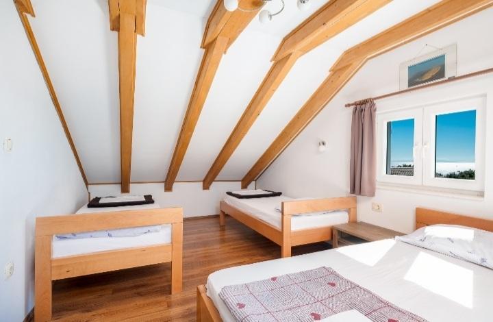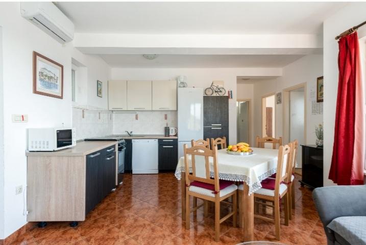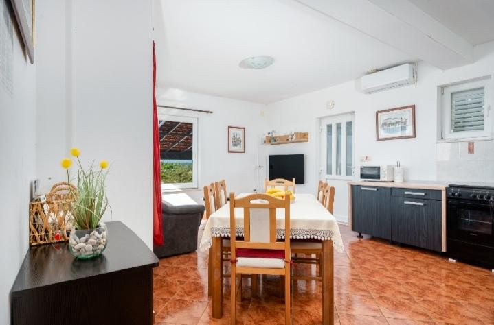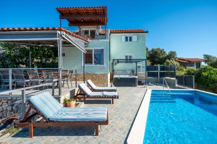 The holiday house with a swimming pool and a heated massage tub is located on a hill with a beautiful view of the open sea. It is ideal for a peaceful vacation for a large family or group of friends. At the same time, sports and entertainment facilities are easily available; landscaped bicycle paths, sandy, concrete and gravel beaches next to the crystal clear sea. Restaurants and night clubs are 5 to 10 minutes away by car. The house has a total of ten beds and two sofa beds, two modern kitchens, two bathrooms and two toilets. The kitchens are equipped with dishes for preparation and utensils for serving meals. In one kitchen there is a dishwasher, coffee maker, microwave oven, kettle, toaster. Guests have at their disposal two covered terraces, a large open terrace next to the pool, a barbecue, parking for three cars, a swimming pool (40 m2), deckchairs, an outdoor shower and a fenced playground for children. Final cleaning, air conditioning, pool maintenance, tourist tax and internet are included in the price. Welcome!