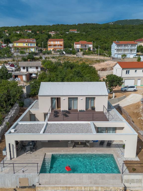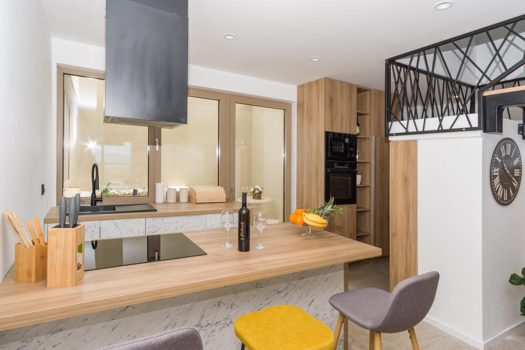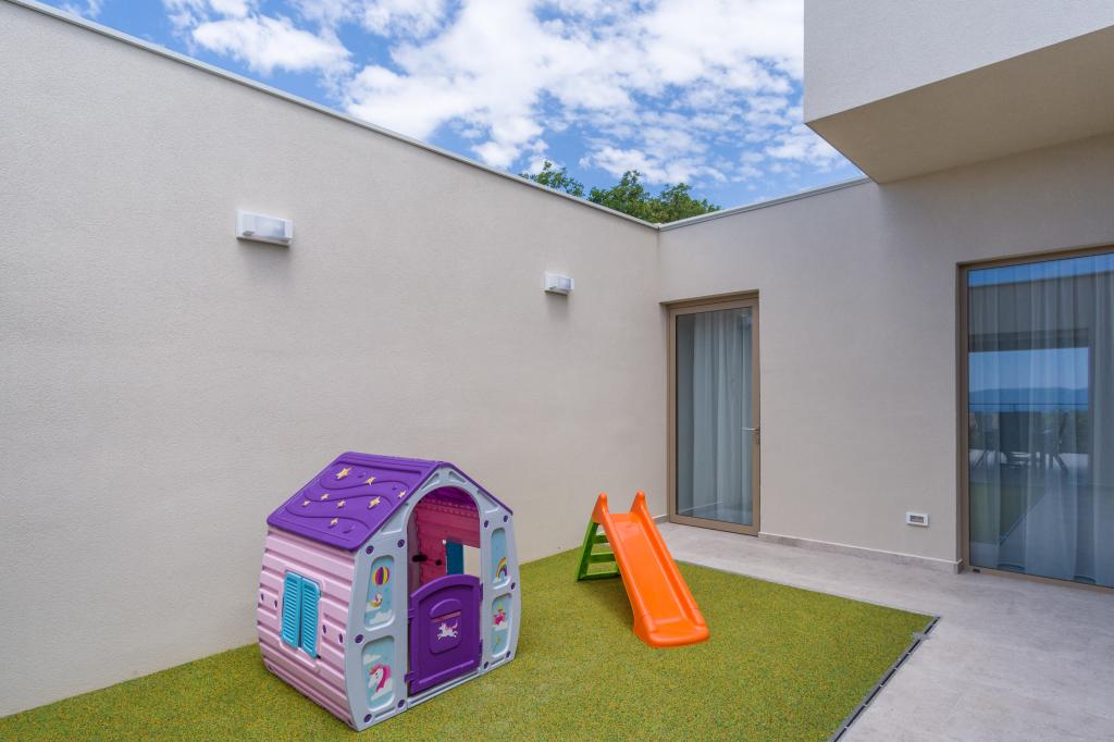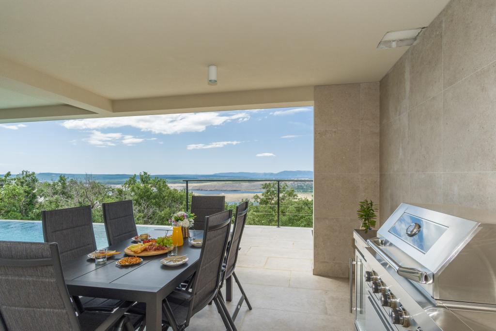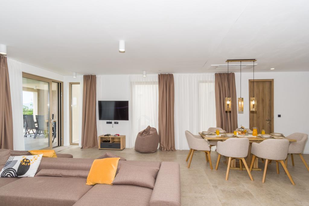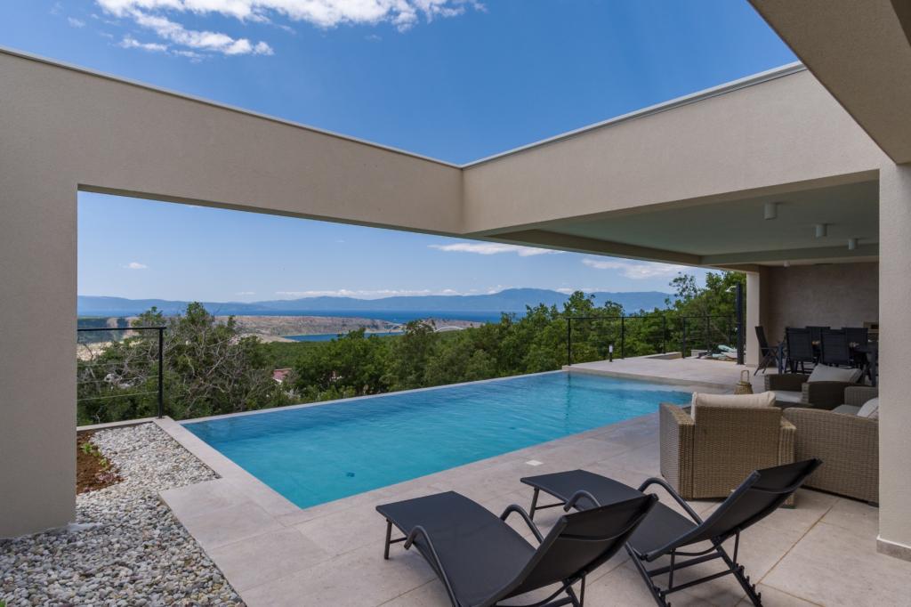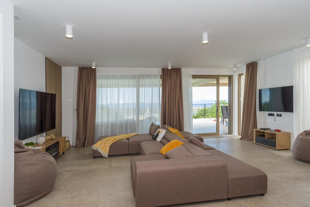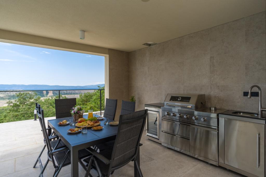 New. A fully equipped new villa with a swimming pool measuring 9x4 m is located in Šmrika, near the tourist resort of Crikvenica. The villa is located in a quiet place and is hidden from view. From every corner of the house there is a view of the sea, the island of Krk, the island of Cres, Istria, and from the terrace on the first floor, Rijeka and Opatija. The villa has 3 large bedrooms and a bathroom in each room and a large living room with kitchen and dining room. Next to the pool there is also an outdoor kitchen with a gas grill. To keep the children from getting bored, there is a play station 4, and for the youngest there is a playground with a house and a slide. Adults can relax in the gym. Next to the kitchen there is a small garden with spices that can be used in cooking - basil, rosemary, cherry tomatoes... The distance from the sandy beach in Jadranovo is 4 km. At a distance of only 1 km, there is the Bura karting track and a donkey farm, extremely attractive for children.