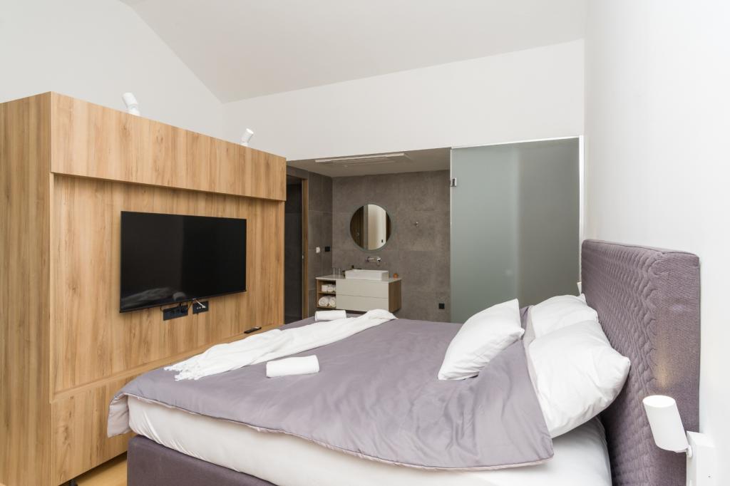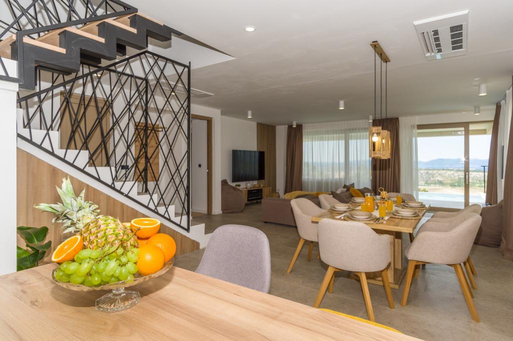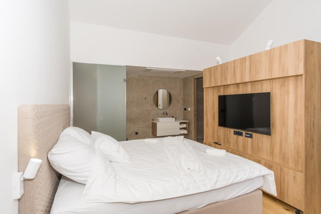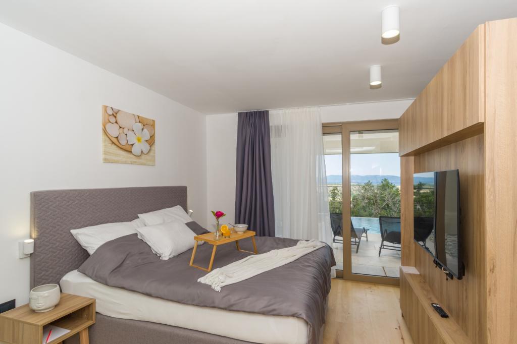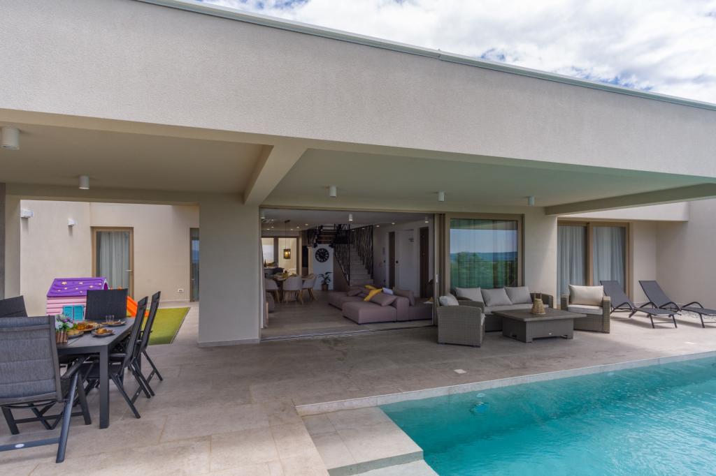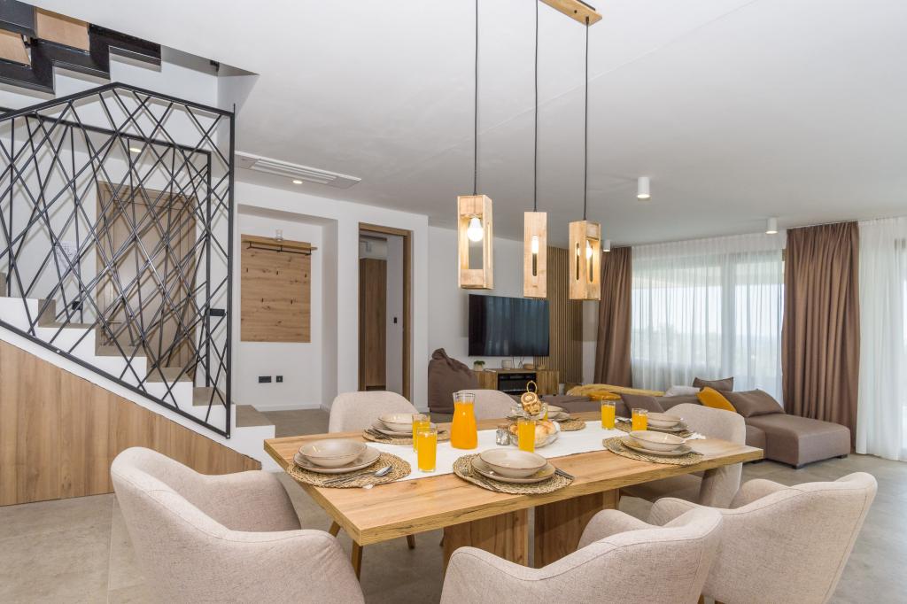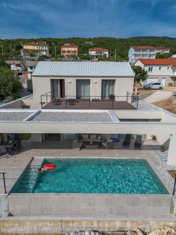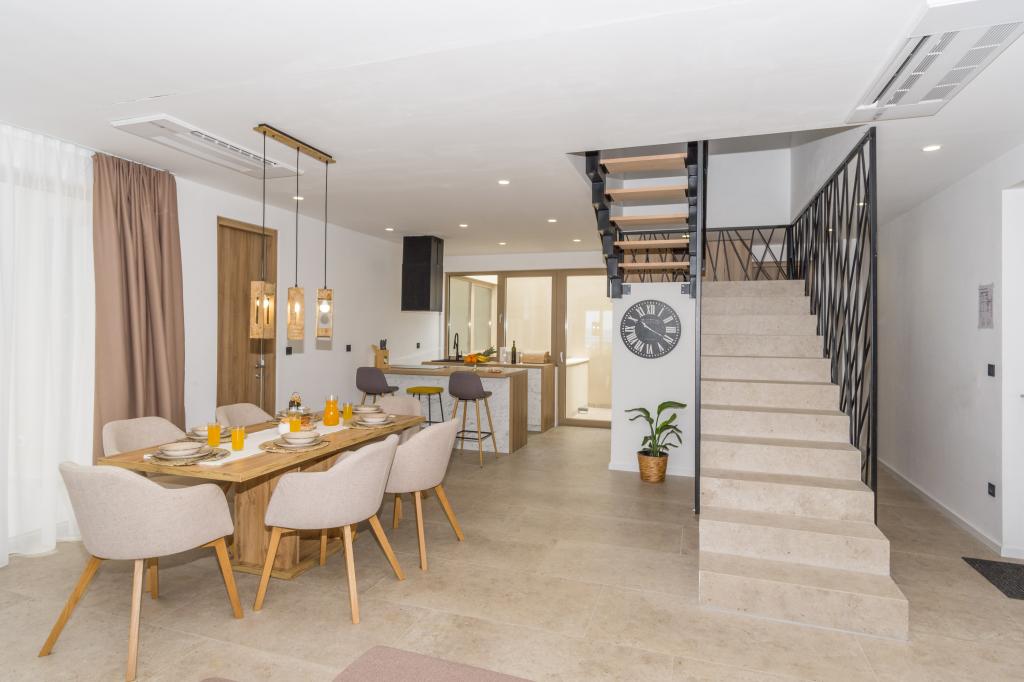 New. A fully equipped new villa with a swimming pool measuring 9x4 m is located in Šmrika, near the tourist resort of Crikvenica. The villa is located in a quiet place and is hidden from view. From every corner of the house there is a view of the sea, the island of Krk, the island of Cres, Istria, and from the terrace on the first floor, Rijeka and Opatija. The villa has 3 large bedrooms and a bathroom in each room and a large living room with kitchen and dining room. Next to the pool there is also an outdoor kitchen with a gas grill. To keep the children from getting bored, there is a play station 4, and for the youngest there is a playground with a house and a slide. Adults can relax in the gym. Next to the kitchen there is a small garden with spices that can be used in cooking - basil, rosemary, cherry tomatoes... The distance from the sandy beach in Jadranovo is 4 km. At a distance of only 1 km, there is the Bura karting track and a donkey farm, extremely attractive for children.
