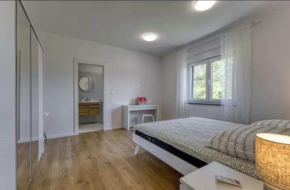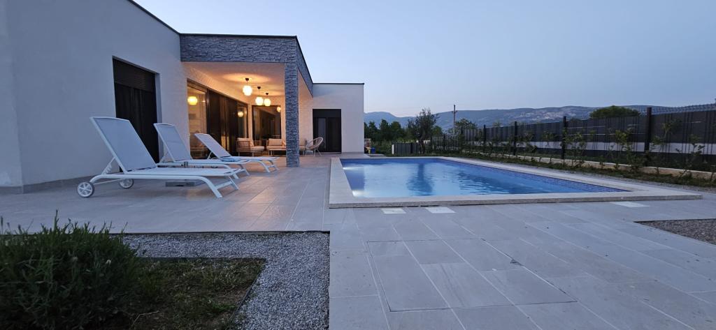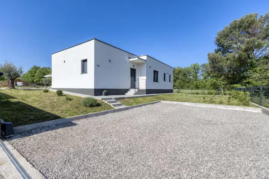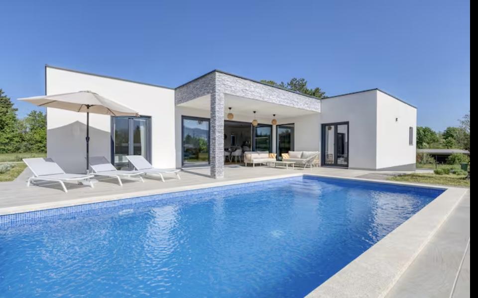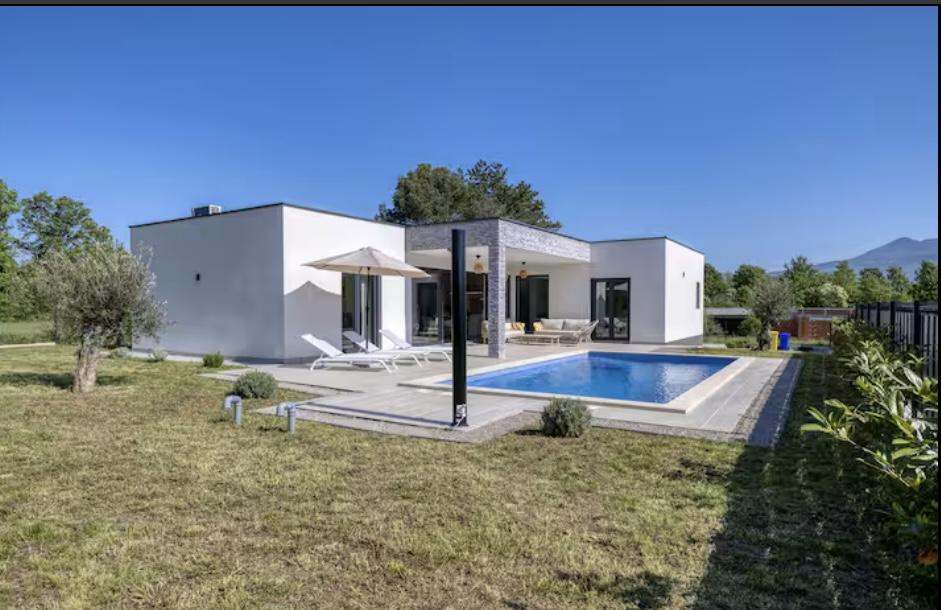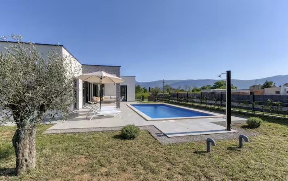 Villa Marina is located in the peaceful village of Blaškovići, located right next to the picturesque town of Kršan. This newly built modern single-storey house is an ideal place to escape the city bustle and relax in natural surroundings. Inside the house we find three spacious bedrooms, each with its own bathroom. Two bedrooms have direct access to the pool terrace. The spacious living room with dining area and kitchen is surrounded by a glass wall, providing plenty of daylight. The kitchen is equipped with all necessary appliances and utensils and is an ideal place to prepare delicious meals. The living room leads to a partially covered and uncovered pool terrace, and from the kitchen there is access to a second terrace, so that it is possible to use the space in the sun or in the shade, depending on the time of day and year. The terraces have comfortable furniture and deck chairs, as well as a barbecue, perfect for relaxing in the fresh air and preparing meals. Villa Marina has an excellent location, close to the towns of Pazin and Labin and the coast of Rabac.