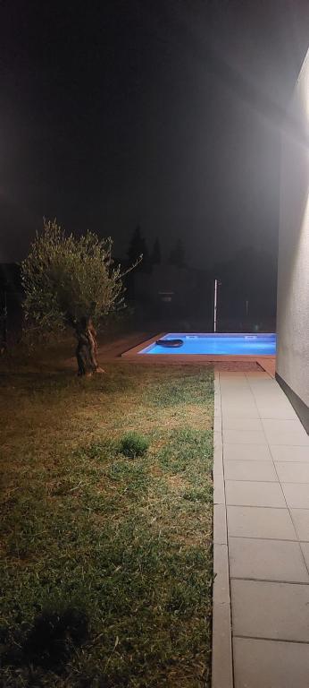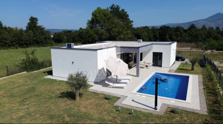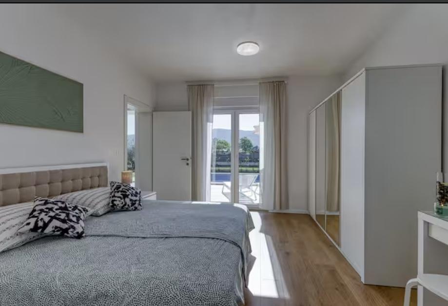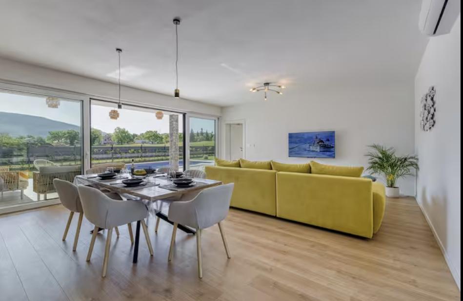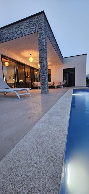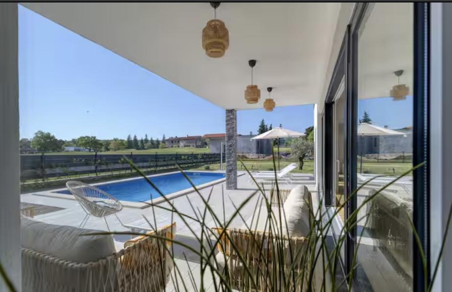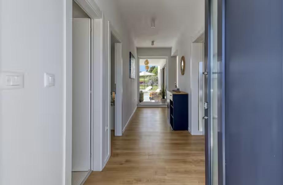 Villa Marina is located in the peaceful village of Blaškovići, located right next to the picturesque town of Kršan. This newly built modern single-storey house is an ideal place to escape the city bustle and relax in natural surroundings. Inside the house we find three spacious bedrooms, each with its own bathroom. Two bedrooms have direct access to the pool terrace. The spacious living room with dining area and kitchen is surrounded by a glass wall, providing plenty of daylight. The kitchen is equipped with all necessary appliances and utensils and is an ideal place to prepare delicious meals. The living room leads to a partially covered and uncovered pool terrace, and from the kitchen there is access to a second terrace, so that it is possible to use the space in the sun or in the shade, depending on the time of day and year. The terraces have comfortable furniture and deck chairs, as well as a barbecue, perfect for relaxing in the fresh air and preparing meals. Villa Marina has an excellent location, close to the towns of Pazin and Labin and the coast of Rabac.