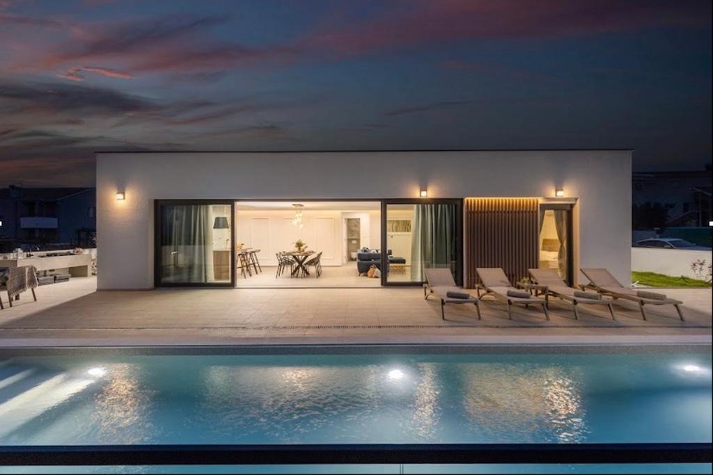 Villa Coralis is located in Vrsi, only 5 km from the royal city of Nin and 20 km from the city of Zadar. This modern beauty will attract guests who are looking for a luxurious and peaceful vacation, and who will enjoy sunbathing, swimming and relaxing together with their family or friends. Vrsi is a small tourist place that welcomes guests from all over the world with its modern and beautiful villas and its friendliness. You will enjoy walking along the long pebble beaches where you can enjoy the sun, clear sea and outdoor gym. Villa Coralis was built in a contemporary construction style in 2022, has 130 m2 of living space, 45 m2 is a large swimming pool, and the total area of the property is 450 m2. The villa is fully air-conditioned, and a maximum of 8 people can stay in it, while the optimal number is 6. The villa is a one-story house and you will be comfortably accommodated in 3 bedrooms with double beds that have en suite bathrooms with showers and an additional bathroom. It also includes a children's playground, table tennis, and PS4.