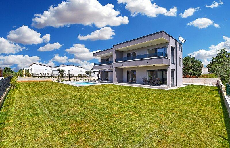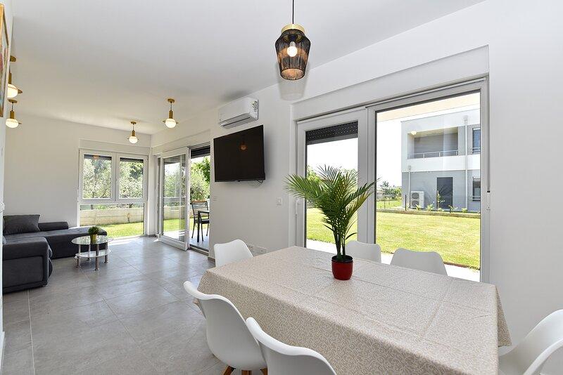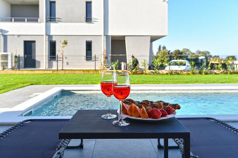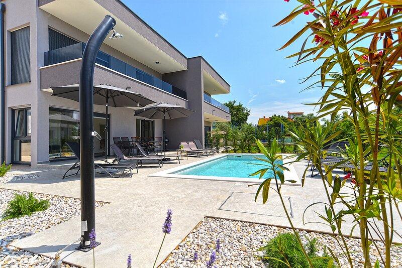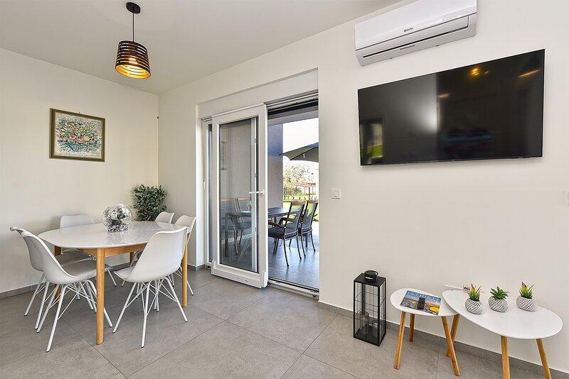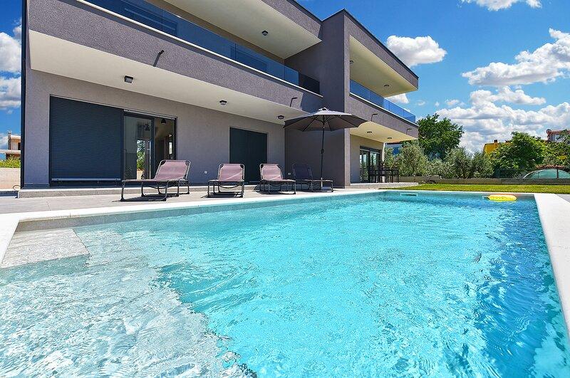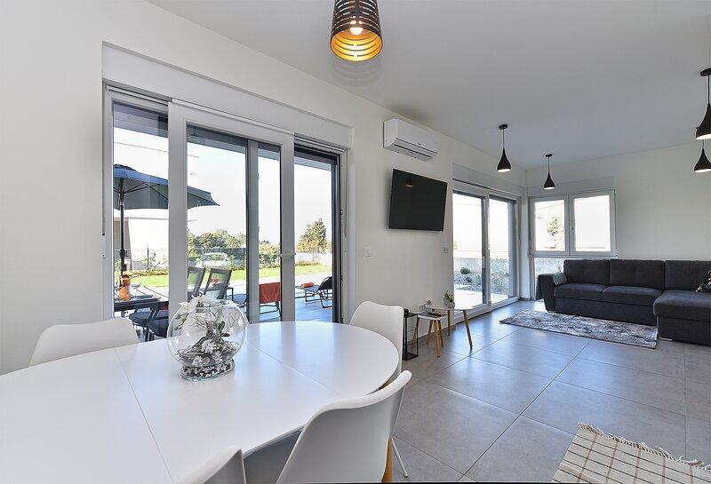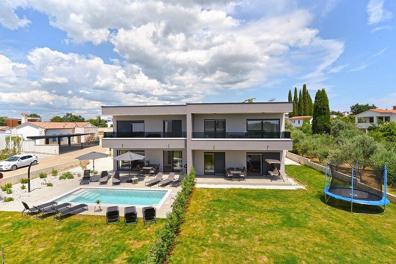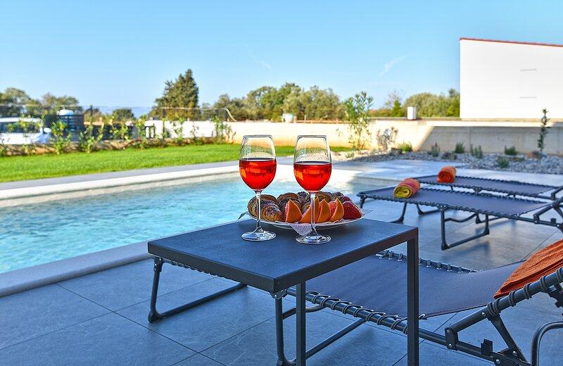 Villa Lippa with sea views welcomes you in the peaceful village of Peroj, near Pula and the Brijuni National Park. This modernly designed villa is perfect for a relaxing family holiday. The outdoor area is ideal for refreshing yourself on the covered terrace and enjoying the heated pool during the summer and pre-season. The villa offers comfortable accommodation for up to 12 people in 4 bedrooms. Villa Lippa Peroj welcomes you with a platter of Istrian meat delicacies and freshly grilled fish - see the additional pictures category. Villa Lippa in Peroj, near Pula and the enchanting Brijuni National Park, is a modern and beautifully designed villa that provides the perfect setting for a relaxing family holiday with a beautiful view of the Adriatic Sea. Comfort and style for the whole family Villa Lippa has been designed to provide maximum comfort and relaxation for up to 12 guests. With a contemporary design and carefully selected amenities, it is ideal for families or groups of friends who want to enjoy a peaceful environment.